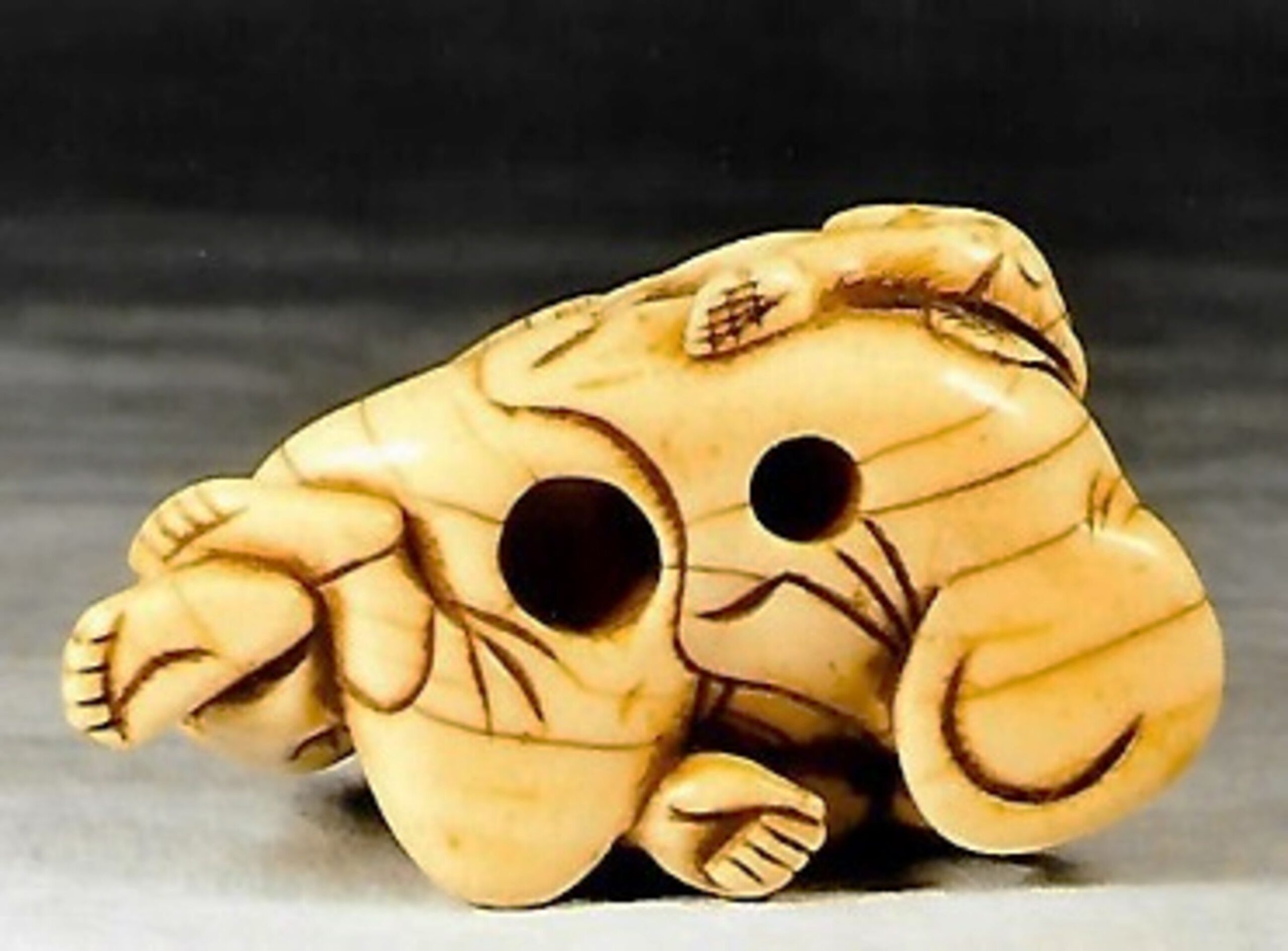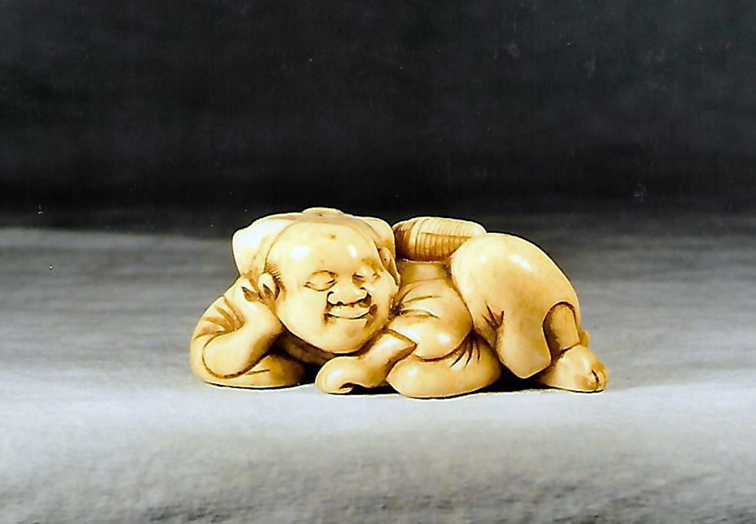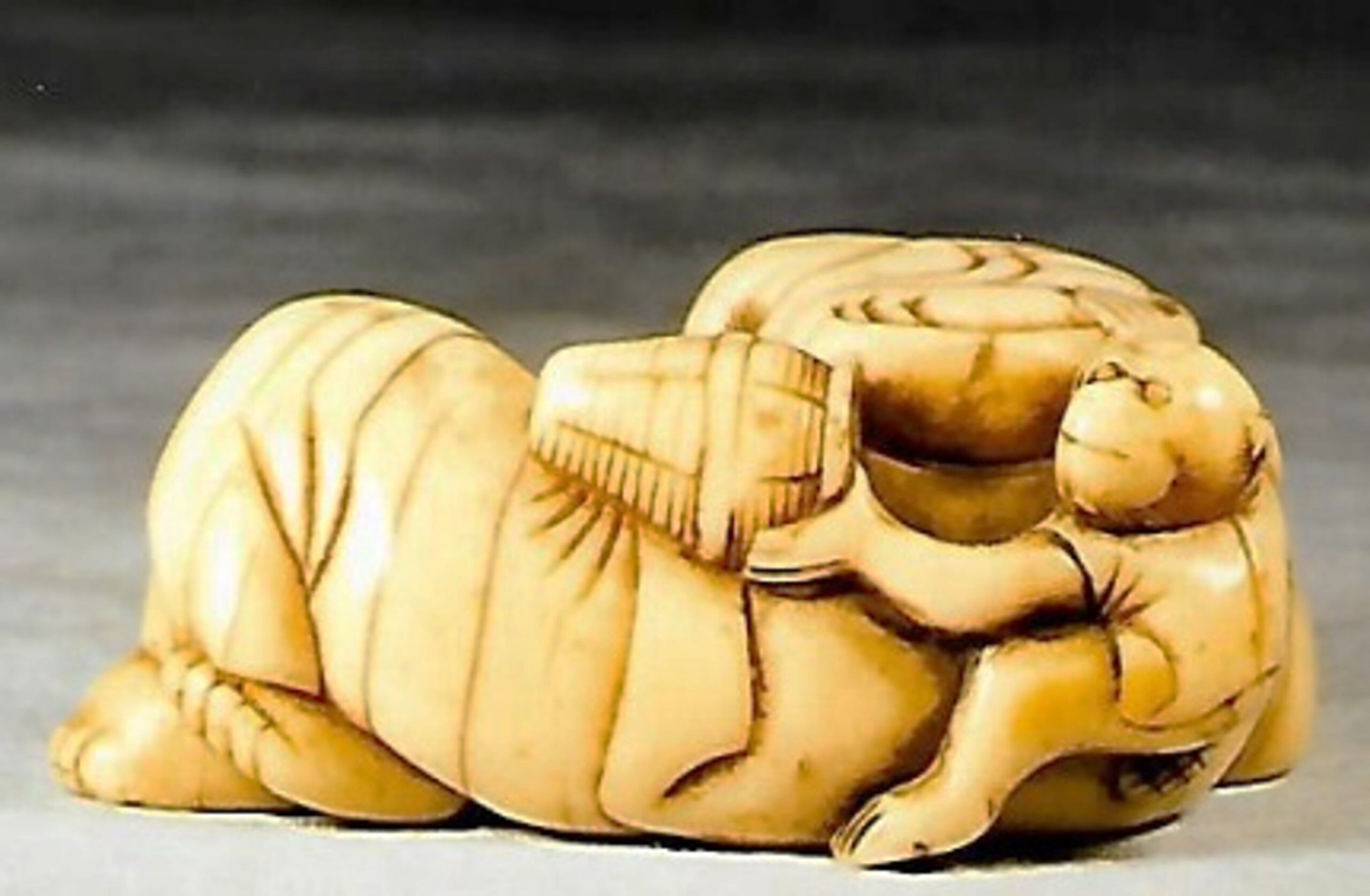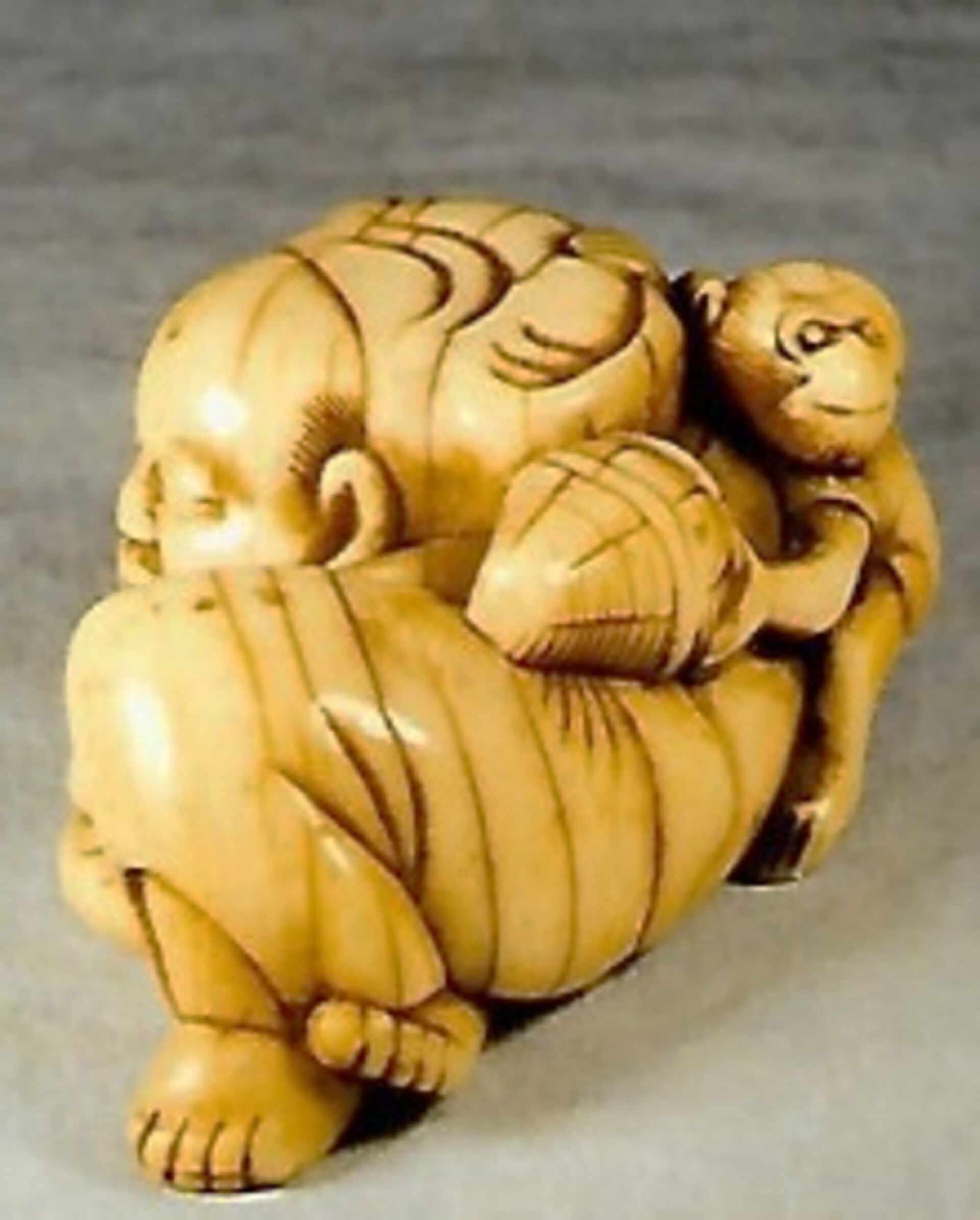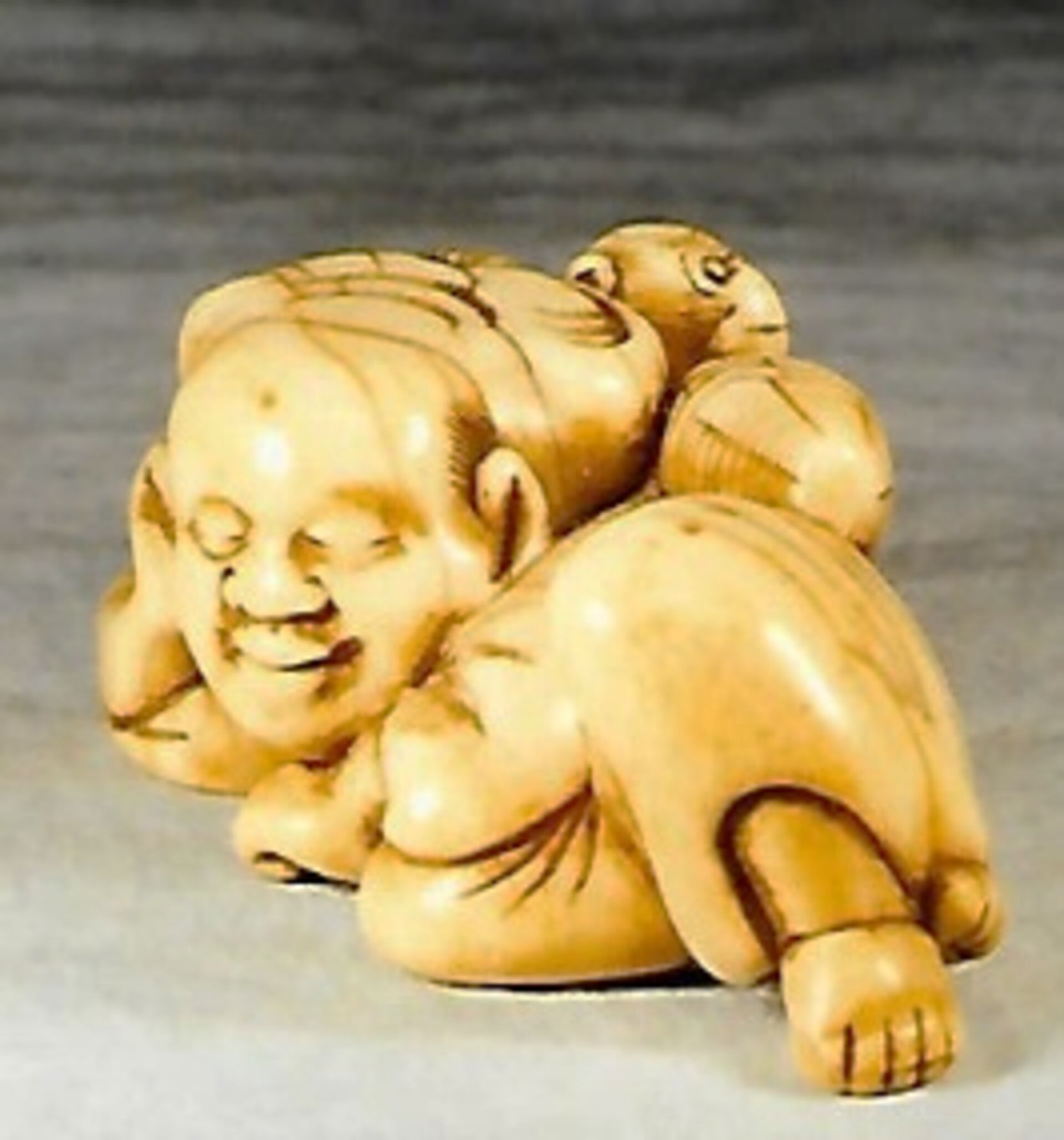 Elfenbein-Katabori. Der Affenschausteller liegt mit überkreuzten Beinen und schläft friedlich, auf seine rechte Hand gestützt, während sein Äffchen sich hinter seinem Rücken an dem Lebensmittelkorb zu schaffen macht. – Gut abgegriffenes altes Stück mit schöner Glanzpatina und Alterssprüngen. Länge 52mm, Alter ca. um 1800, vielleicht sogar früher. Unterseitig zwei unterschiedlich grosse, gut gebohrte Himotoshi. Nicht signiert.