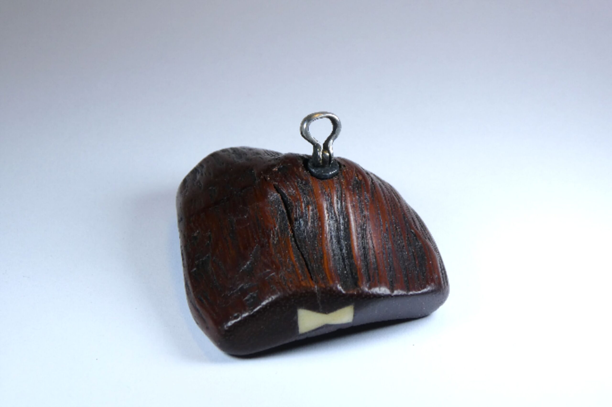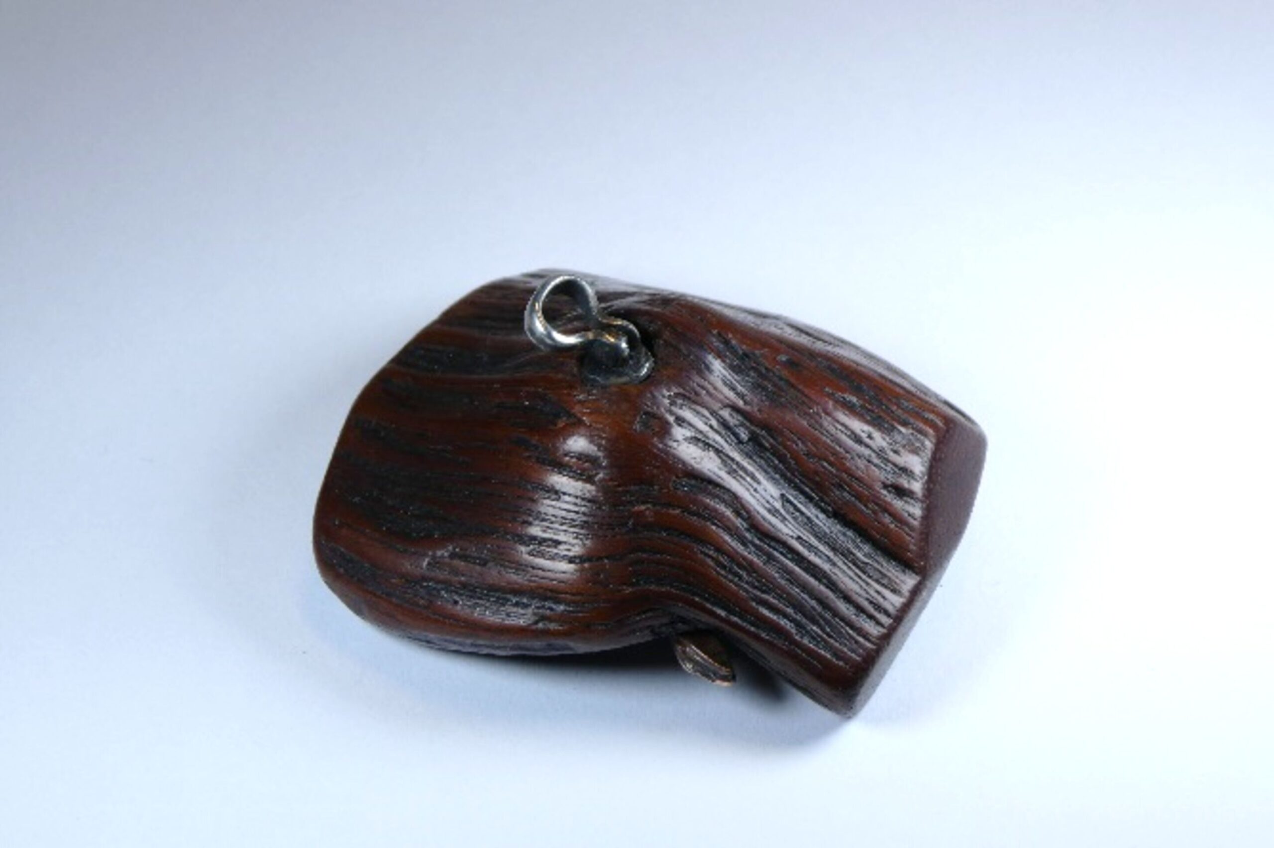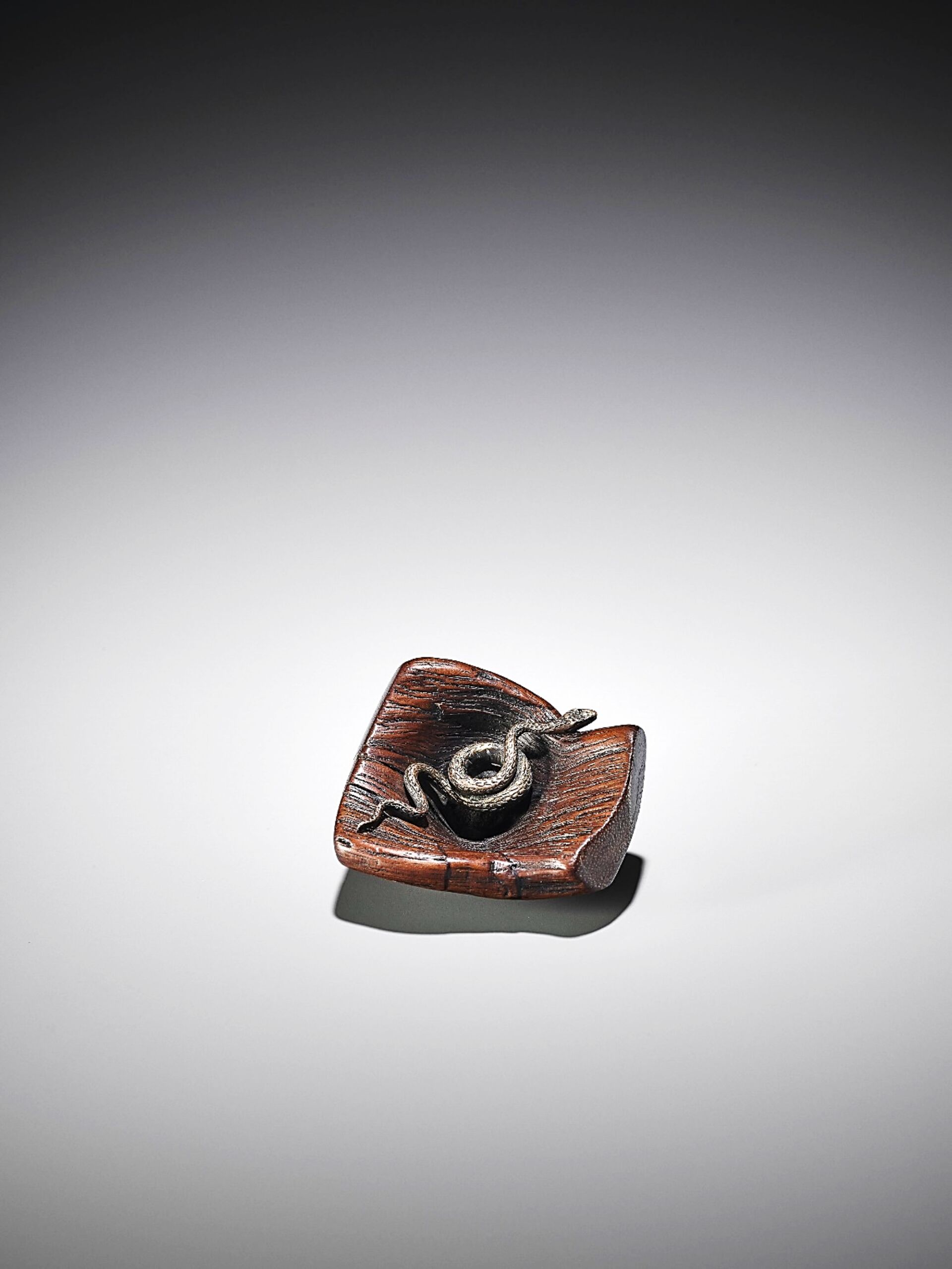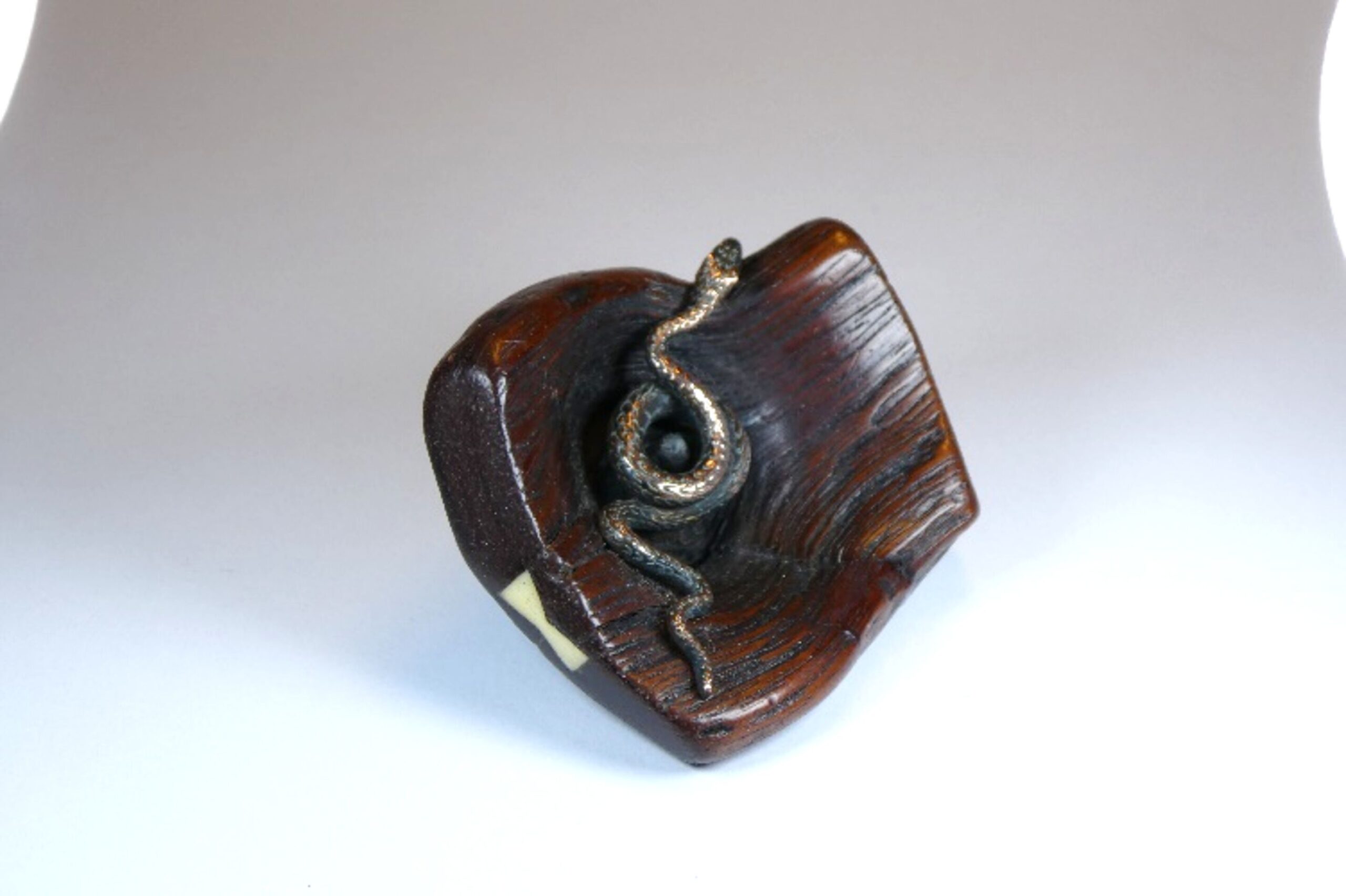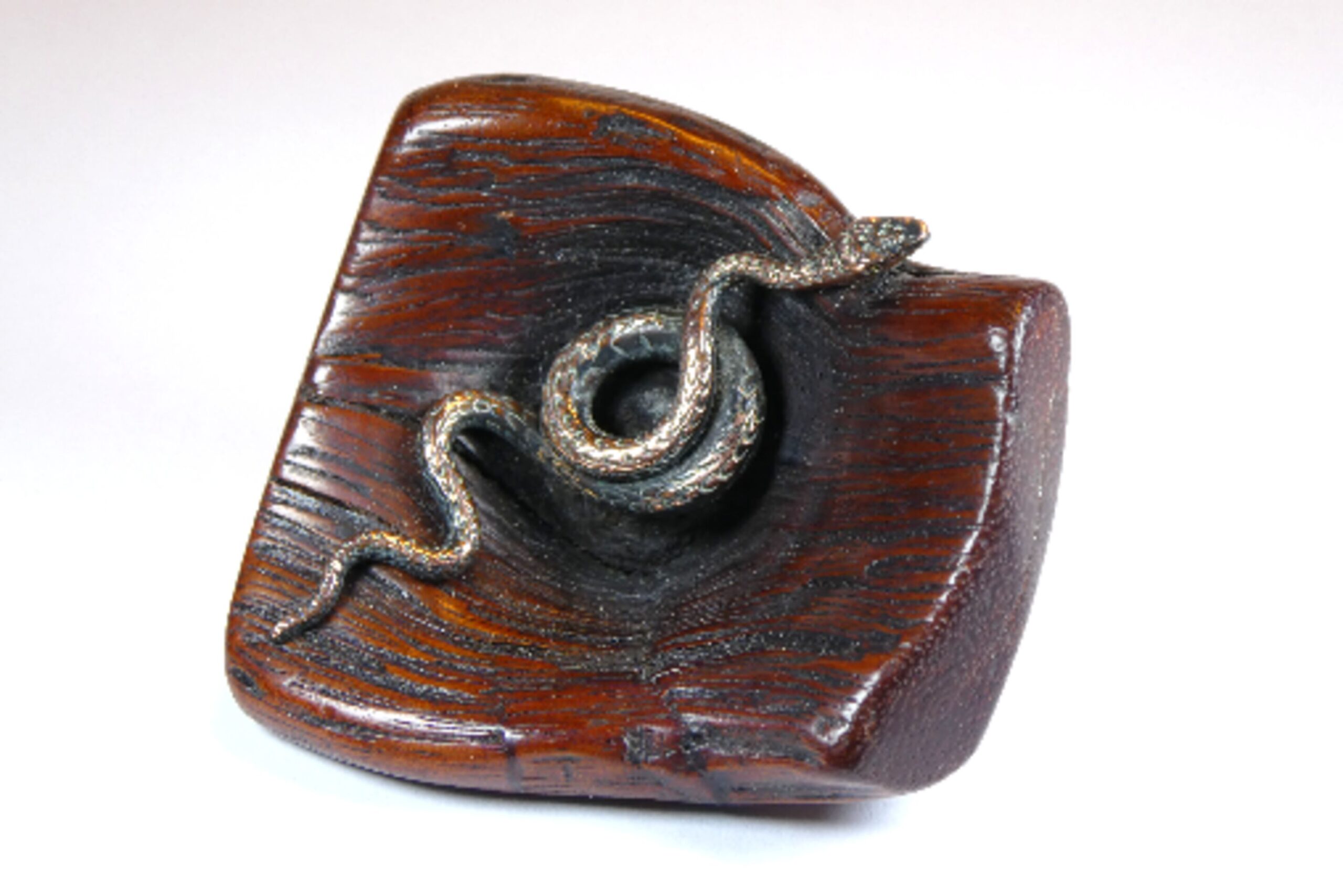 Kupfer auf Holz-Ukibori. Die geringelte und geschlängelte Schlange aus Kupfer mit goldenen Augen liegt auf einem stark gemaserten Stück Treibholz. Ein Riss im Holz ist seitlich durch eine schmetterlingförmige Einlage aus Elfenbein zusammengehalten. Vom Leib der Schlange geht ein Stift durch das Holz, an dessen unterem Ende sich eine Öse befindet, die als Himotoshi dient. Grösste Ausdehnung 54mm, Alter: 19.Jh., nicht signiert, eine sehr saubere, ansprechende Arbeit.