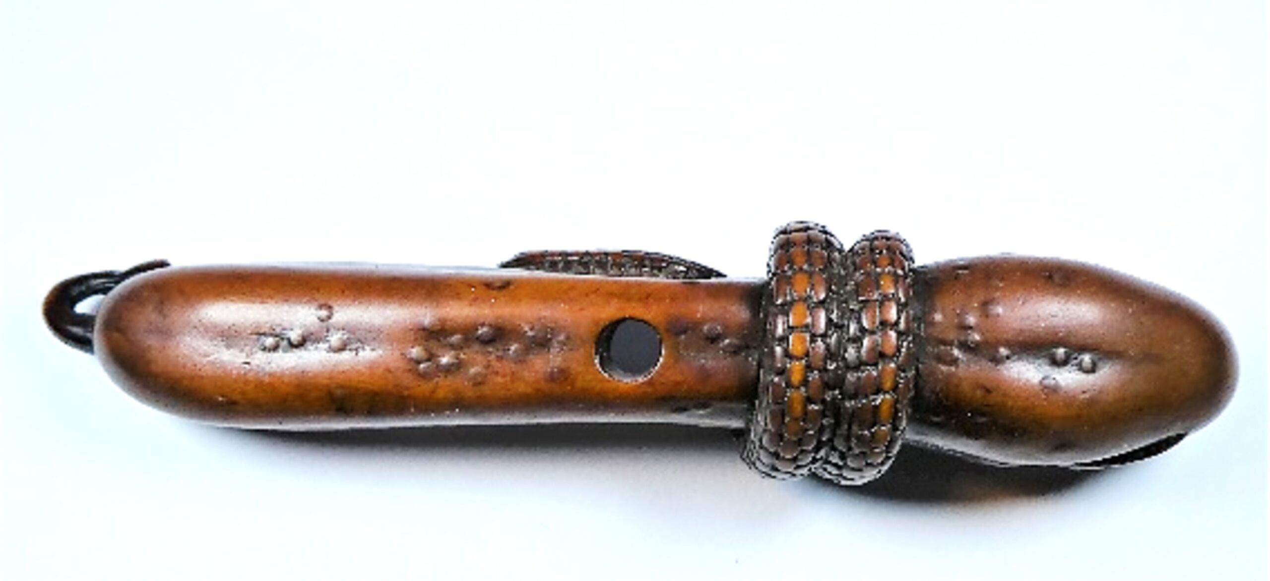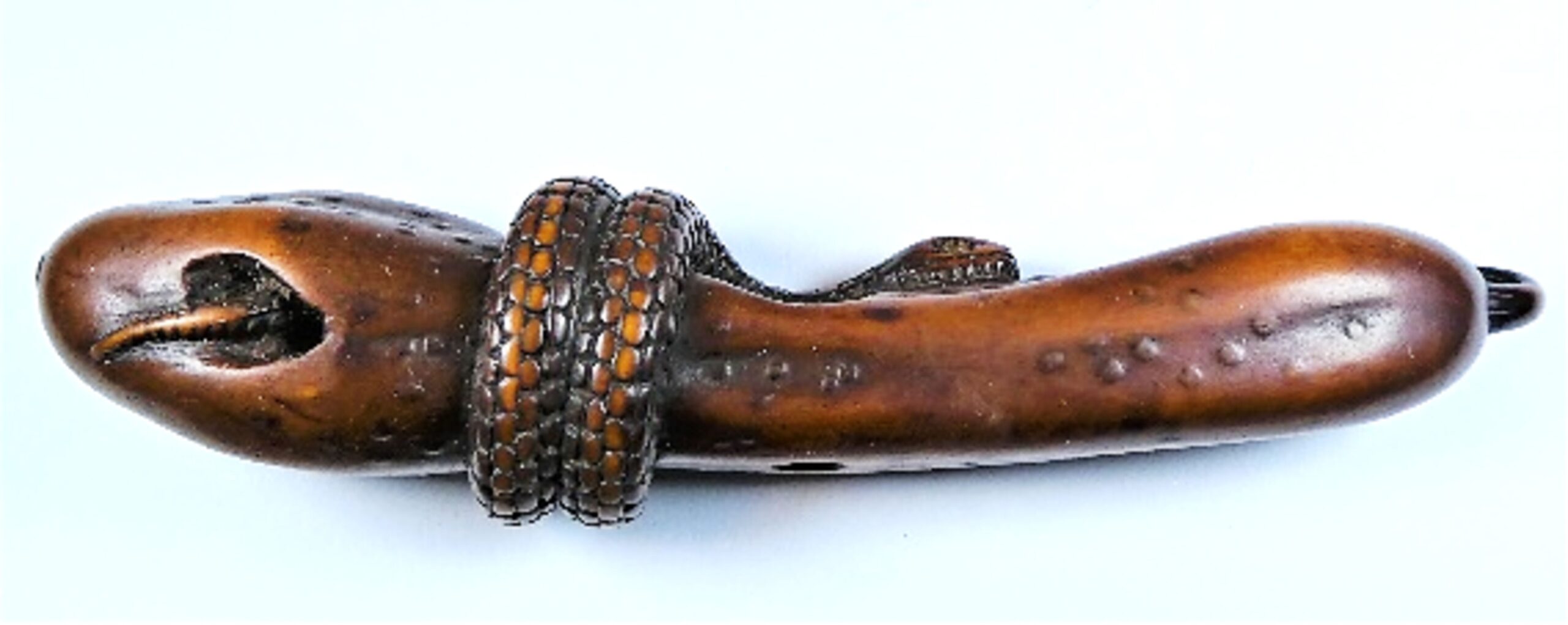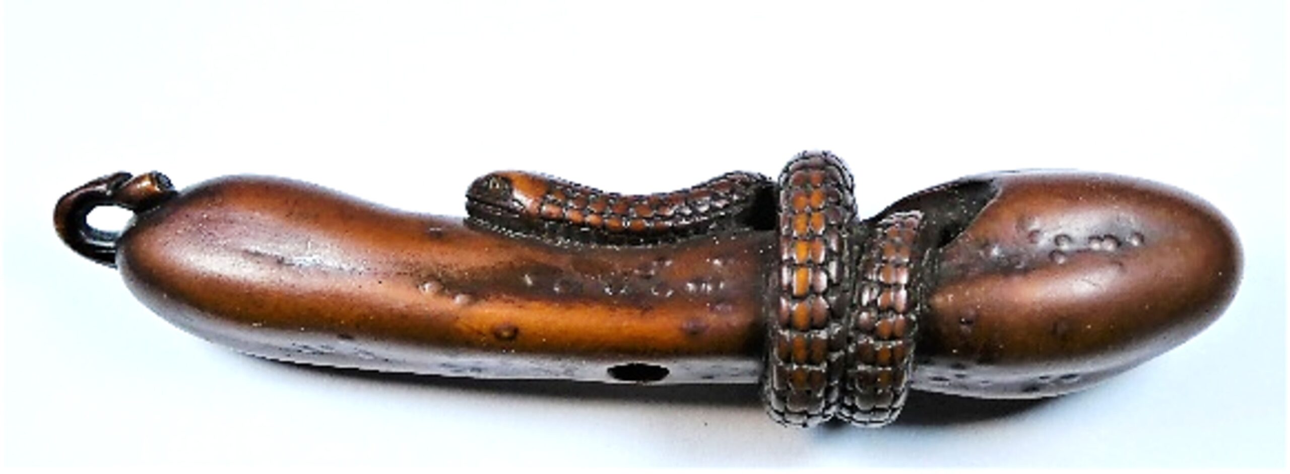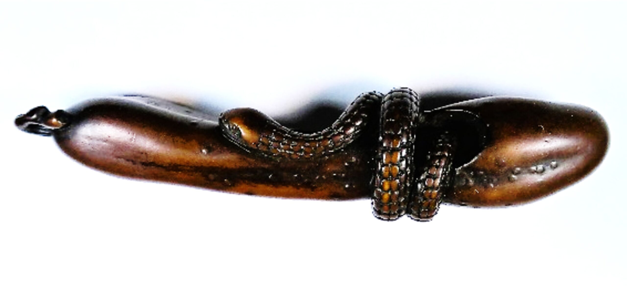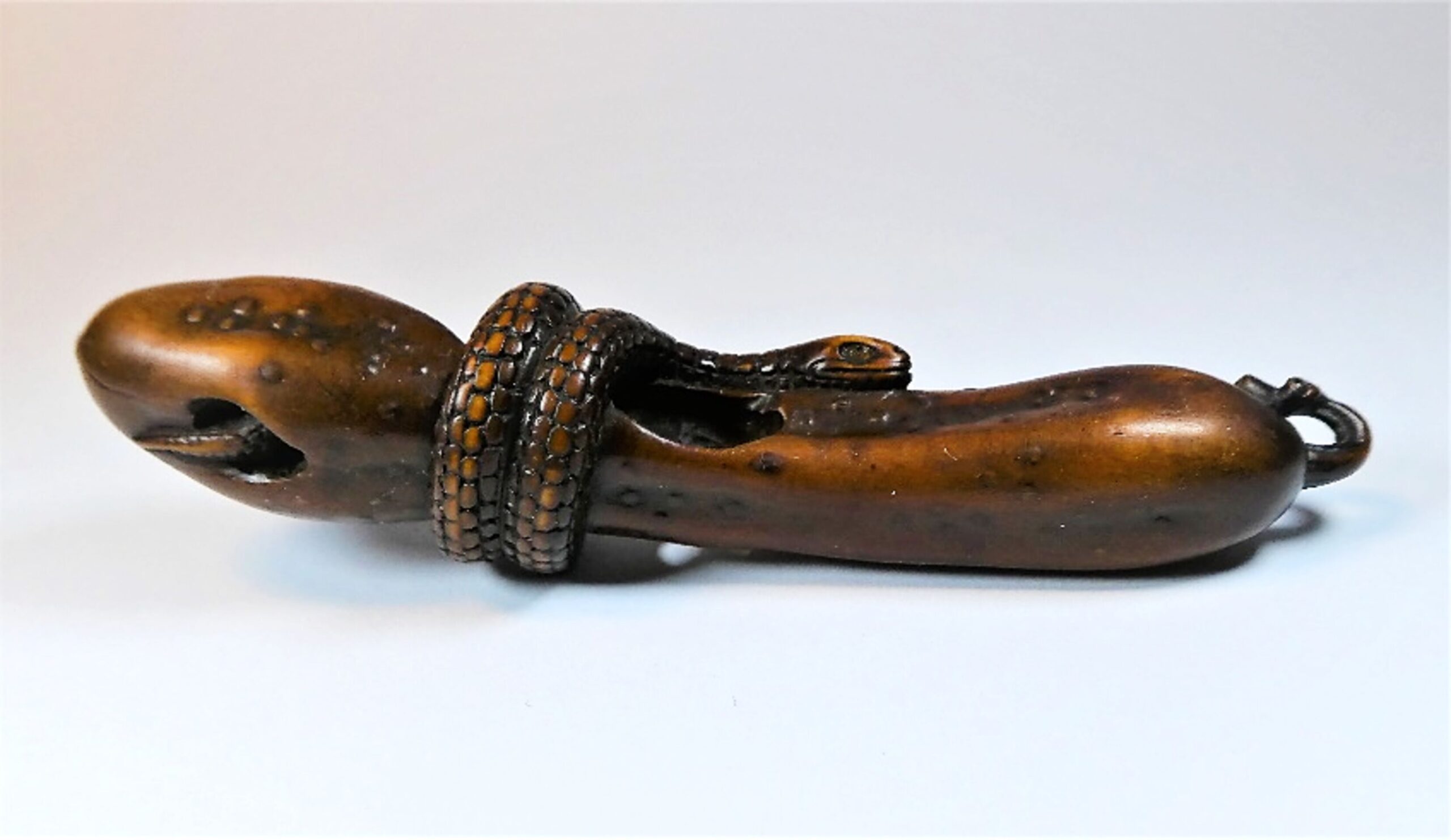 Holz-Katabori. Eine Schlange windet sich um einen langen, schmalen, bereits teilweise verrotteten Kürbis und umrundet ihn zweimal. Der Schwanz der Schlange verschwindet in einem Loch des Kürbis und kommt an anderer Stelle wieder hervor. Die Augen des Tieres sind in hellem Horn eingelegt, die Schuppen sind sorgfältig und klar ausgearbeitet. Die Höcker und Warzen der Kürbisoberfläche sind in Ukibori-Technik gemacht. Mitten durch den Kürbis führt ein zentrales Himotoshi. Nicht signiert. Länge 96mm, Alter: vermutlich 1. Hälfte 19.Jh., der Einsatz der Ukibori-Technik lässt eine Herkunft aus der Region Nagoya vermuten.