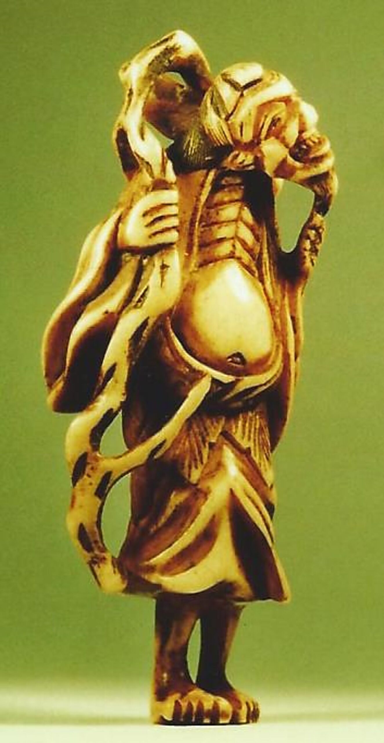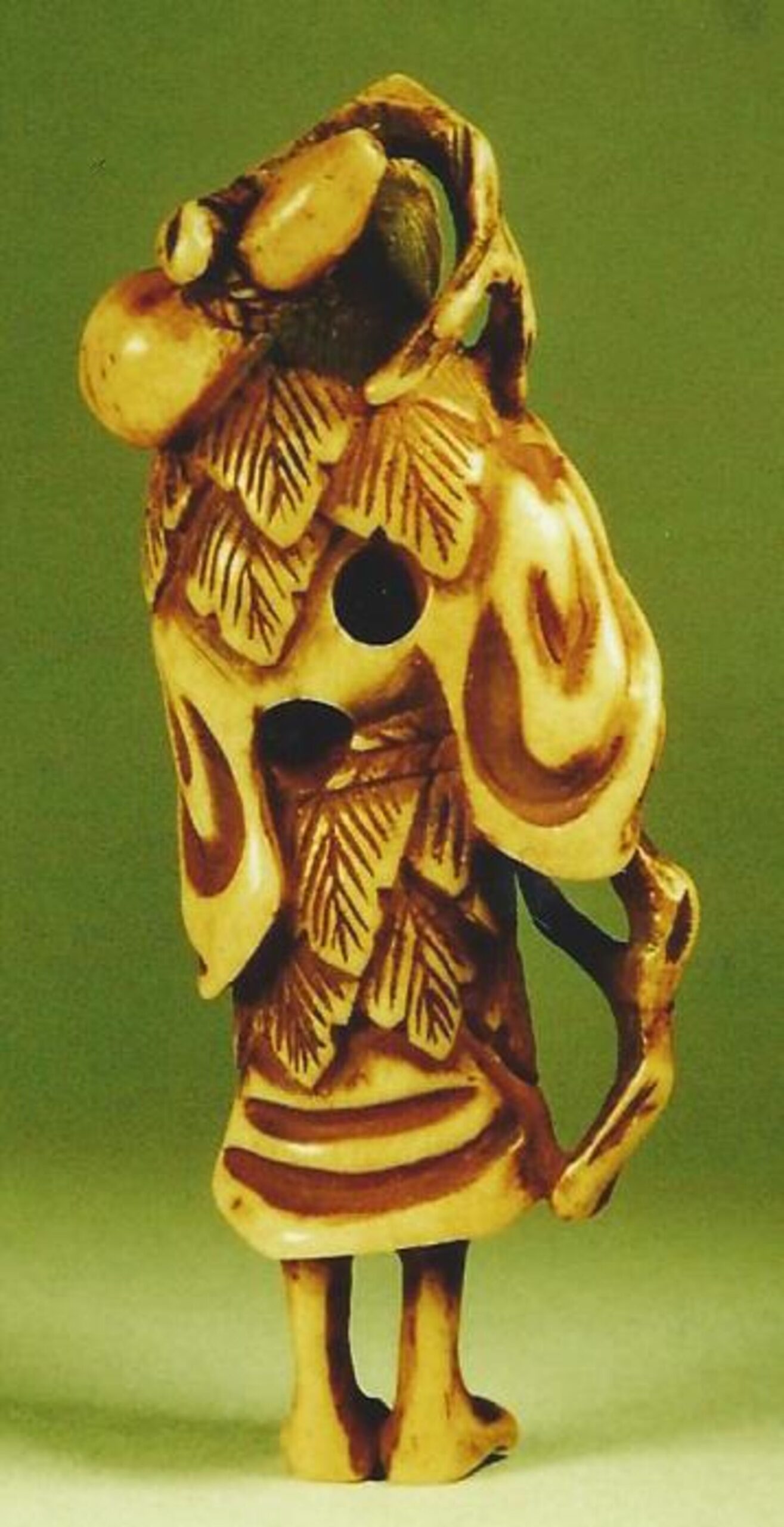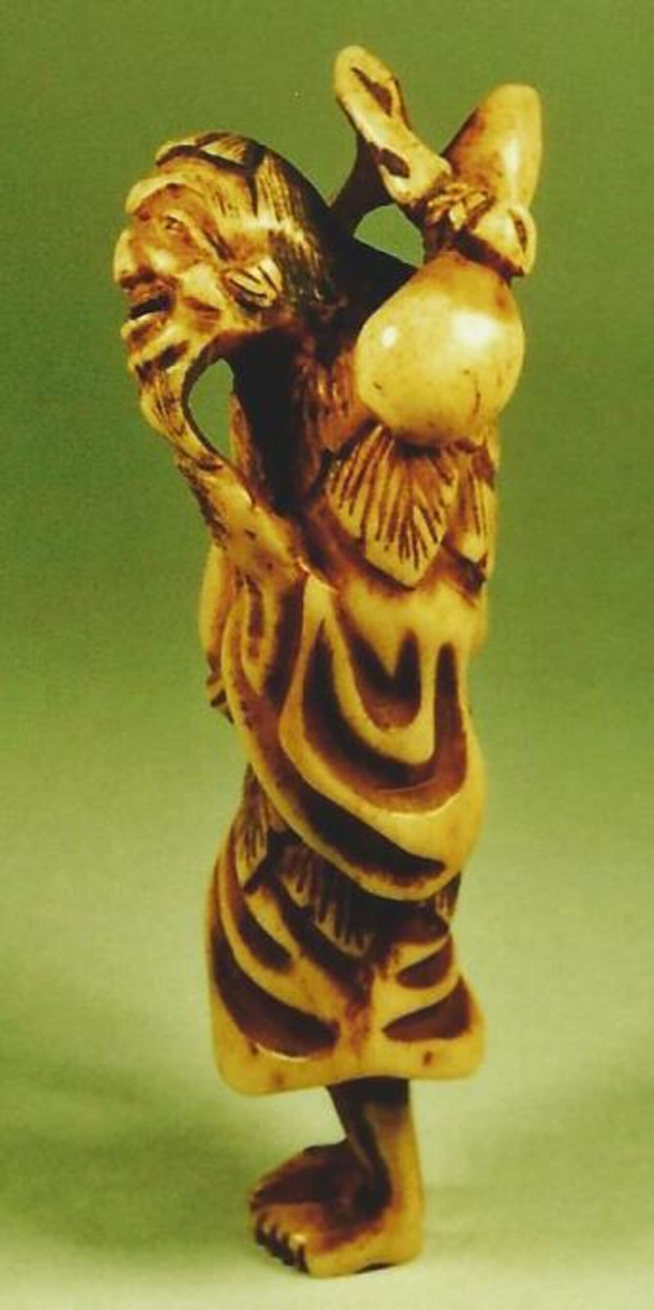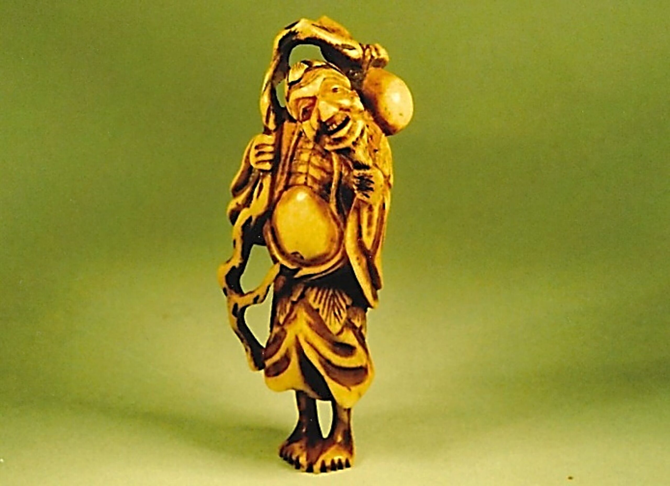 Hirschhorn-Katabori. Der Bergeinsiedler, kenntlich an dem Blattkragen und -rock aus Artemisia, steht bescheiden freundlich auf schmalen Beinchen da. Der Kopf ist lachend nach rechts geneigt. Man sieht die Rippen und das kugelförmig vorgewölbte Bäuchlein. Das Gewand ist faltig und mit einem Seil gegürtet. In der Rechten hält der heilige Mann einen knorrigen, weitab vorn Körper gearbeiteten Stock, der sich über den Nacken schlingt und an dem mit einer Schnur befestigt, die Flasche aus einem doppelt gebauchten Kürbis Hiötan hängt. Dass sich in dem Kürbis sein Zauberpferd befindet, weiss man aus der Ikonographie. Im Rücken zwei gut gebohrte Himotoshi. Höhe 66mm, Alter: ca.1800, nicht signiert. Technische Einzelheiten: im Nacken sieht man schwarz die Spongiosa. Der Kopf ist vermutlich angesetzt. Die Beine sind unten anstelle der Spongiosa wie ein Stöpsel eingefügt. Diese Einzelheiten sind sehr geschickt gearbeitet, man sieht sie nur bei sehr genauer Betrachtung. Gute Glanzpatina, an den prominenten Stellen Tragespuren.
