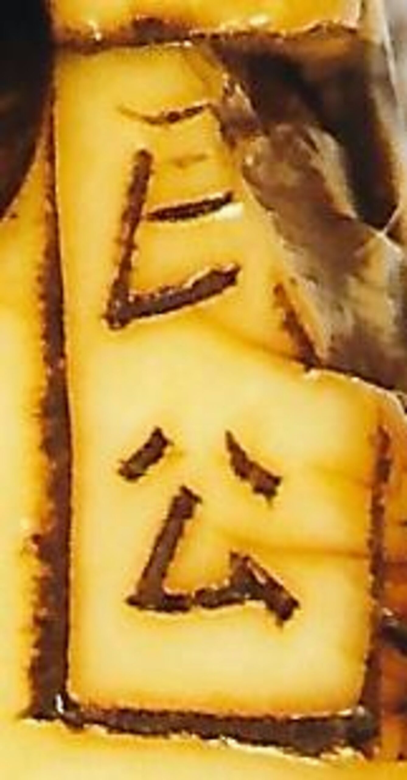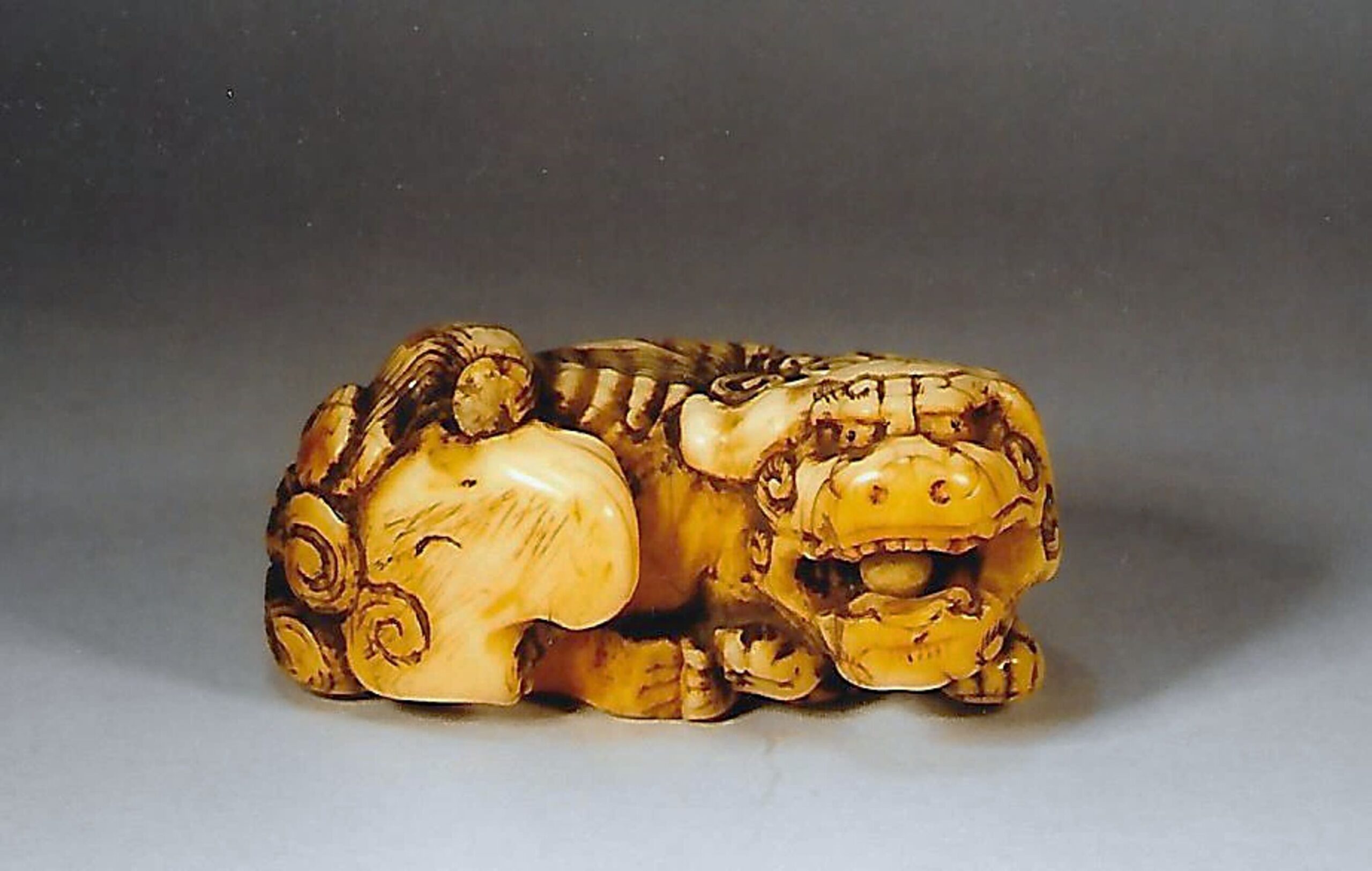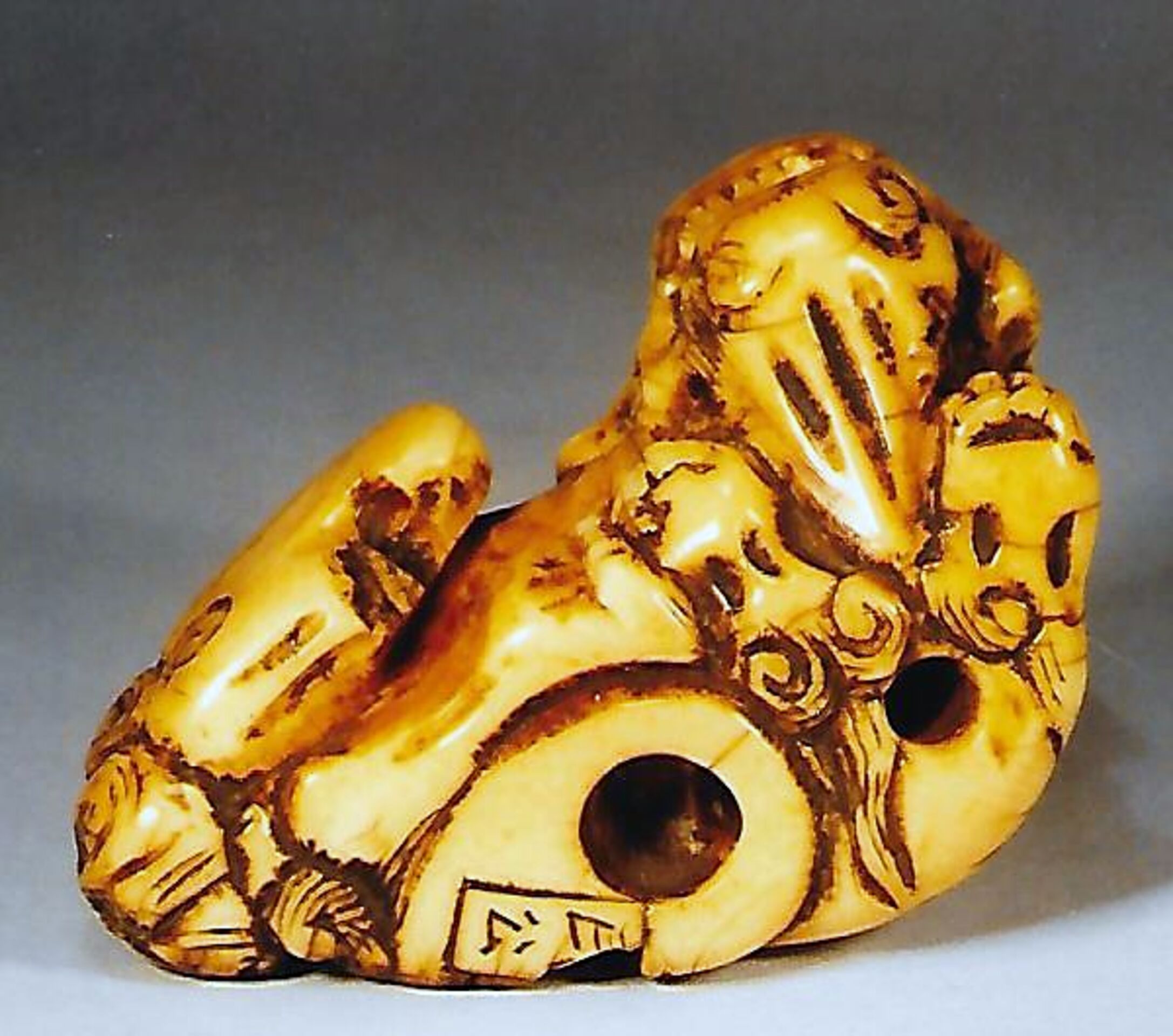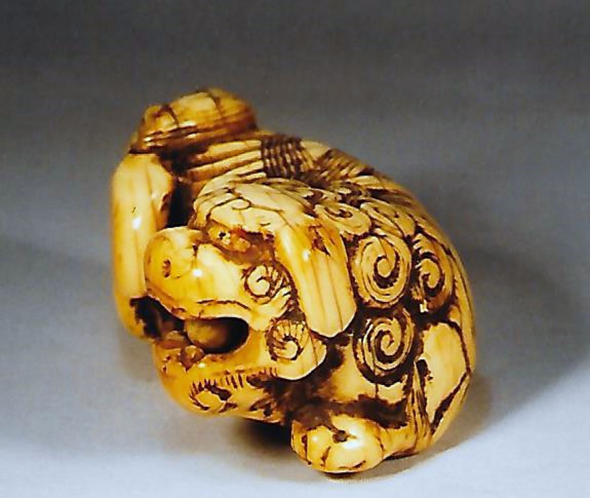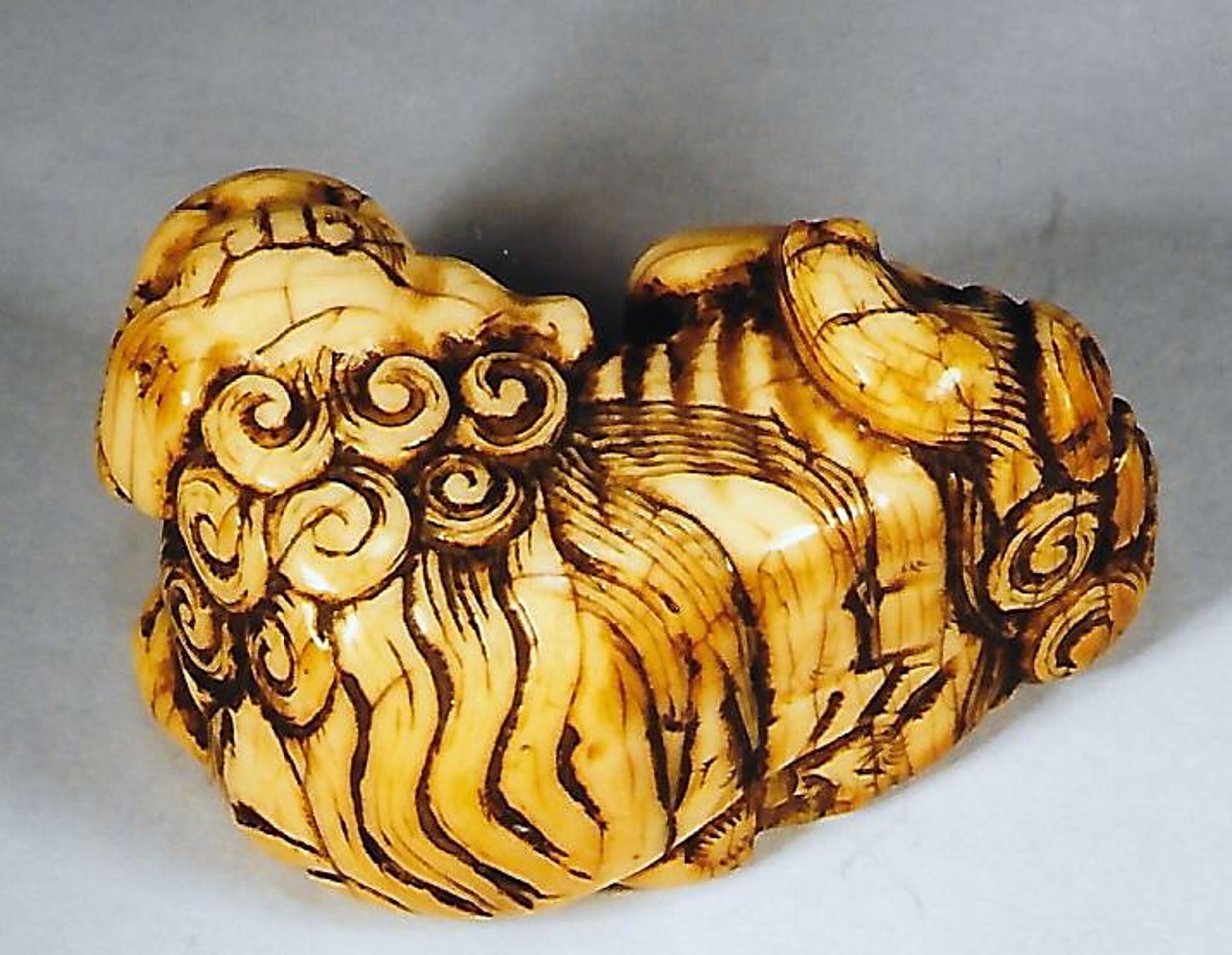 Elfenbein-Kaiabort, vermutlich 18.Jh. Der Löwenhund und Tempelwächter im lockigen Fellkleid mit prominenten Rippen liegt grimmig und doch nicht ganz ernst m nehmend da, Kopf und Körper nach rechts gewendet, sodass das Stück als ganze dreieckig wirkt, im offenen Maul eine kleine Kugel. Das rechte Ohr ist ein Flugohr, das linke ein Schlappohr. Etliche Alterssprünge. Schöne goldbraune Patina. Länge 46mm. Unterseitig zwei unterschiedlich grosse, gut gebohrte Himotoshi. Dort auch die aus zwei Zeichen bestehende Signatur. Das erste Zeichen, das nur unvollständig m sehen ist, könnte K249: Ryô, Naga, Yoshi, Ra oder K272: Naga, Cho sein, das zweite ist K171: Kimi, Ko (Lord). Zusammen kann ich daraus keine bekannte Signatur machen.