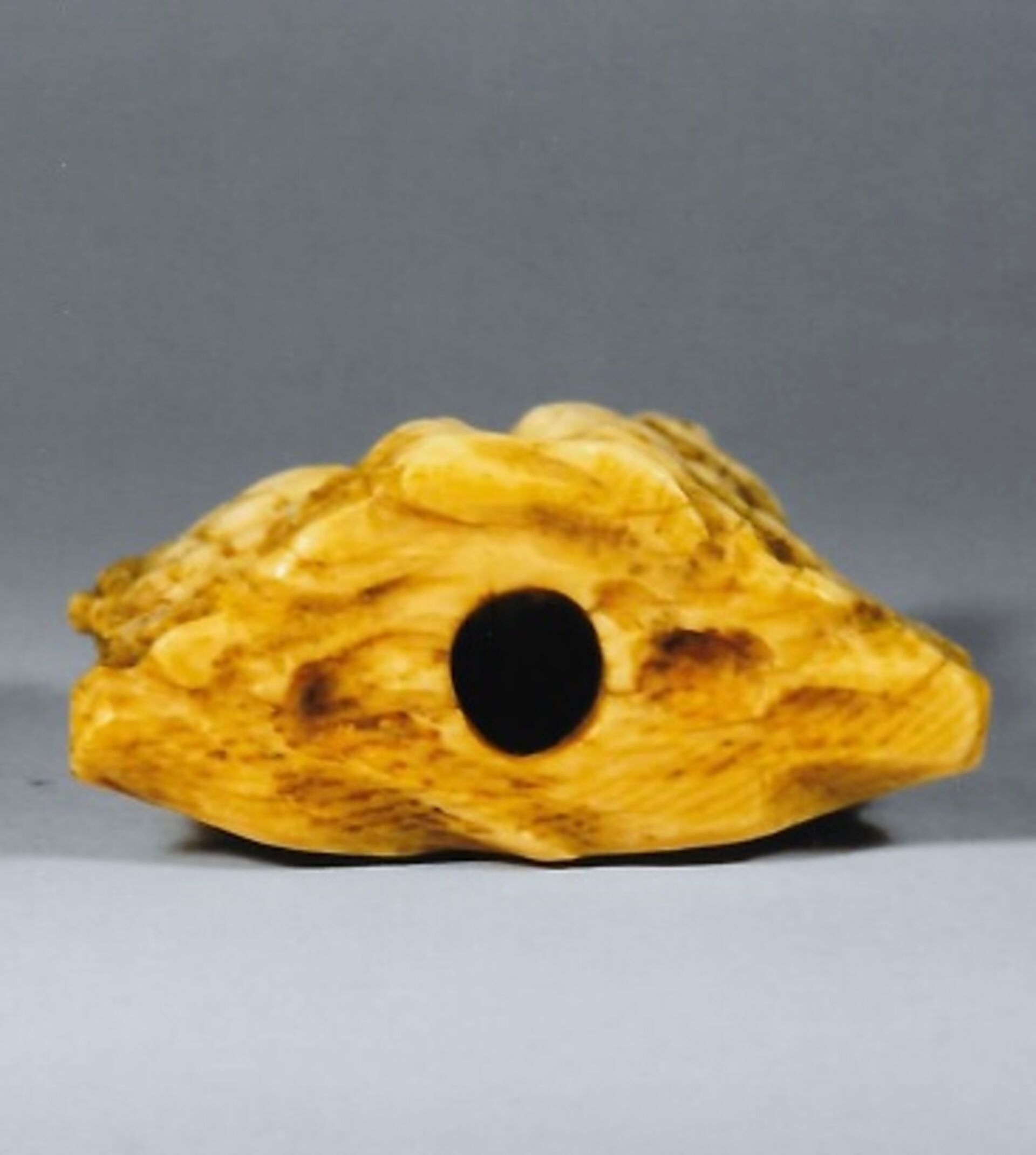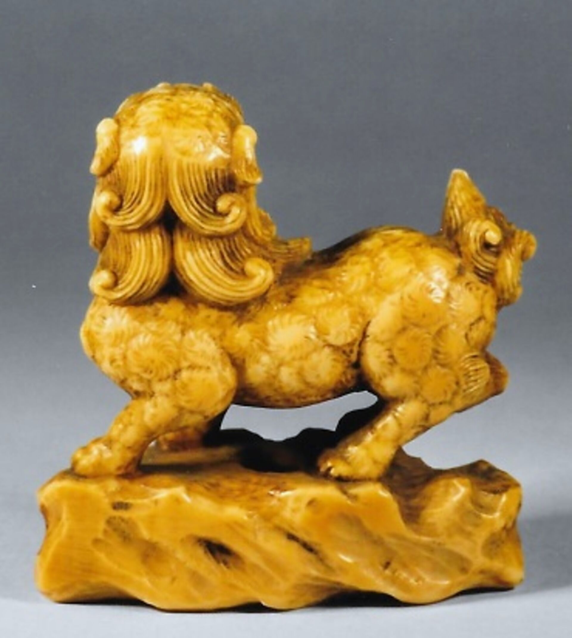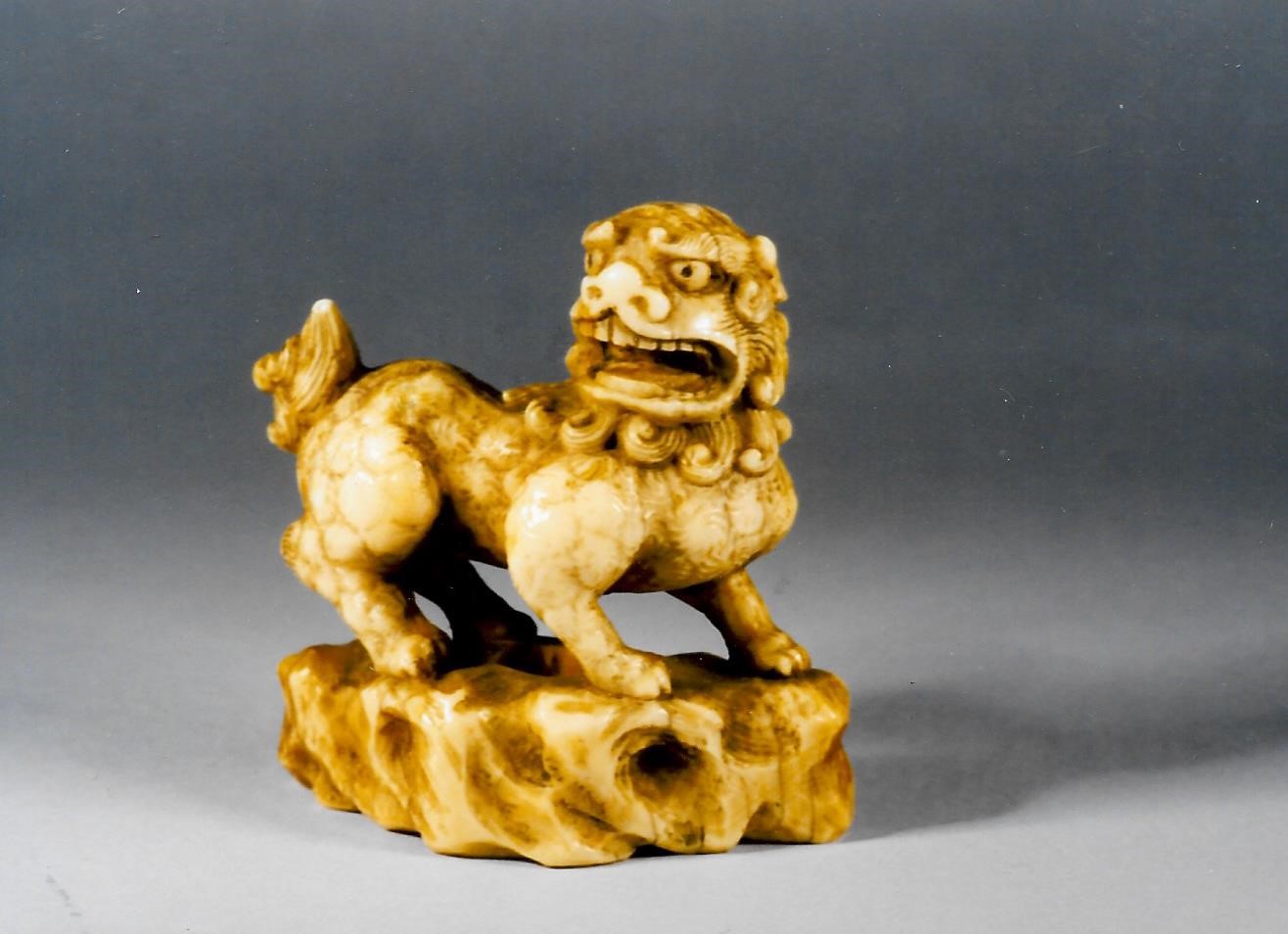 SHISHI AUF FELSIGER BASIS Grimmiger Lowenhund in Wachterpose. Elfenbein Katabori. Schon ausgearbei—tetes Fell and Haarkleid. Auf der Schauseite heller als auf der Hinterseite. HOhe 4,3 cm. Durch die Basis ein grosses Himotoshi. Alter: ca. M.19.Jh.-2.H. 19.Jh. Dreieckiger Grundriss.Randstuck v.d.Basis eines Elefantenzahnes.