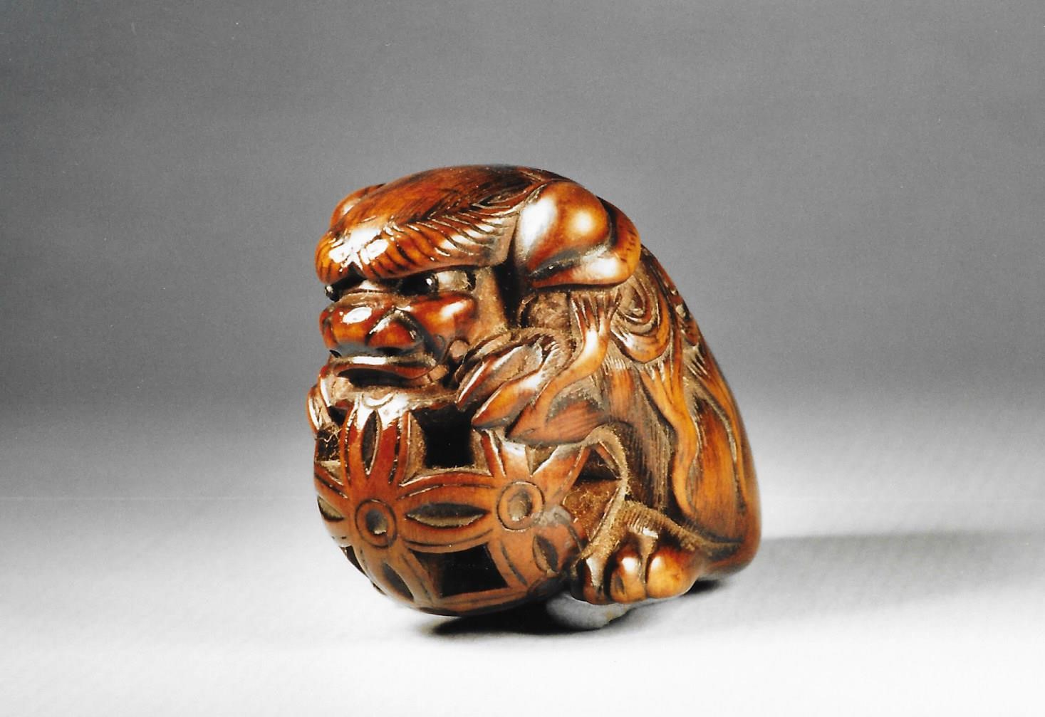 Holz-Katabori, darstellend einen grimmig-ratlosen Löwenbund Shishi. der kauernd unter seinem Maul und mit den Vorderpranken einen durchbrochenen Brokatball festhält. Die Augenbrauen sind wulstig vorgewölbt. Vom Rücken fallen zu beiden Seiten die lockigen und eingedrehten Haartressen, das Schwänzchen ist mehrfach eingerollt. In dem Ball befindet sich ein frei bewegliches Kügelchen. Auf der Unterseite auf einer Holzplakette die Signatur GYOKKO. Höhe 31 mm, Länge 43 mm. Das Holz hat eine gute Patina.