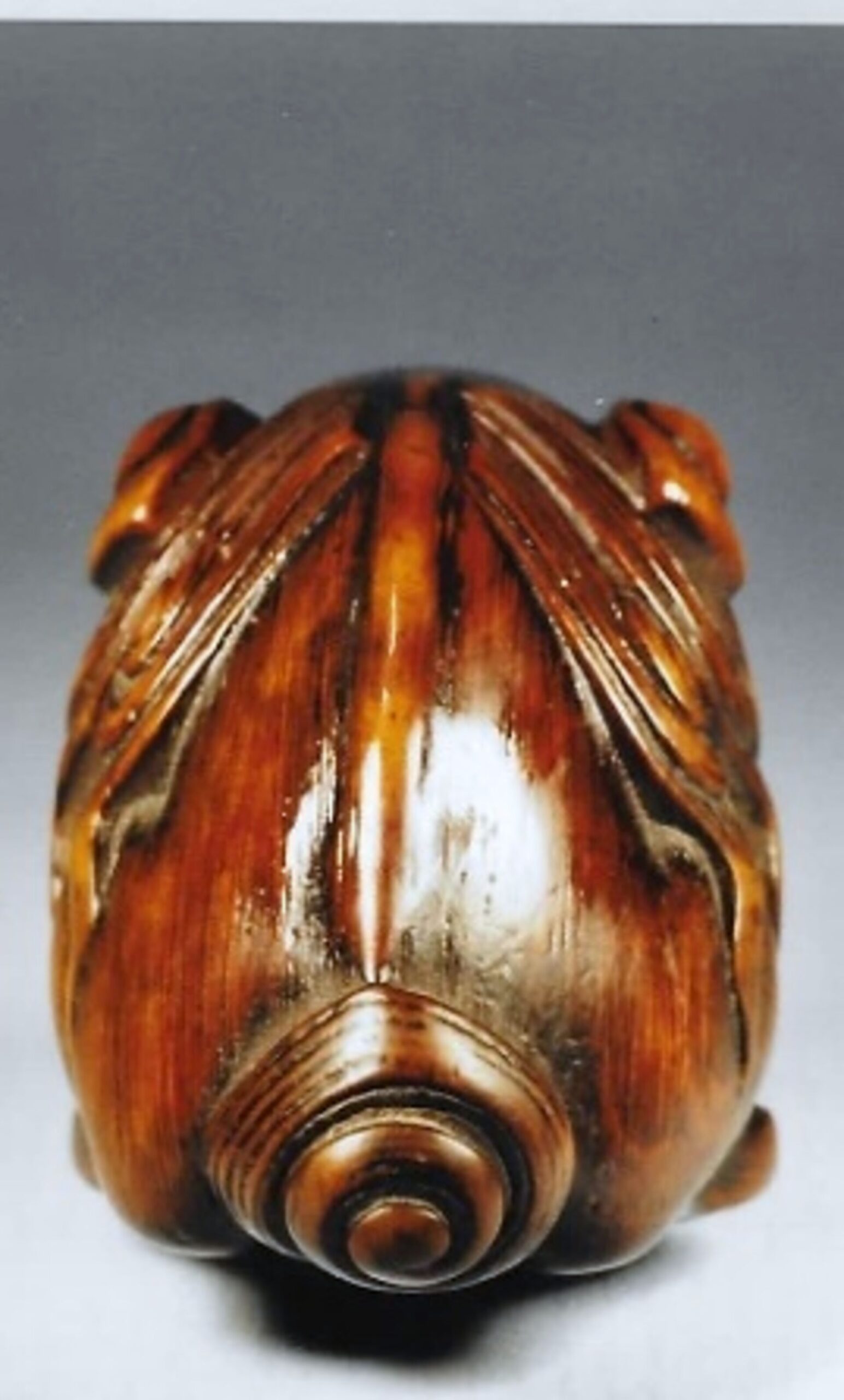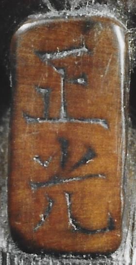 Hier scheint sich ein Irrtum eingeschlichen zu haben: Die Signatur liest sich nicht Gyokko, sondern korrekt MASAMITSU (UR 604). Dieser kam aus Takeda, Echigo, und war ein Schüler von Masayoshi lshikura, der ihn auch adoptierte. Masamitsu kehrte später in seine Herkunftsfamilie zurück und starb 1909 im Alter von 73 Jahren. Lazamick MCI führt 7 Schnitzer dieses Namens auf, unserer ist seine No.4. — Diese Netsuke ist übrigens bereits in dem Verkaufskatalog von Zacke vom März/April 1995 unter Nr. 154-11 dort mit dem richtigen Namen aufgeführt.