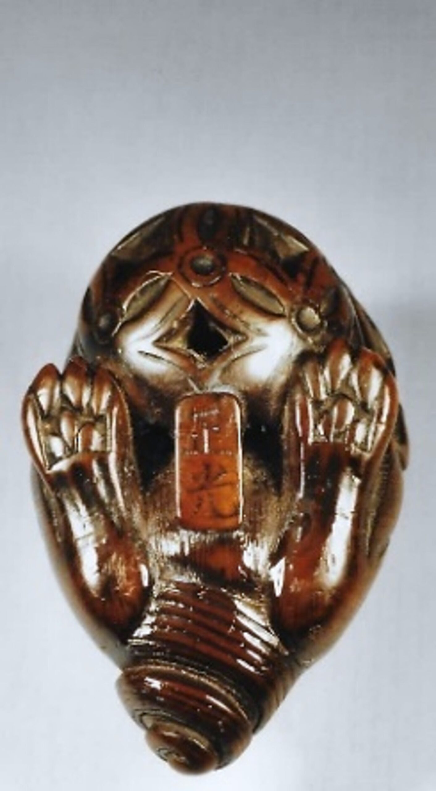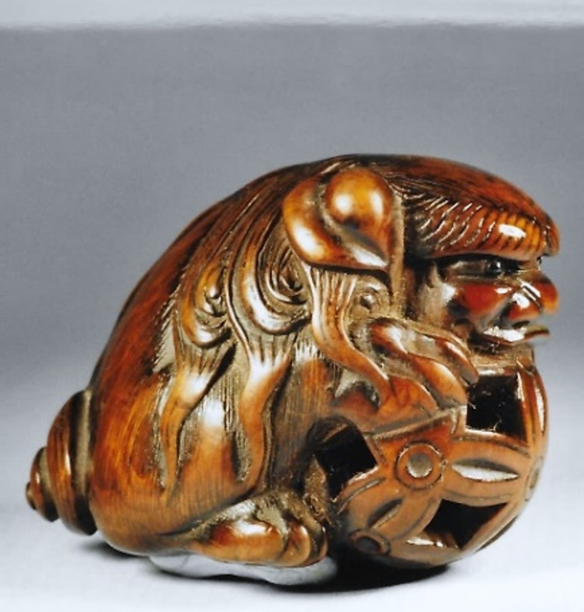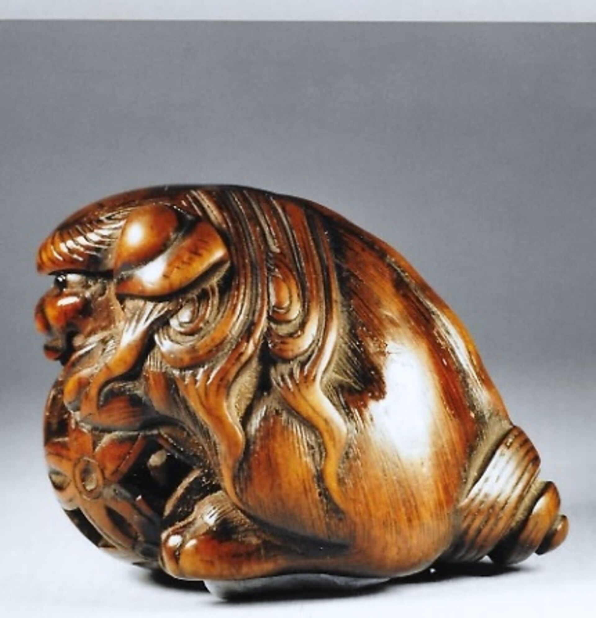 Herkunft: Auktion Zacke, Wien, 15.12.2001, Lot 78, dort geschätzt ATS 14’000 — 18’000. Geschenk meiner Mutter zu meinem 58. Geburtstag am 1.5.2002. GYOKKO oder GYOKKOSAI (nach Angaben von Ueda und Davey) schnitzte in Edo (T6ky8). Er gehörte zur Schule von Gyokkei. Wird datiert ca. 1830-1867, Ueda schreibt (p.224, No.134): „Was extremely proficient at carving Netsuke representing human beings. animals and masks.”
