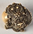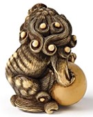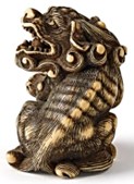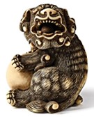 Elfenbein Katabori. Der Löwenhund Shishi sitzt aufgerichtet und umfasst mit allen vier Pfoten das Glücksjuwel Tama. Sein Fellkleid ist lockig mit zahlreichen sehr sauber gearbeiteten Voluten. Der Kopf ist nach oben links gewendet. Der Ausdruck ist aufgeregt, vielleicht ein wenig heiter. Die Pupillen sind mit dunklem Horn eingelegt. Das Maul ist weit offen mit sichtbaren Zähnen, darin rollt eine frei bewegliche Kugel. Höhe 48mm, ein «natürliches» Himotoshi zwischen Körper und rechter Vorderpfote, auf der Unterseite der Kugel in einer ovalen Reserve die Signatur GARAKU, , (K247, K474). Alter: ca. 1.Hälfte 19.Jh., perfekter Erhaltungszustand.