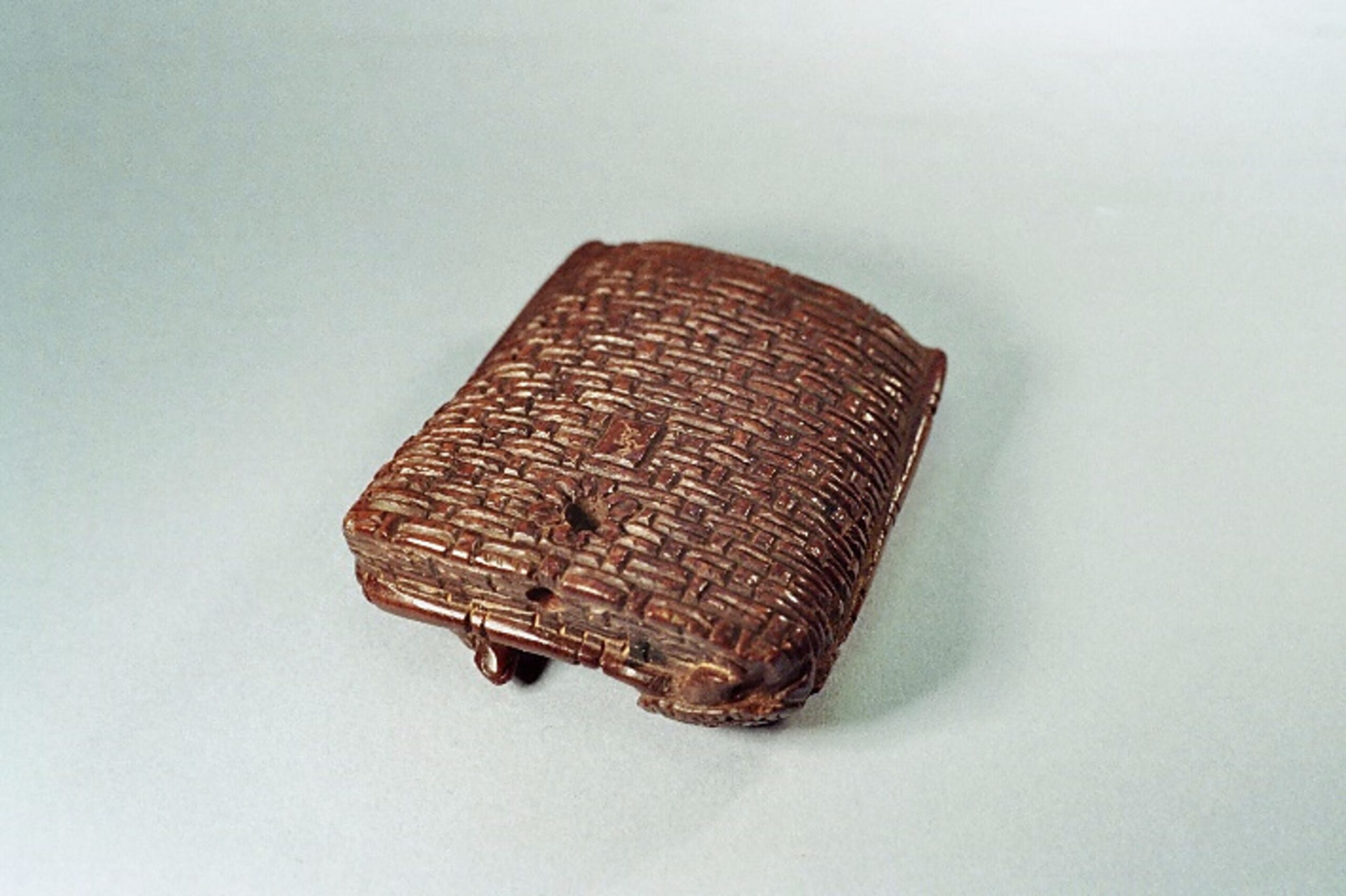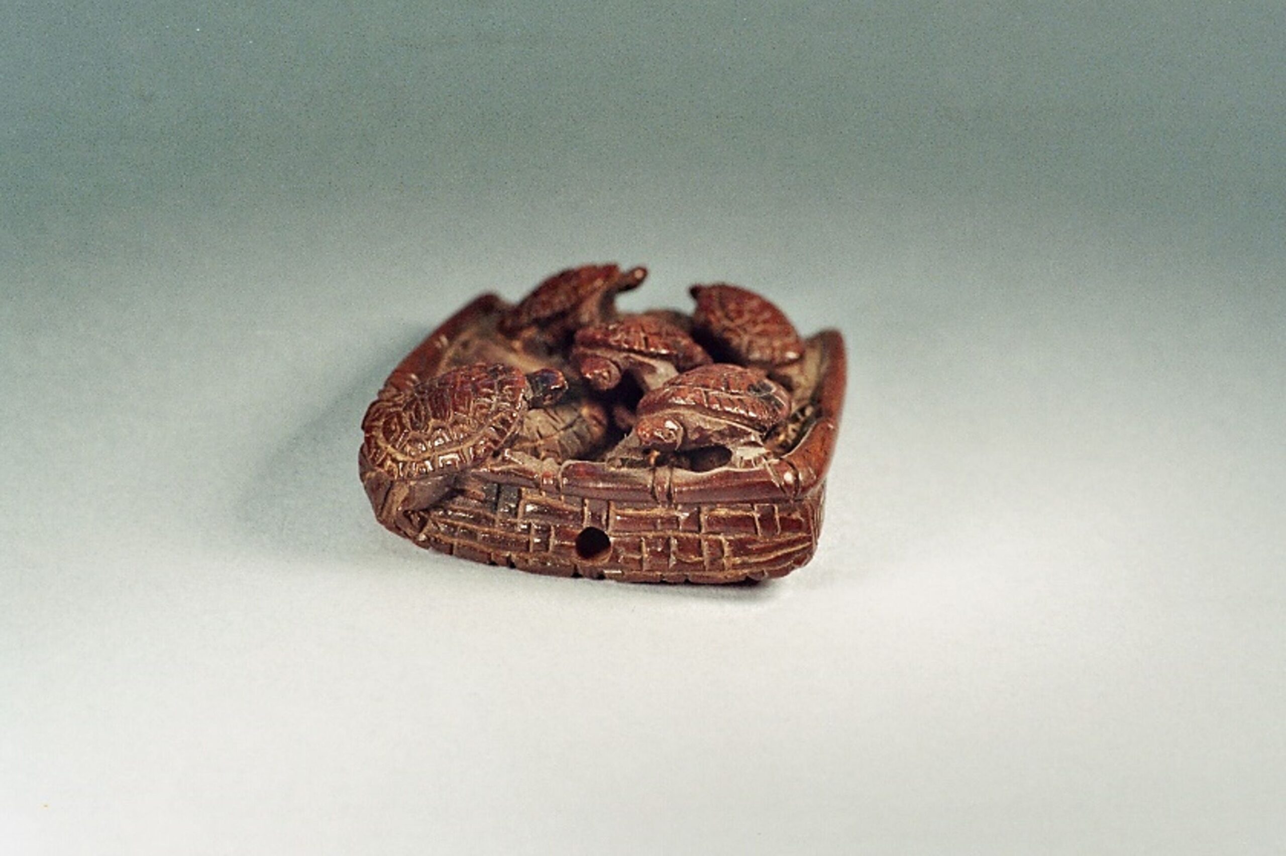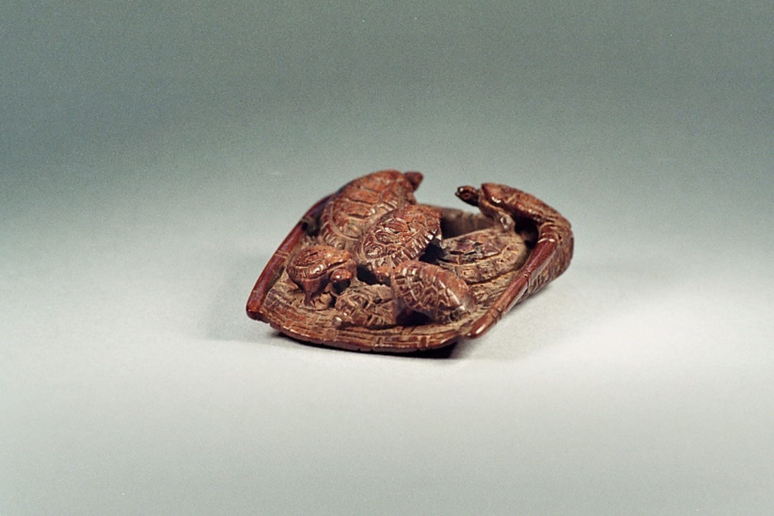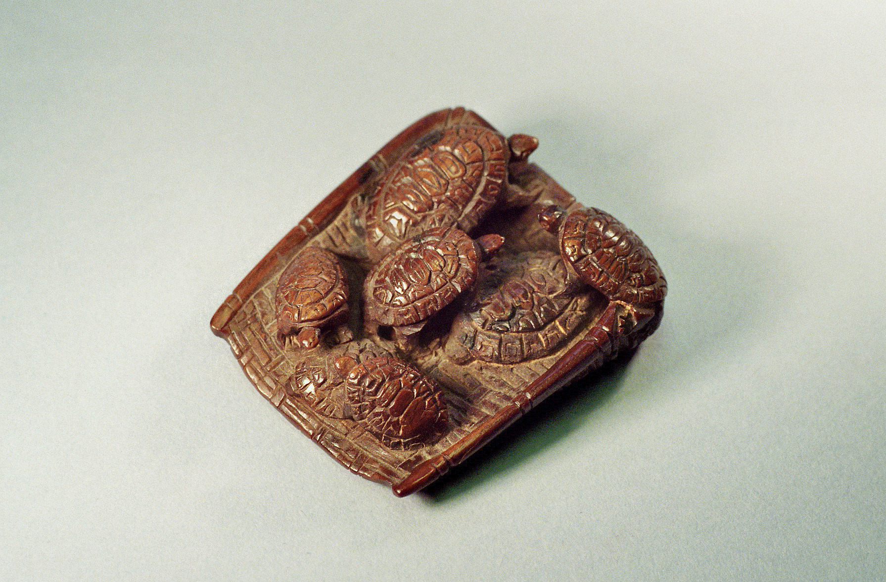 Holz-Katabori, Fruchtholz? Schöne Darstellung der sieben Tiere und des Geflechts der Schippe. Unterseitig rosettiertes Himotoshi, das andere führt durch den aufgestellten Teil der Schippe. Unterseitig, auch in einer viereckigen, etwas erhabenen Reserve die Signatur: TADATOMO. Länge 45mm, Alter: vermutl. spätes 19.Jh.