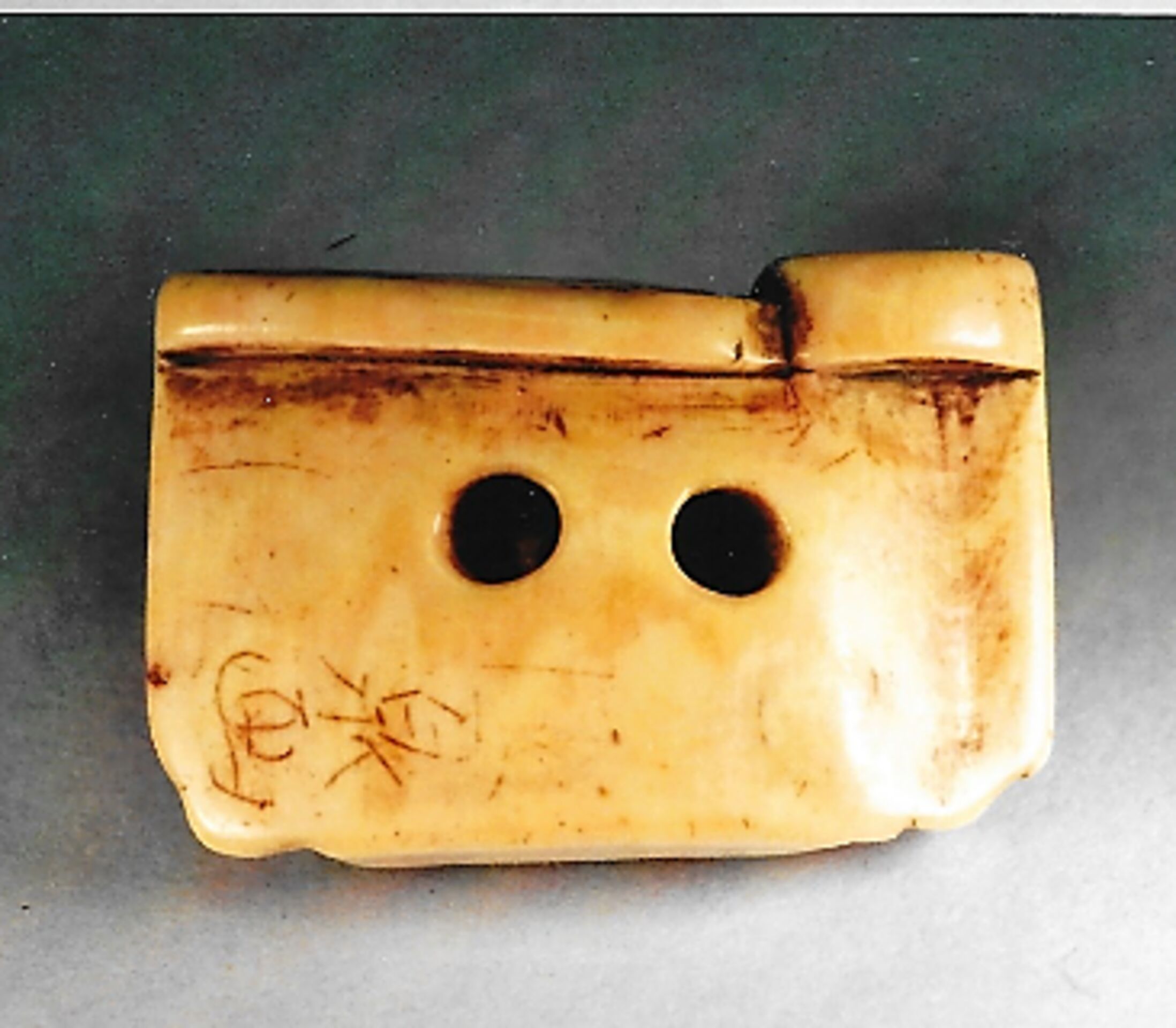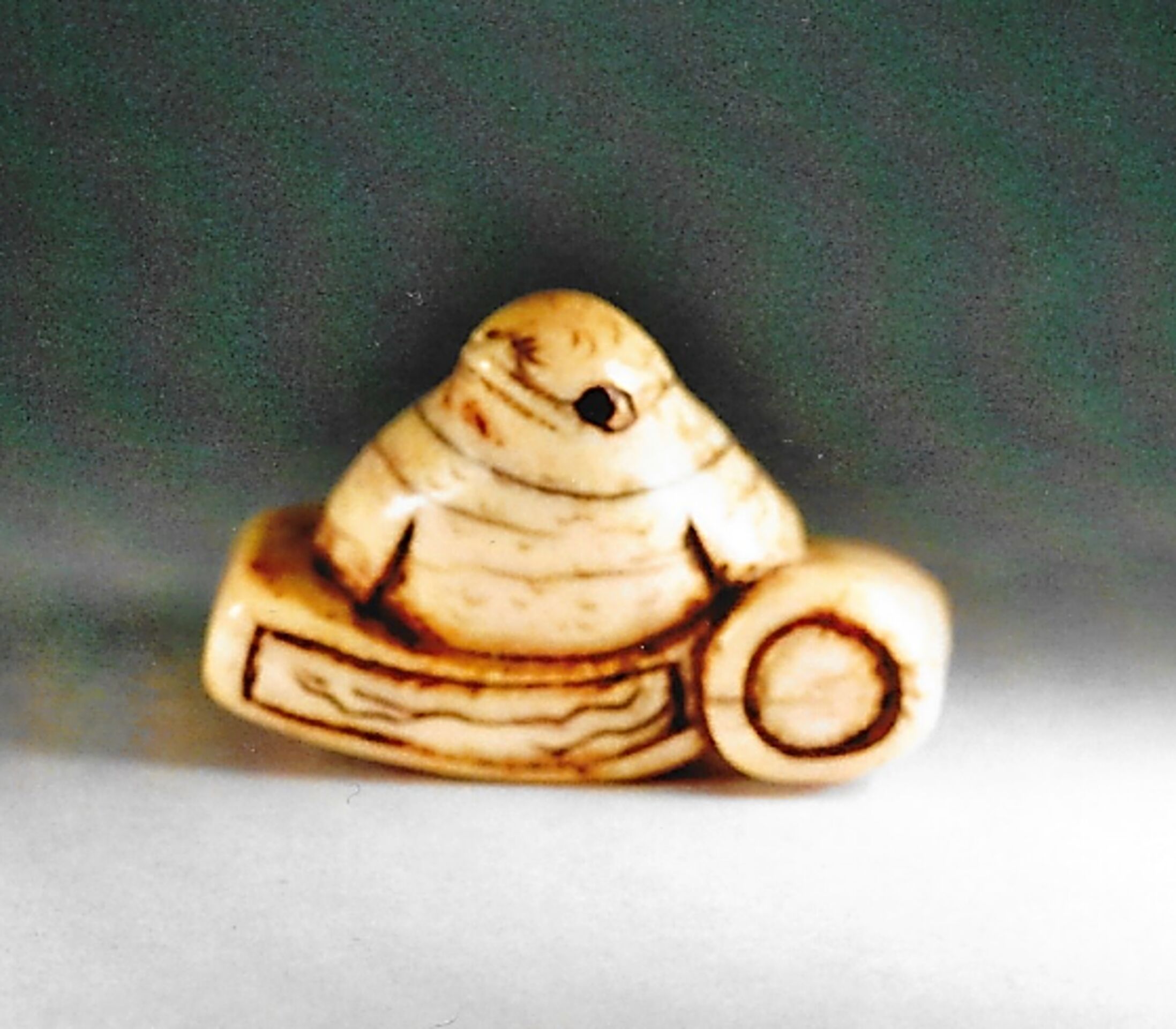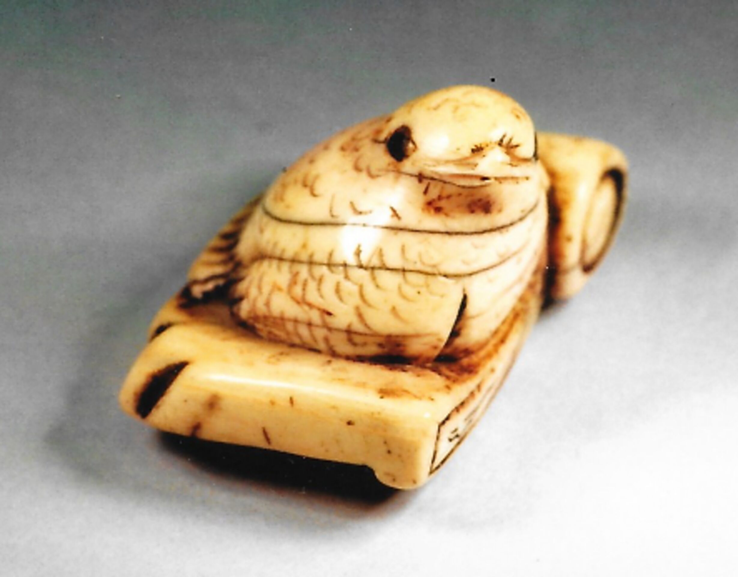 Elfenbein Katabori. Ein kleiner Spatz sitzt munter auf einem Dachziegel und blickt keck nach oben. Einfaches liebenswürdiges Stück mit einigen quer verlaufenden Alterssprüngen. Die Augen in dunklem Material (Horn?) eingelegt. Breite 38mm, Höhe 25mm. Unterseitig schöne Alterspatina, zwei gleichgrosse Himotoshi und haarfein in kebori mei eingeritzt eine Signatur IZUMI ga (K307, K272, ga=“gemalt“). Alter ca. 1. Hälfte 19.Jh.