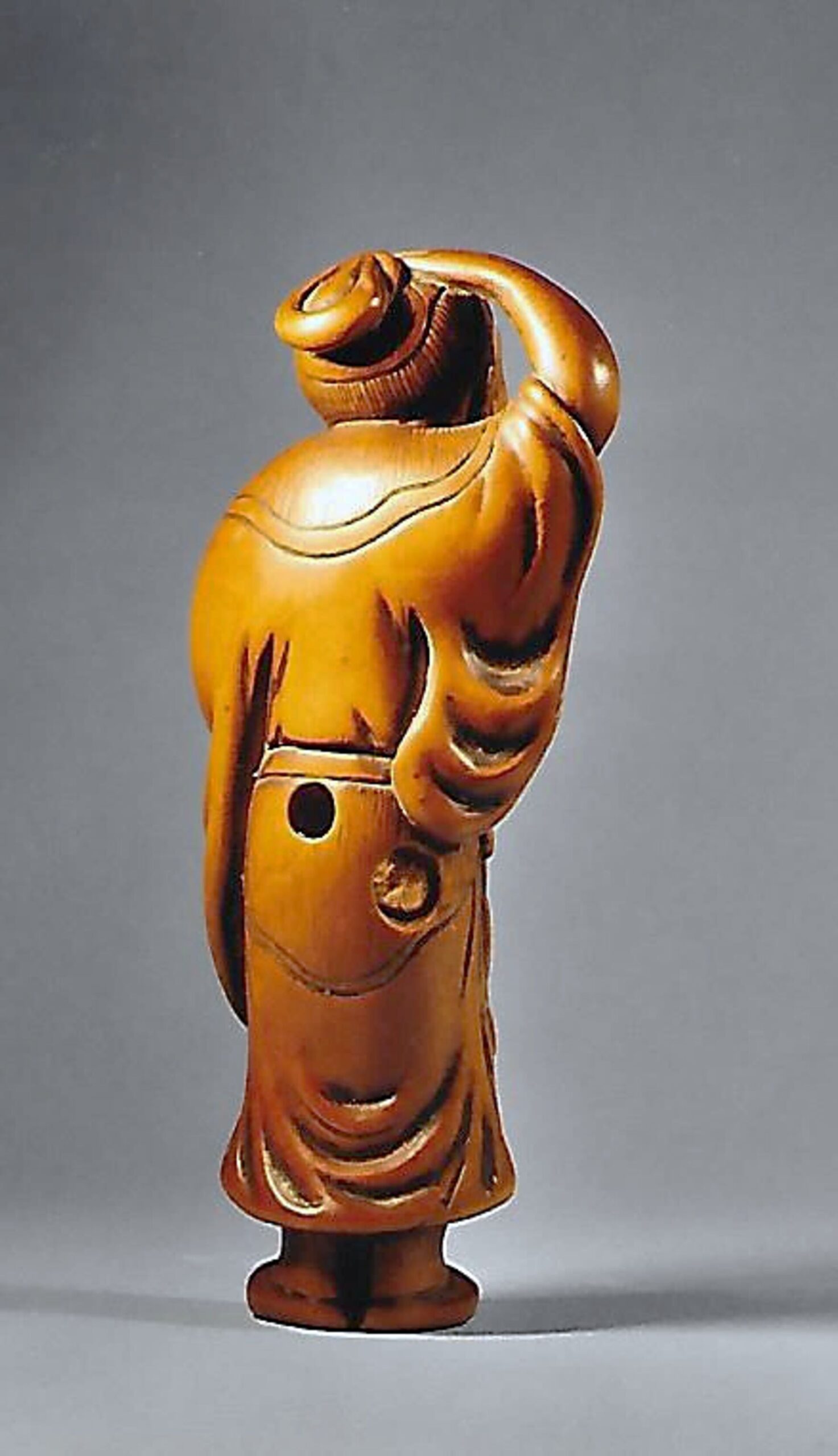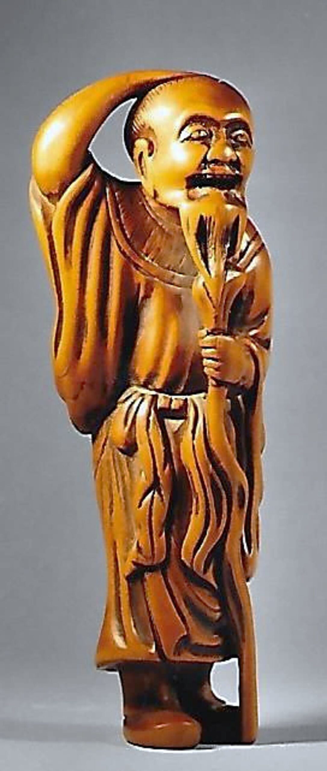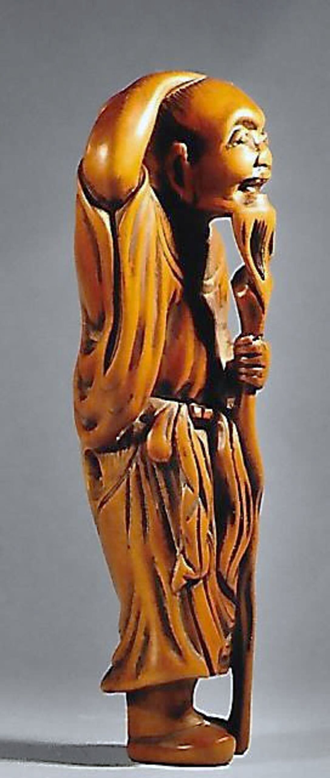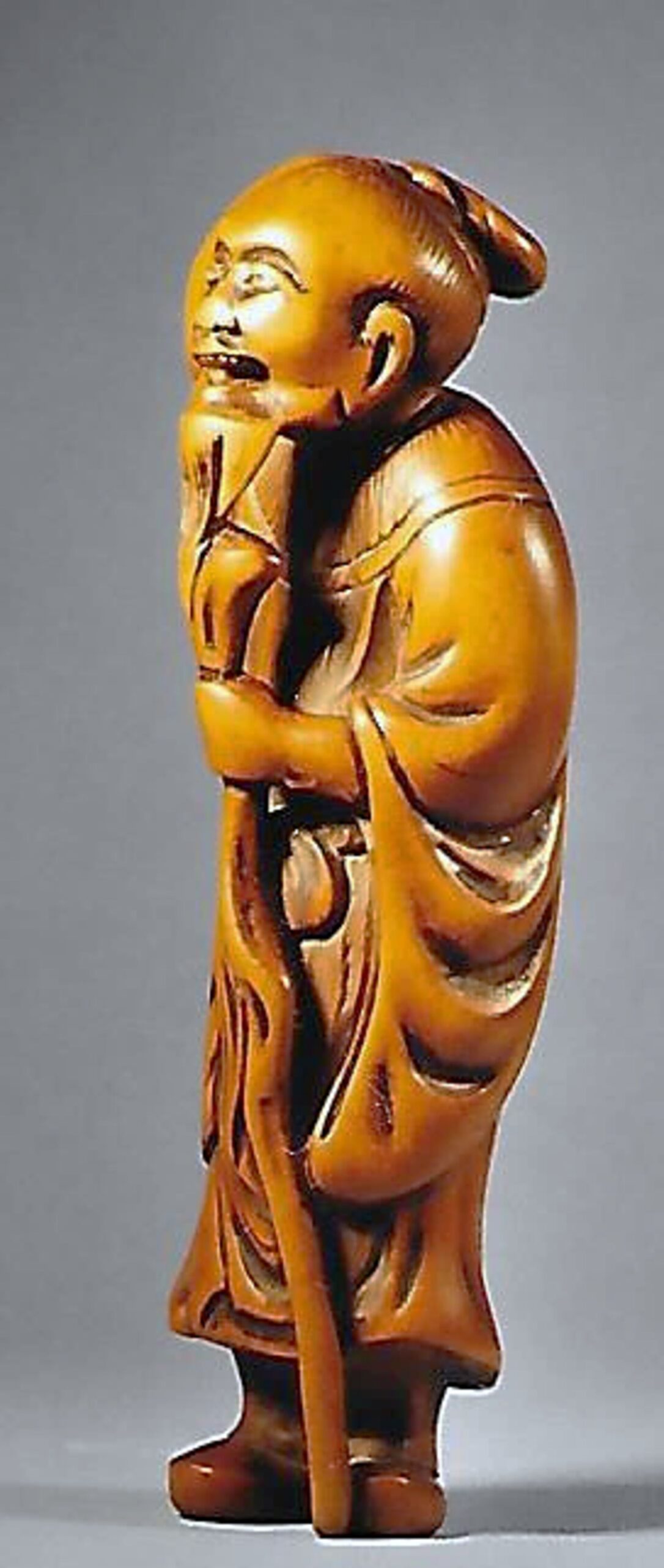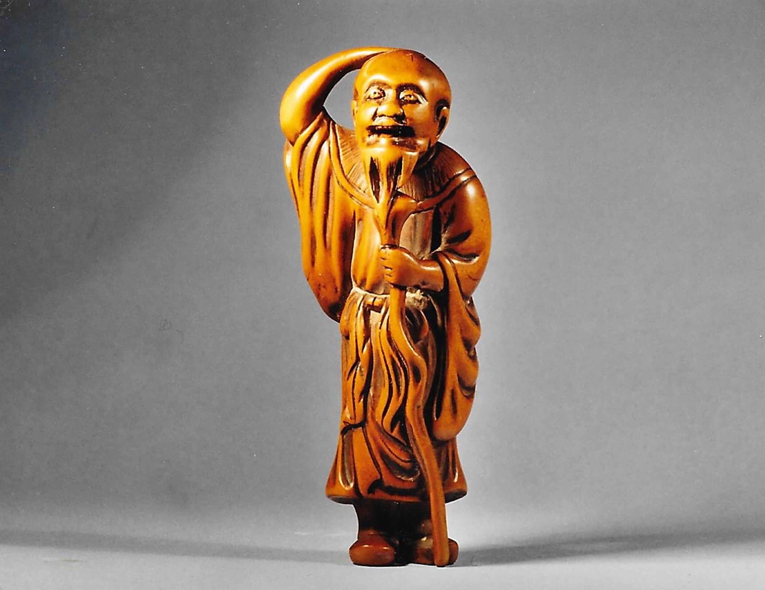 Holz-Katabori. Ein freundlich lachender älterer Mann steht da, aufwendig frisiert, mit dreizipfeligem Bart. Er ist sorgfältig gekleidet in ein wadenlanges, weites und bequemes Gewand mit einem breiten Kragen und einer analogen Verstärkung über dem Gesäss. Um die Hüften mit einem schmalen Gürtel und einer grossen Masche gebunden. Mit der Linken stützt er sich auf einen knorrigen Stock. Die Rechte hält er auf dem Scheitel, was als Zeichen des Erstaunens gilt. Der Blick ist beseligt nach oben gerichtet. Buchsbaum-Holz. Höhe 88mm. Gut gebohrte Himotoshi rückseitig in der Gegend des Gesässes. Alter: vermutlich 1. Hälfte 19.Jh.