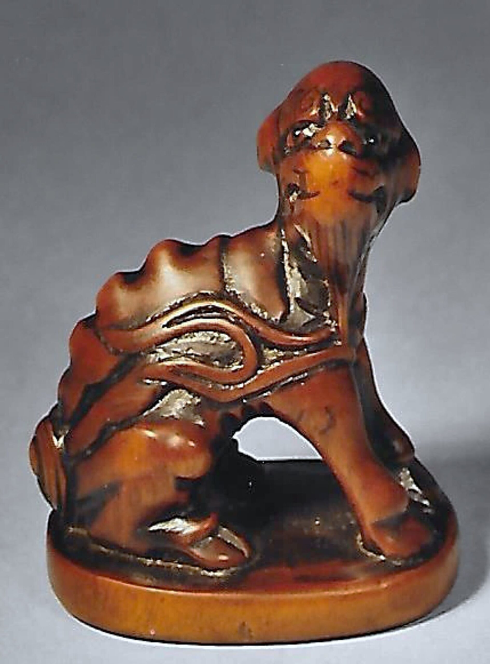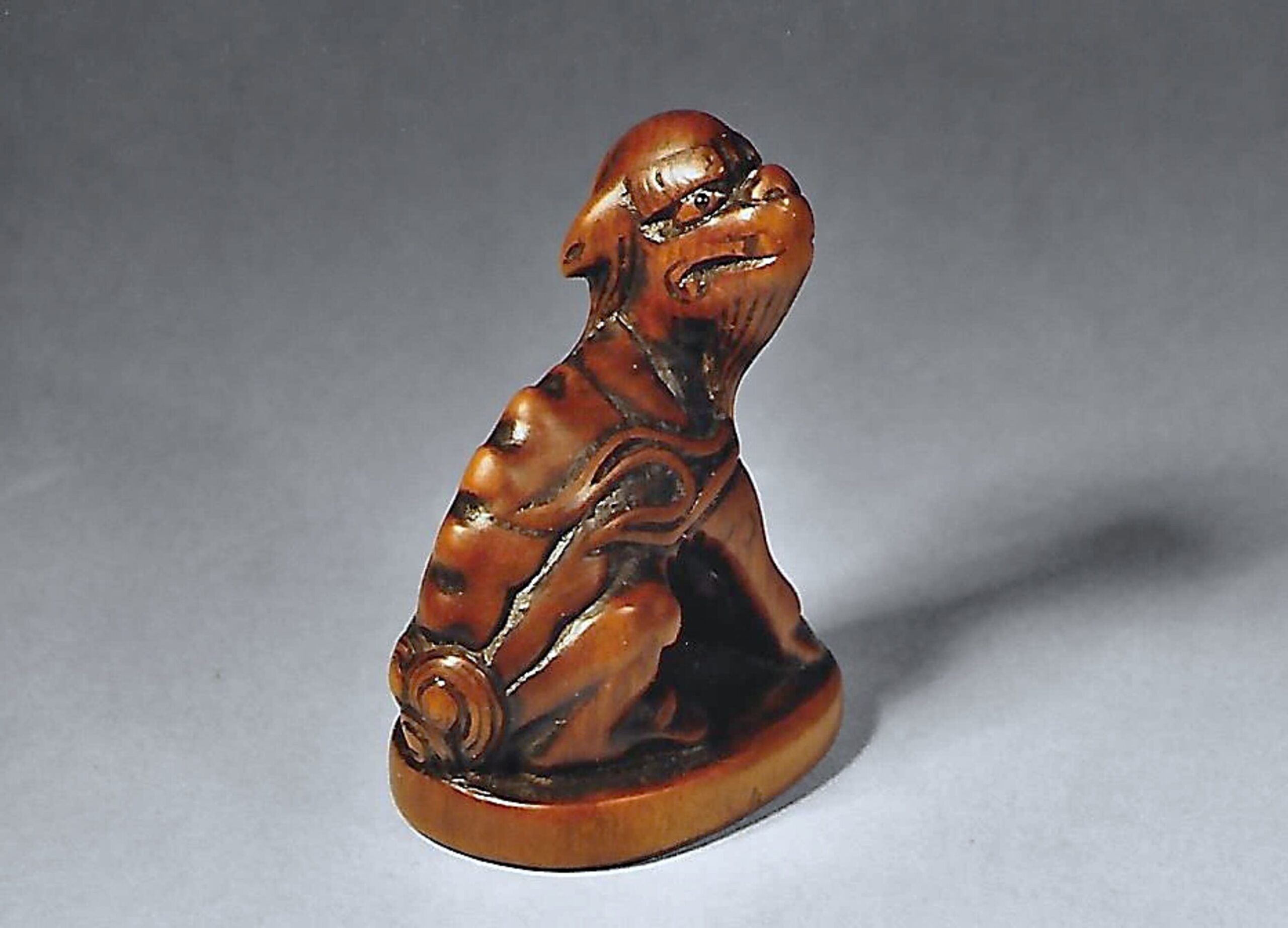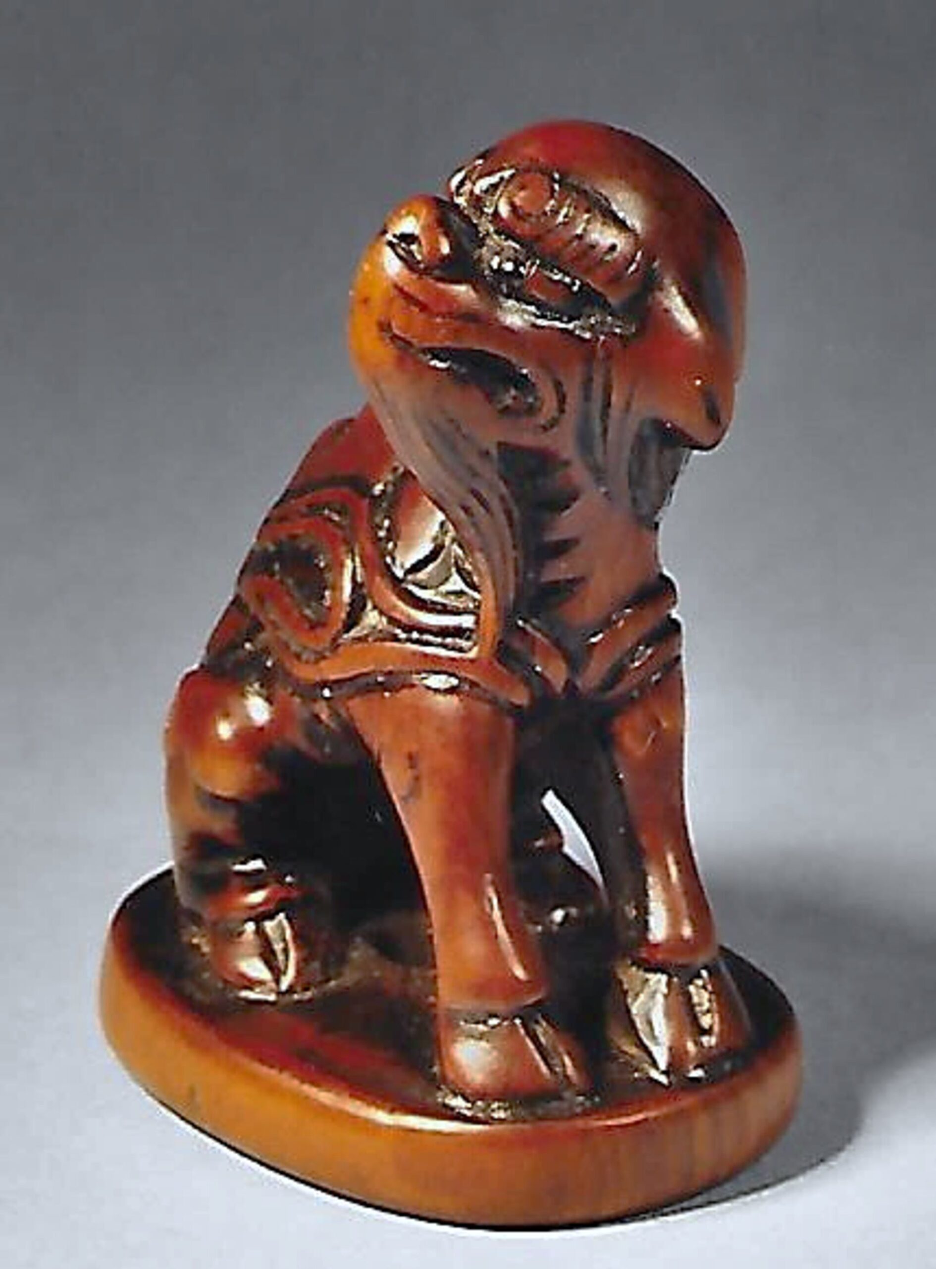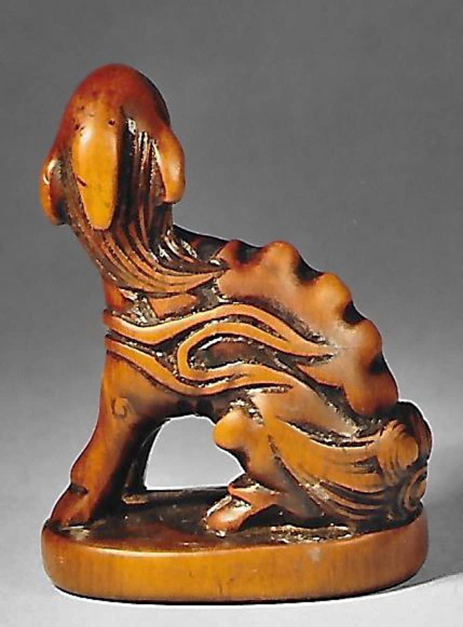 Das Horn auf dem Kopf, die Flammen, die aus seinen Seiten schlagen, die Hufe, der dreifach geringelte Schwanz, all das kennzeichnet dieses Fabeltier als eine Variante des Kirin. Es sitzt auf einer ovalen Basis und blickt kühn und etwas dummdreist nach rechts. In der Basis ein zentrales Himotoshi. Buchsbaum, die Pupillen dunkel eingelegt. Höhe 41mm, gut abgegriffen. Alter ca. 1. Hälfte bis Mitte 19.Jh. Nicht signiert.