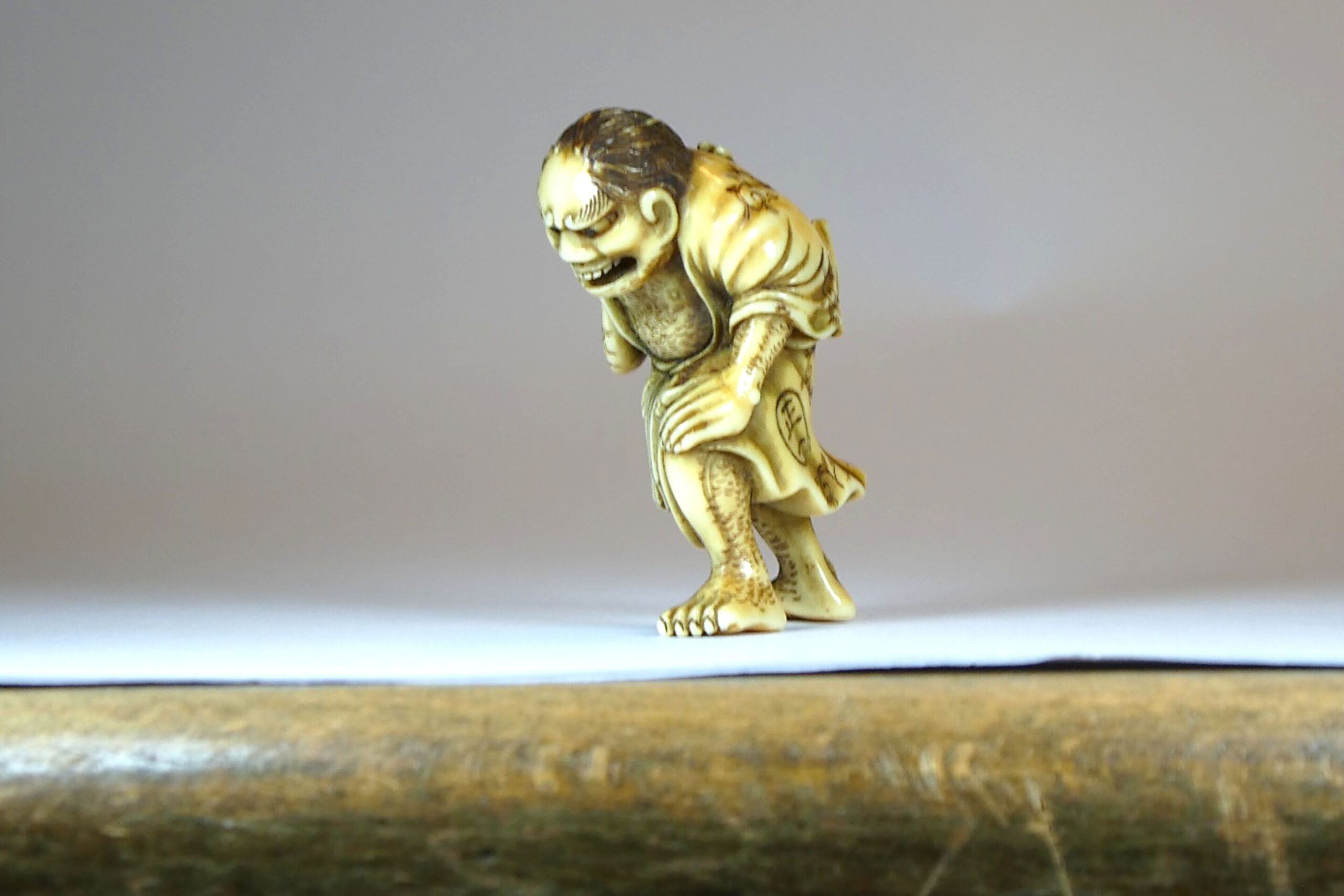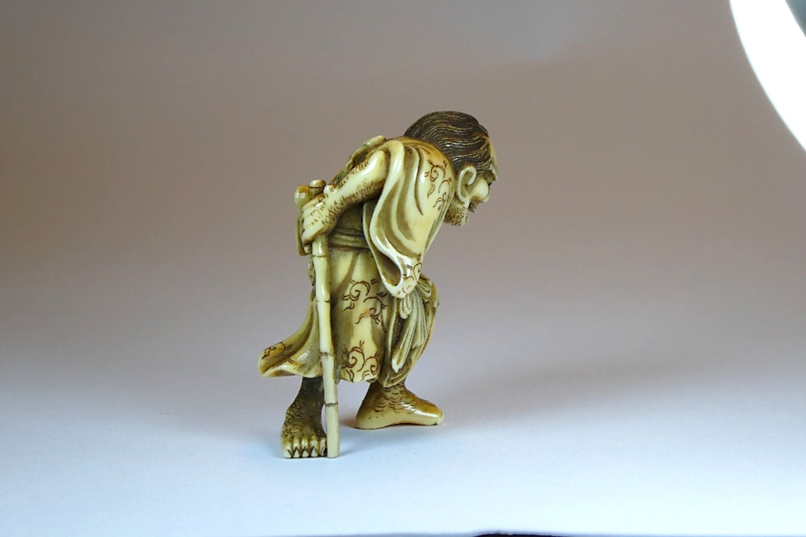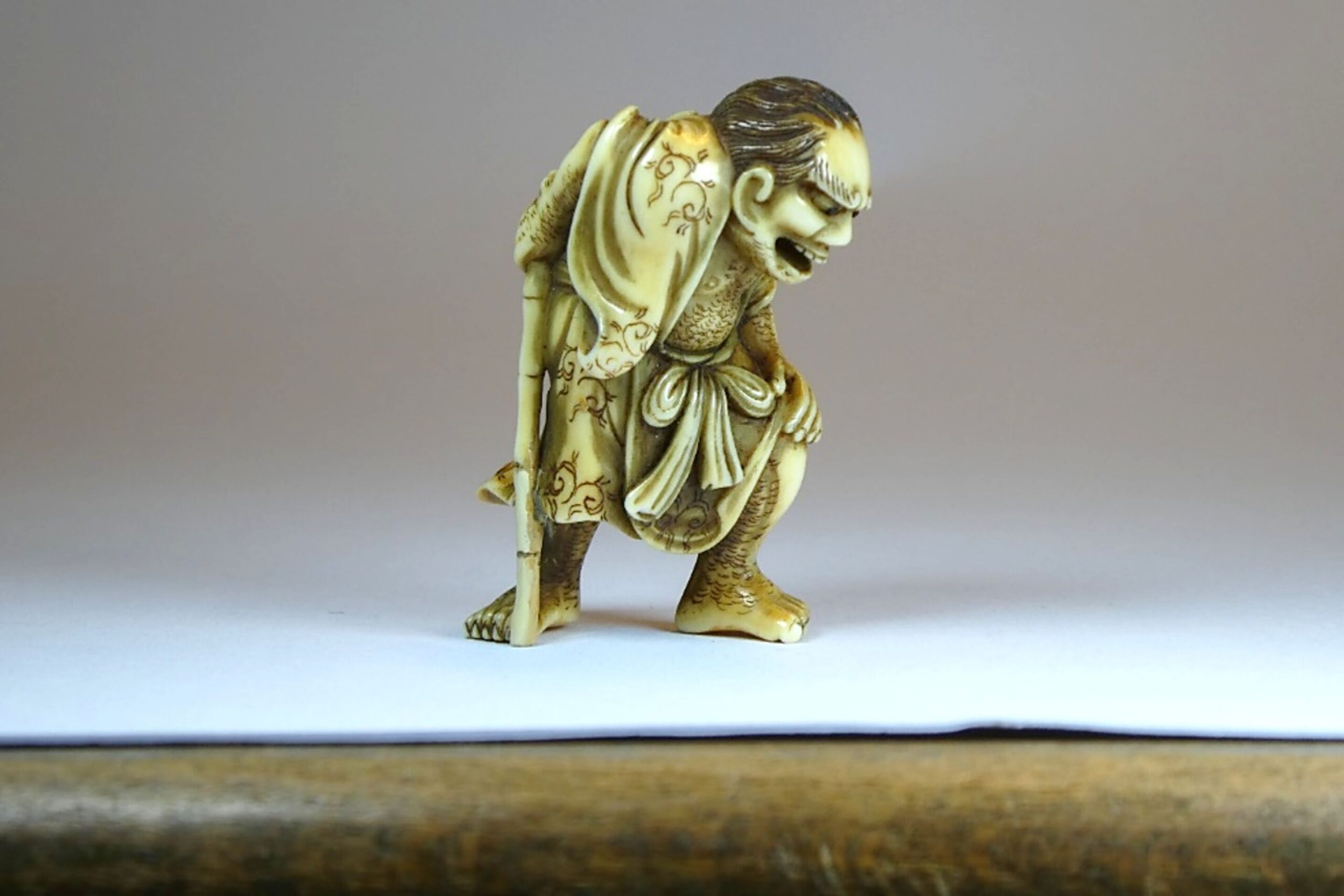 Elfenbein Katabori. Gebückt und sorgenvoll gequält ausrufend steht der heilige Mann da, dessen Seele eben von einem Gespräch mit Lao Tse aus dem Himmel zurückgekehrt ist und den eigenen Körper nicht mehr fand und deshalb mit dem Körper eines eben verstorbenen Landstreichers vorlieb nehmen musste. Die linke Hand hält das offenbar schmerzende Knie, die rechte stützt sich hinter dem Rücken auf einen Bambusstock. Das windbewegte mit Blattwerk und Voluten gemusterte Gewand lässt die behaarte Brust frei und ist am Bauch mit einer grossen Masche gebunden. Die ebenfalls behaarten Beine stehen blossfüssig auf dem Boden. Links am Gewand in einer ovalen Aussparung die Signatur MASAKAZU (K191, K141). Im Rücken zwei ungleich grosse, gut gebohrte Himotoshi. Höhe 39mm. Sehr fein geschnitzte Arbeit in perfektem Erhaltungszustand. Die Augen sind eingelegt in dunklem Horn. Osaka, 19.Jh.