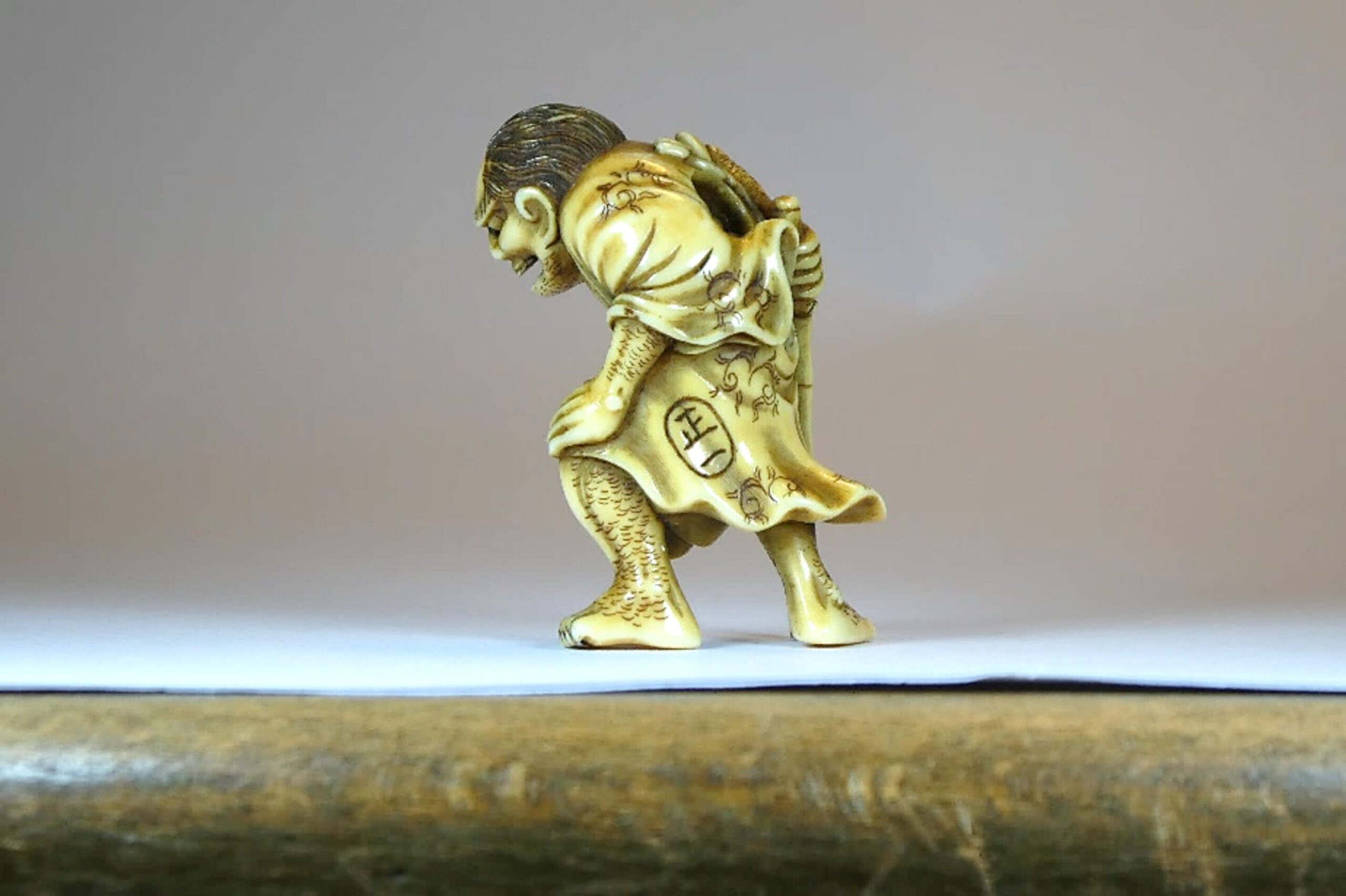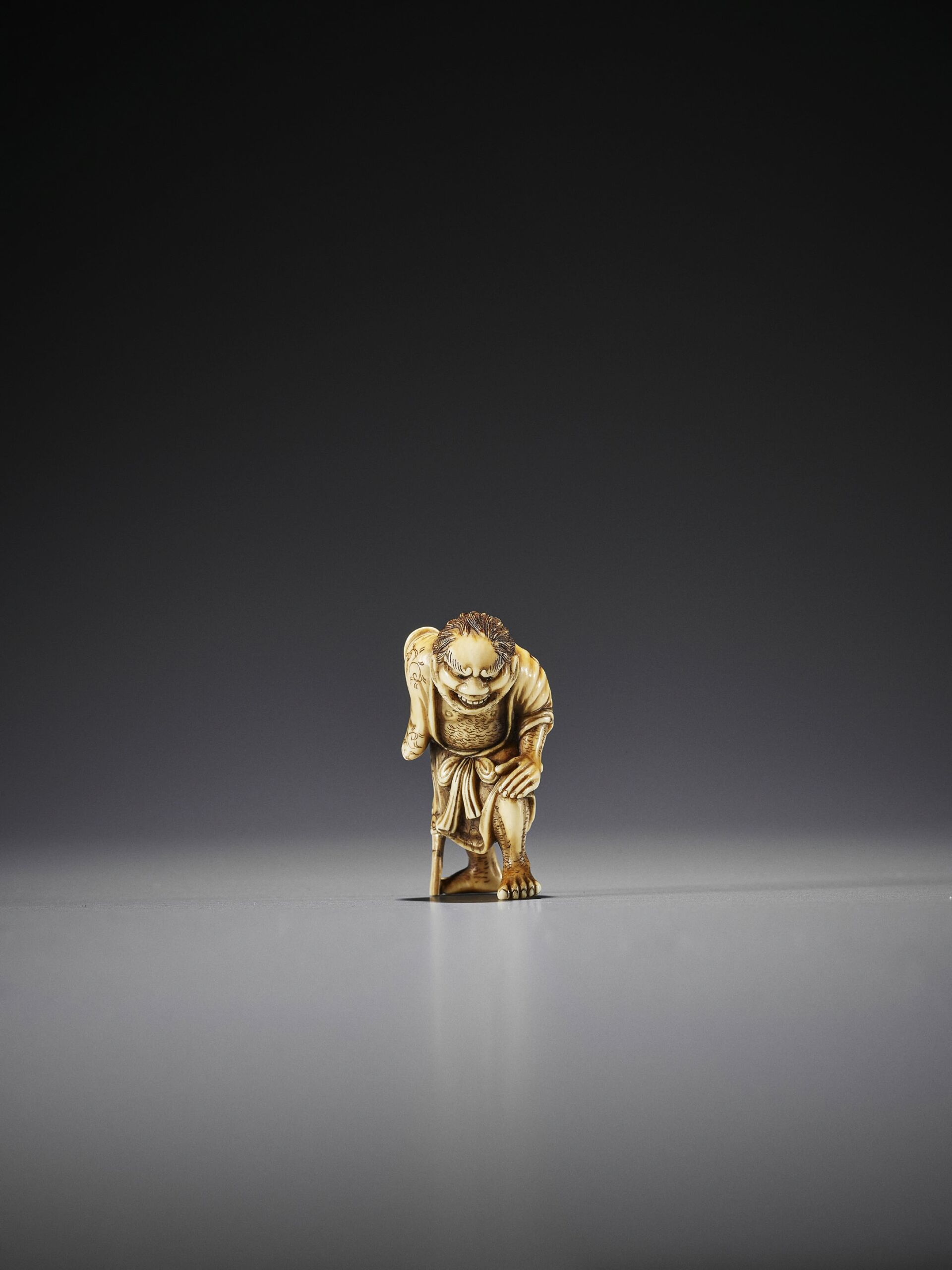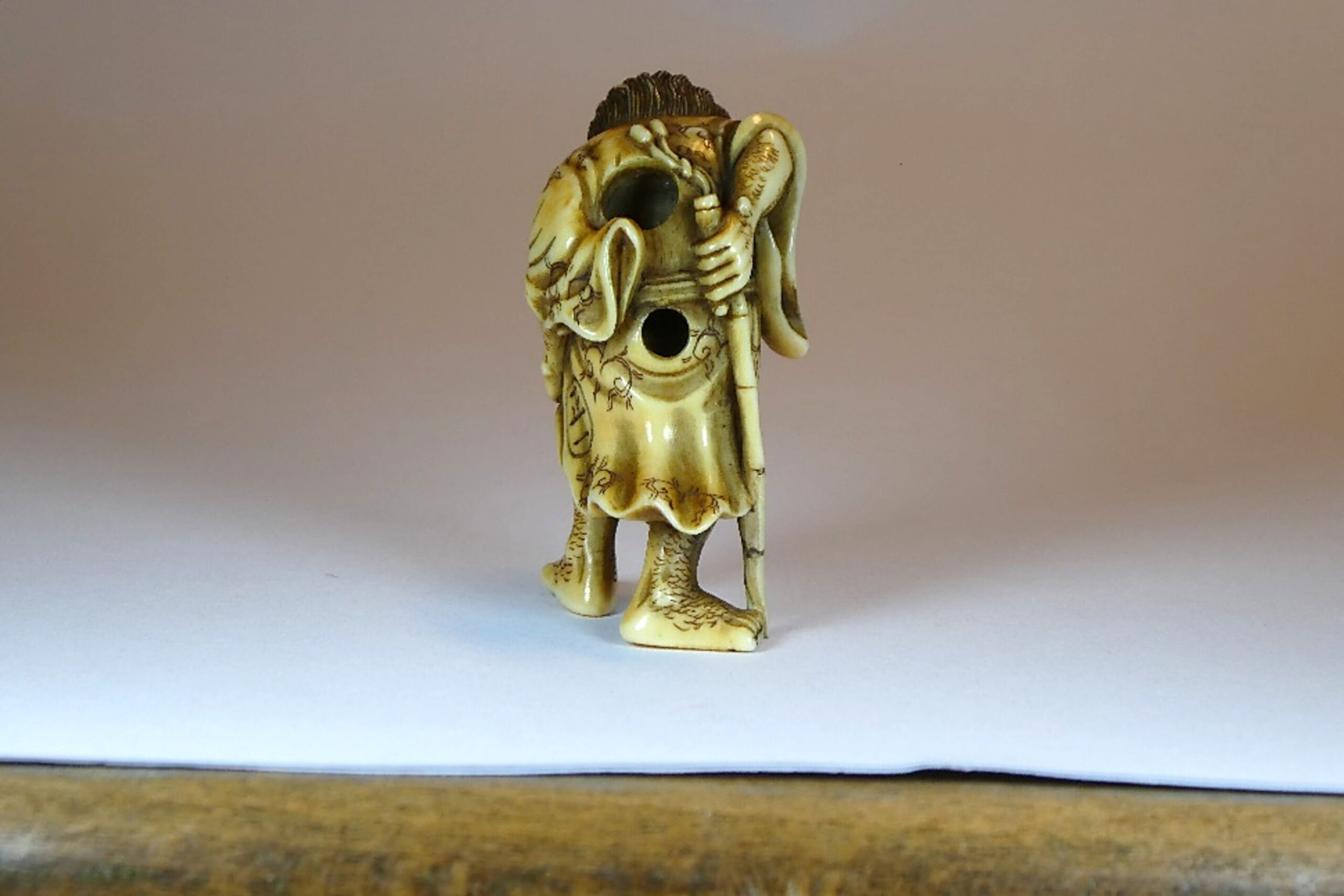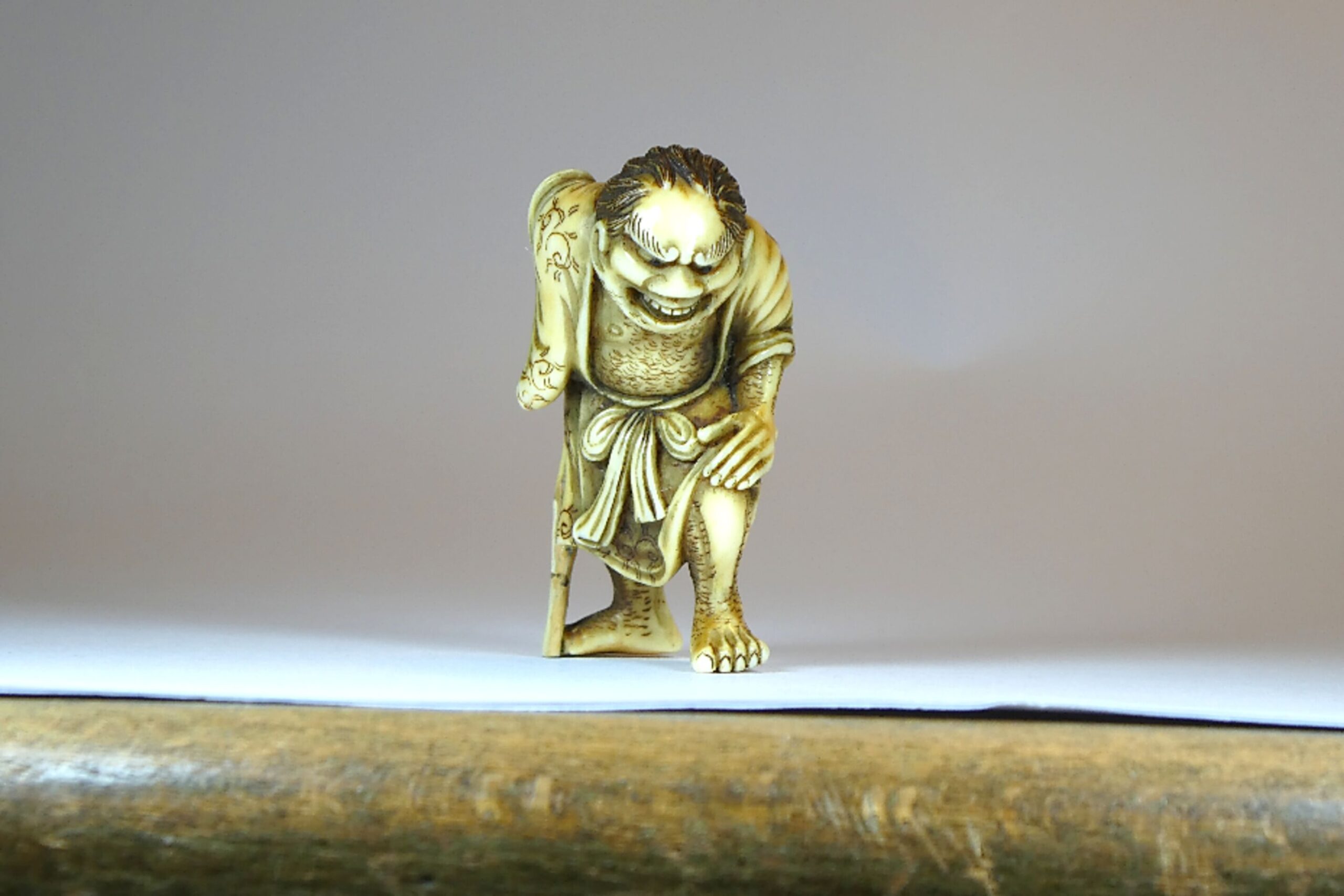 Elfenbein Katabori. Gebückt und sorgenvoll gequält ausrufend steht der heilige Mann da, dessen Seele eben von einem Gespräch mit Lao Tse aus dem Himmel zurückgekehrt ist und den eigenen Körper nicht mehr fand und deshalb mit dem Körper eines eben verstorbenen Landstreichers vorlieb nehmen musste. Die linke Hand hält das offenbar schmerzende Knie, die rechte stützt sich hinter dem Rücken auf einen Bambusstock. Das windbewegte mit Blattwerk und Voluten gemusterte Gewand lässt die behaarte Brust frei und ist am Bauch mit einer grossen Masche gebunden. Die ebenfalls behaarten Beine stehen blossfüssig auf dem Boden. Links am Gewand in einer ovalen Aussparung die Signatur MASAKAZU (K191, K141). Im Rücken zwei ungleich grosse, gut gebohrte Himotoshi. Höhe 39mm. Sehr fein geschnitzte Arbeit in perfektem Erhaltungszustand. Die Augen sind eingelegt in dunklem Horn. Osaka, 19.Jh.