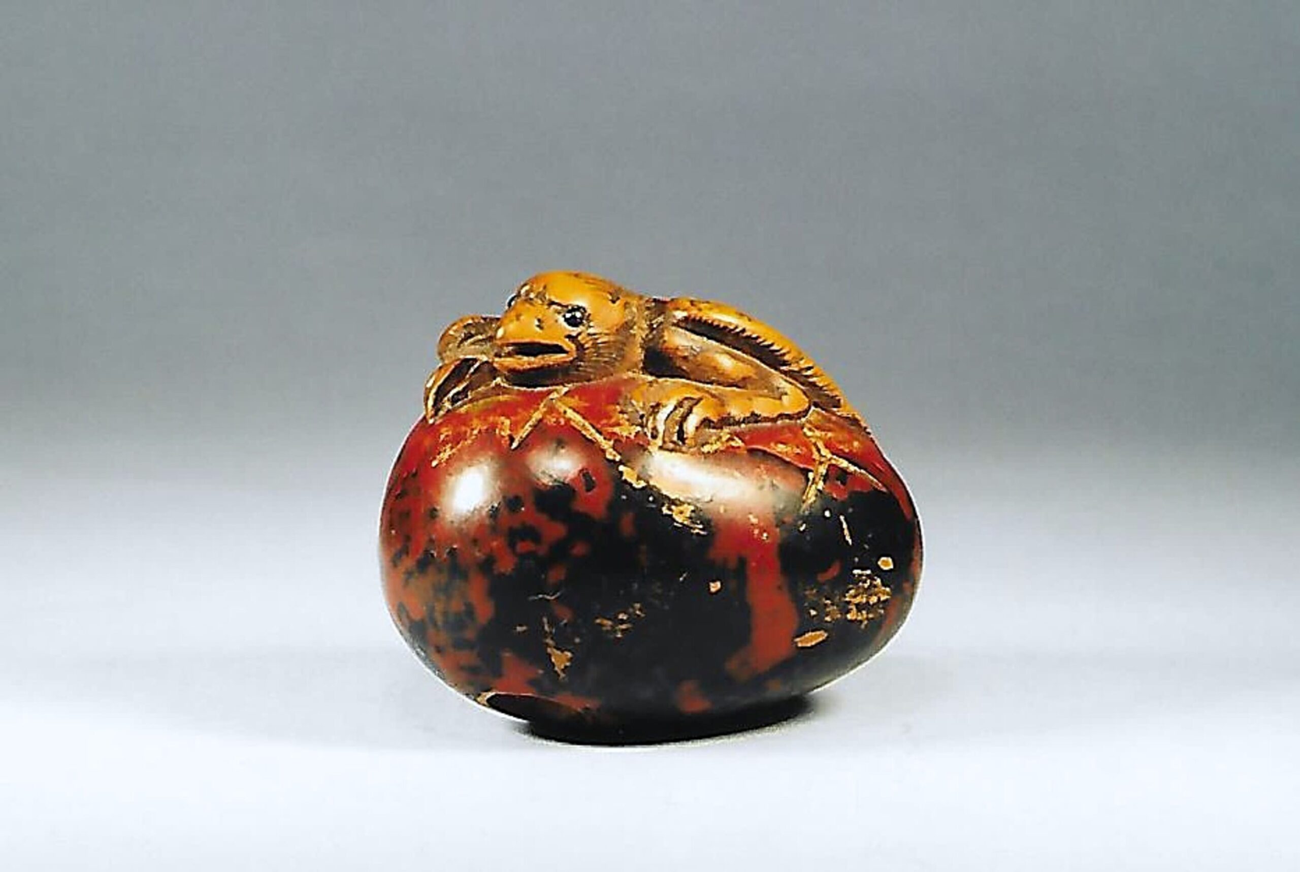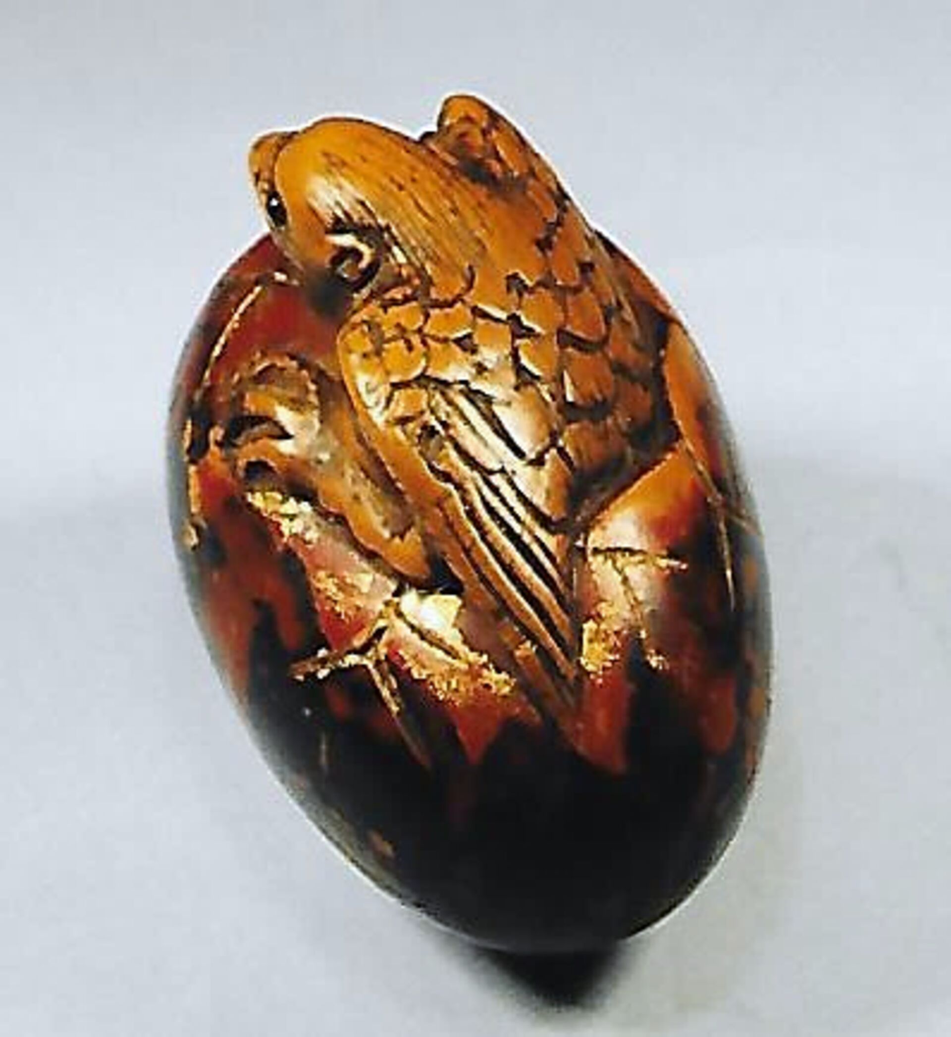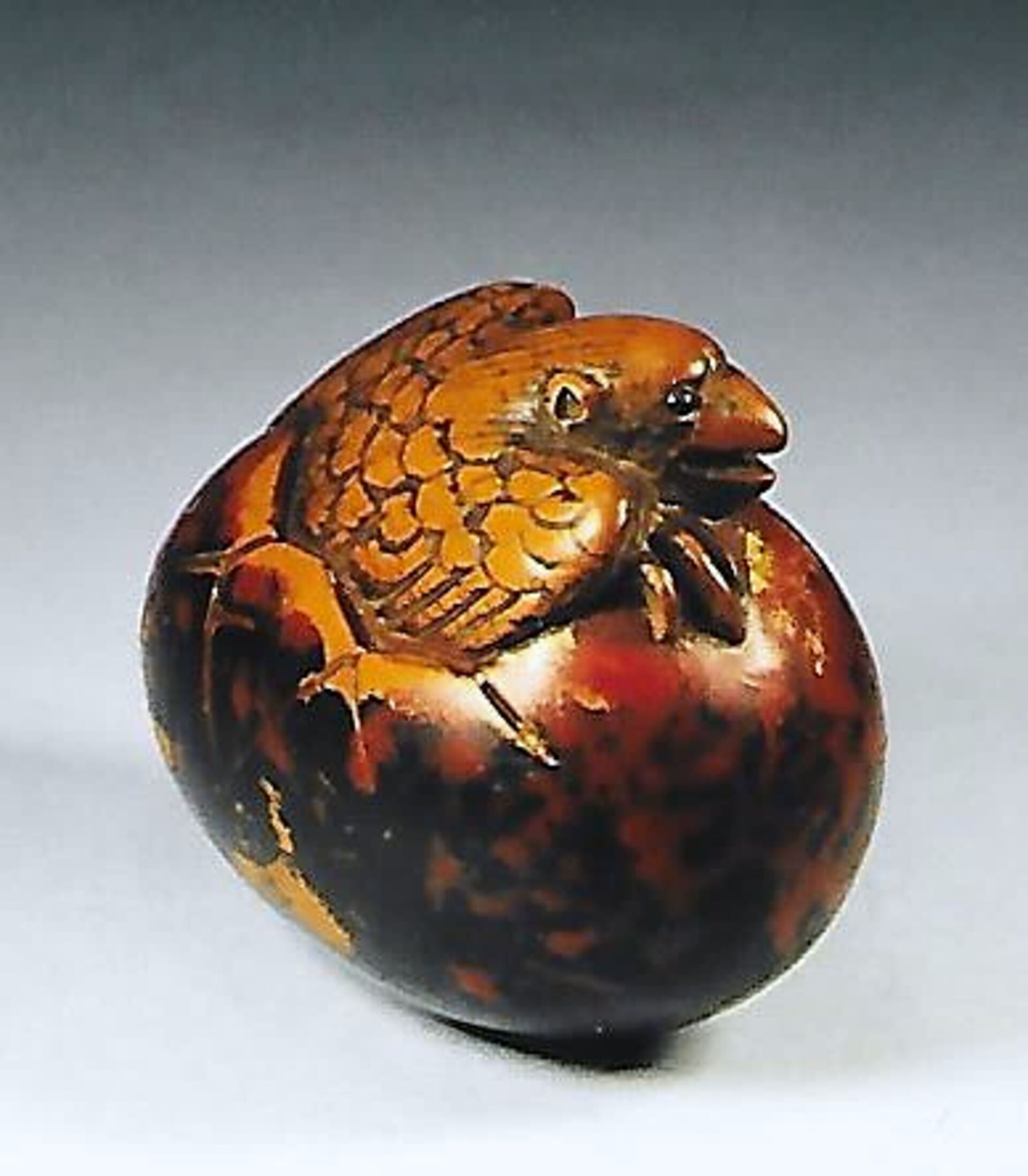 Holz-Katabori. Ein Tengu, der aus dem Ei schlüpft. Negoro Rot-auf-schwarz-Lacktechnik, mit Resten von Goldlack. Das kleine geflügelte Wesen blickt noch sehr scheu und unsicher in die Welt. Länge 36mm, Gebrauchsspuren. Unterseitig zwei unterschiedlich grosse Himotoshi. Alter ca.1. Hälfte bis Mitte 19.Jh., nicht signiert.