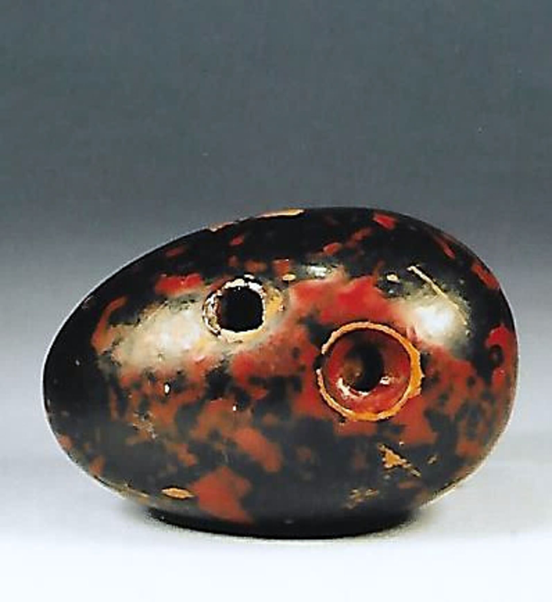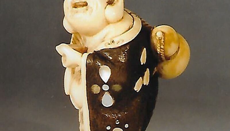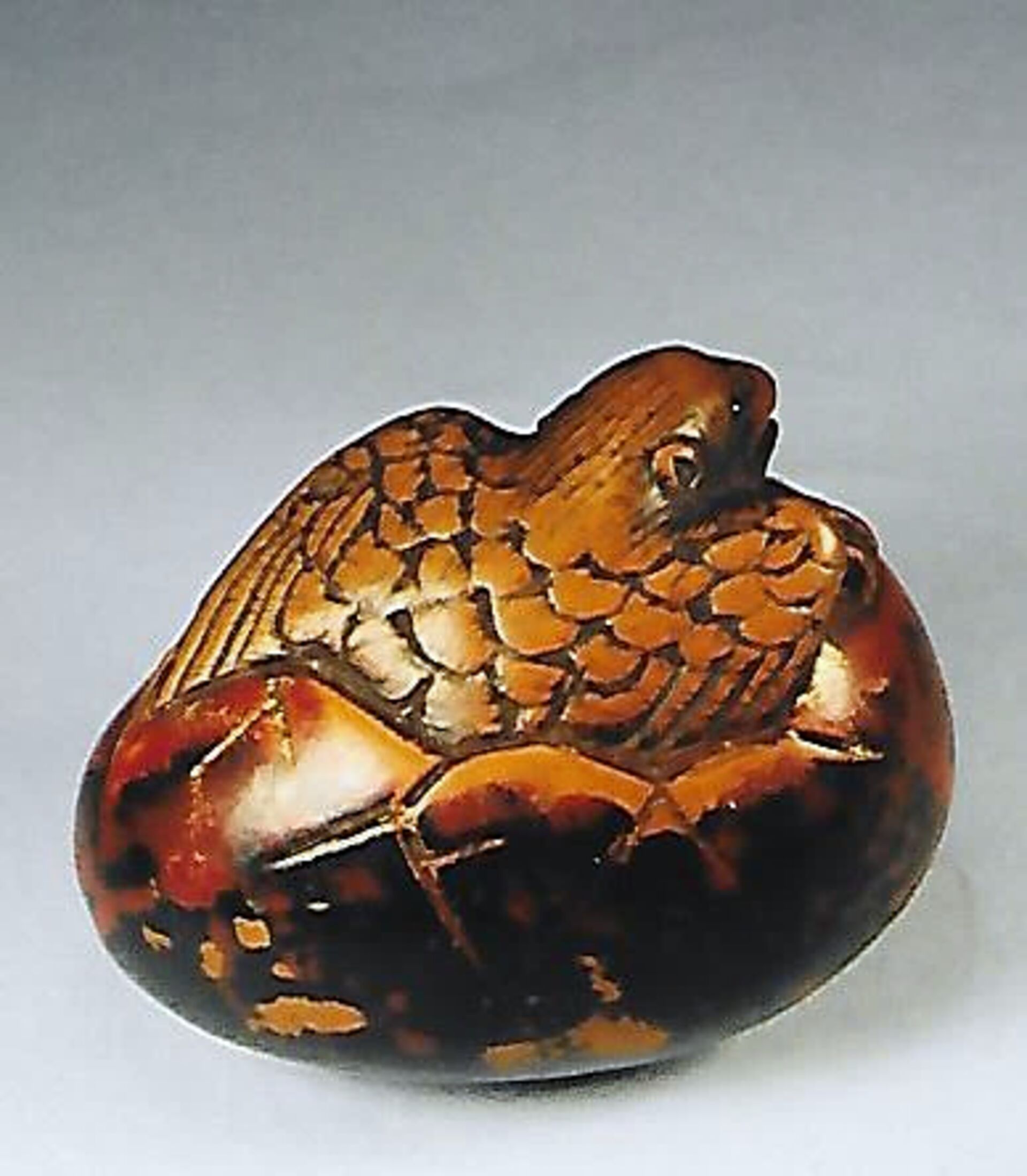 Holz-Katabori. Ein Tengu, der aus dem Ei schlüpft. Negoro Rot-auf-schwarz-Lacktechnik, mit Resten von Goldlack. Das kleine geflügelte Wesen blickt noch sehr scheu und unsicher in die Welt. Länge 36mm, Gebrauchsspuren. Unterseitig zwei unterschiedlich grosse Himotoshi. Alter ca.1. Hälfte bis Mitte 19.Jh., nicht signiert.