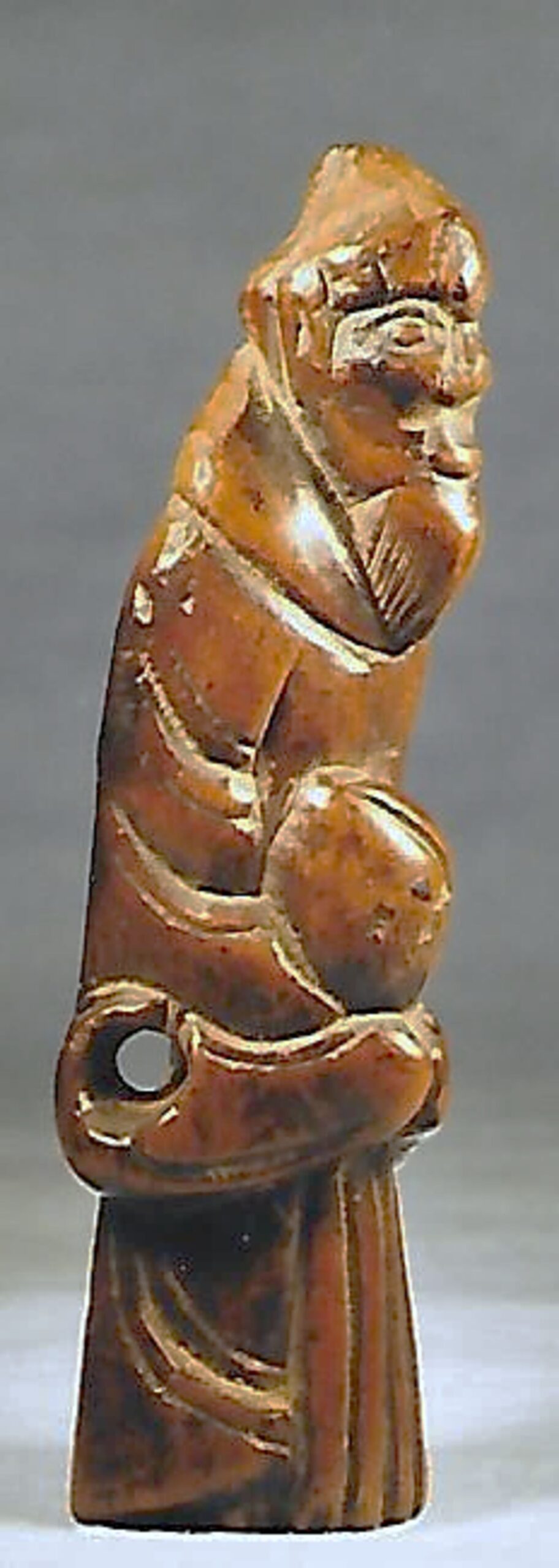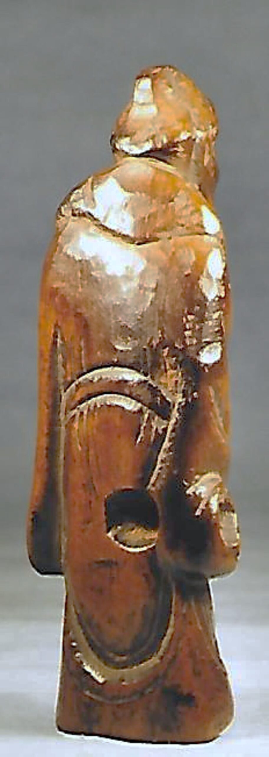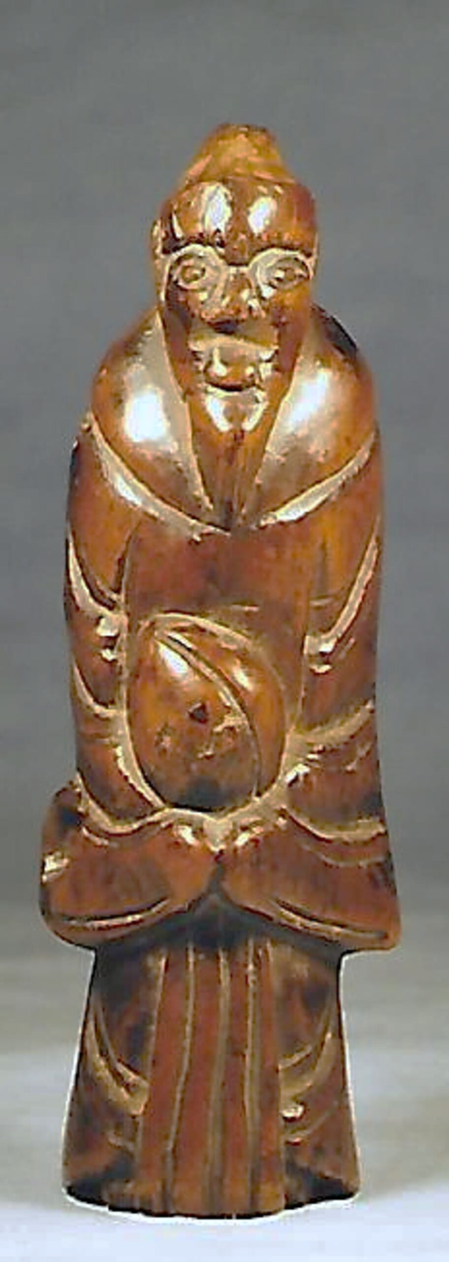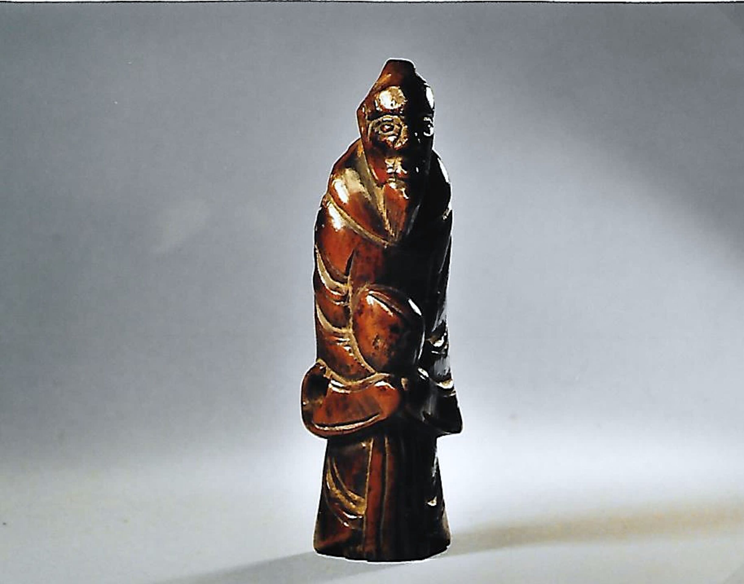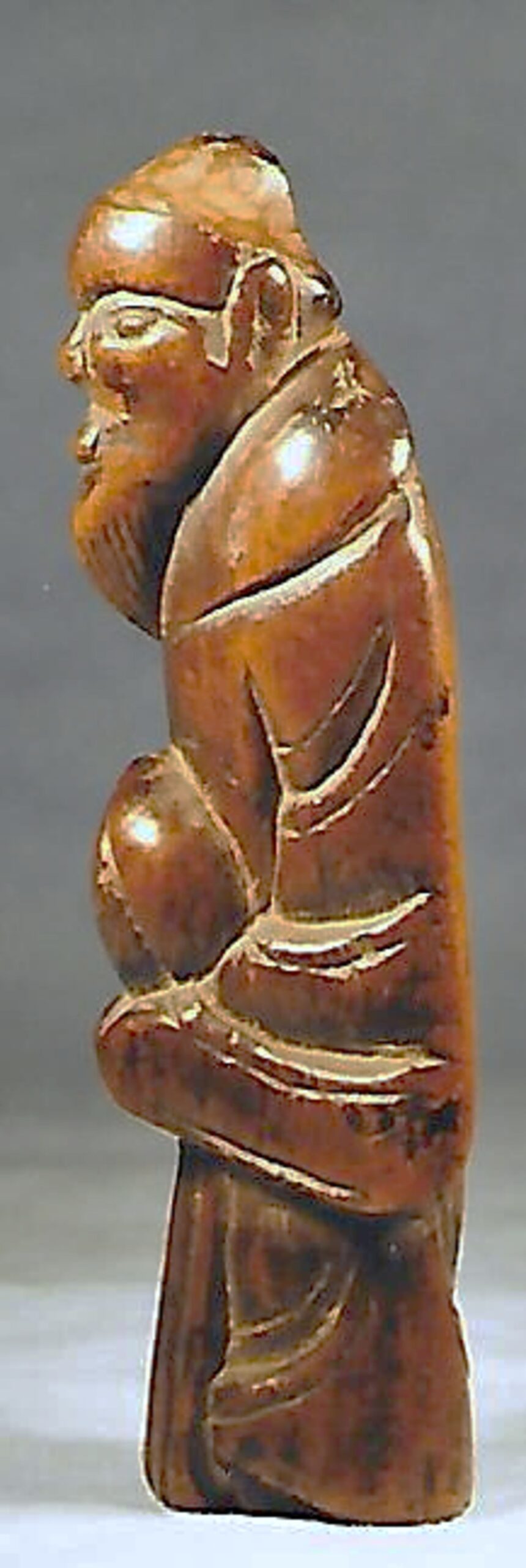 Holz-Katabori. Der Bergeinsiedler steht leicht vornüber geneigt da, statisch, mit bodenlangem Gewand, der Gesichtsausdruck ist nicht zu erraten. Im Schoss hält er einen übergrossen Pfirsich, der ihn kennzeichnet. Ein altes, nur in Umrissen und kühn geschnitztes Stück mit schöner Glanzpatina, vermutlich um 1800. Entschlossen durchgebohrte Himotoshi auf der Höhe des rechten Oberschenkels. Gesamthöhe 73mm. Nicht signiert.
