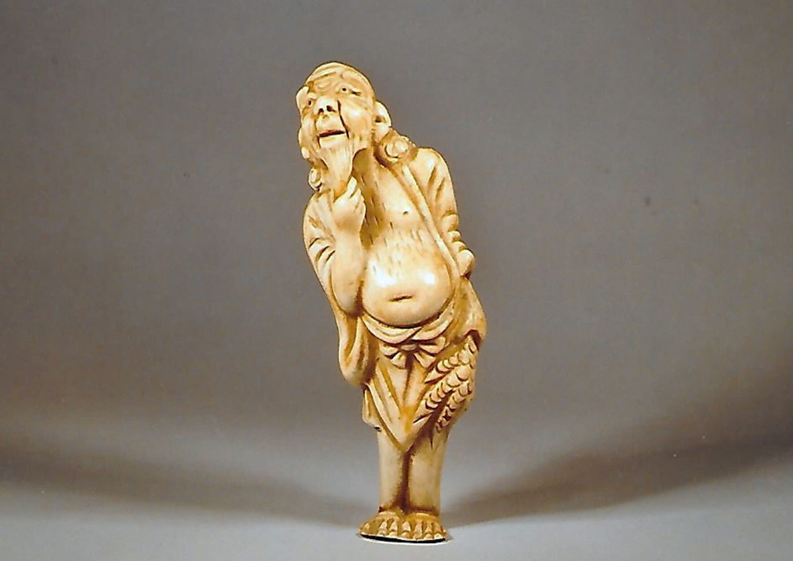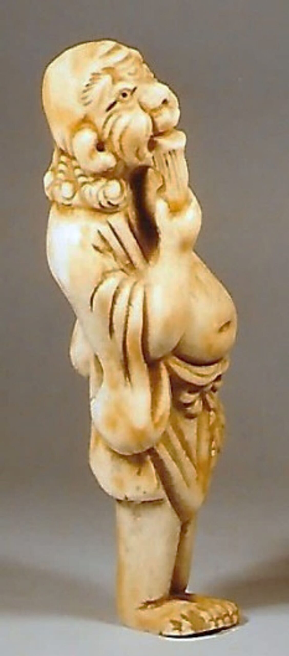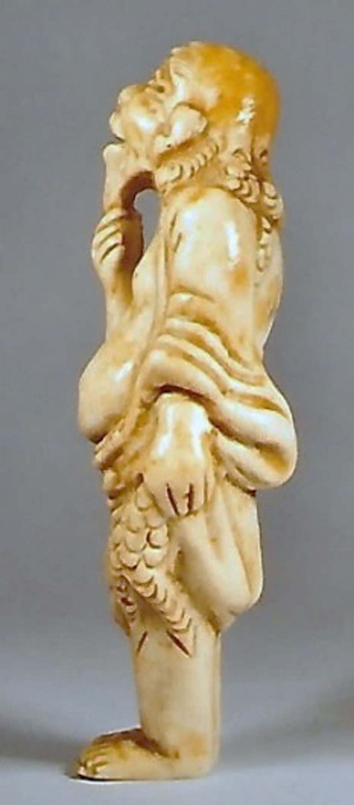 Porzellan-Katabori. Der heilige Mann mit entblösstem Bauch, Glatze und Nackenlocken steht da, nach rechts gekrümmt, den Blick fragend, staunend, vielleicht auch ein wenig listig nach oben gerichtet. Mit der Rechten streicht er den Bart, in der Linken hält er die für ihn typische grosse Vogelkralle. Im Rücken zwei ungleich grosse Himotoshi. Das Porzellan leicht braun glasiert. Höhe 87 mm. Nicht signiert. Alter: vermutlich 19 .Jh.