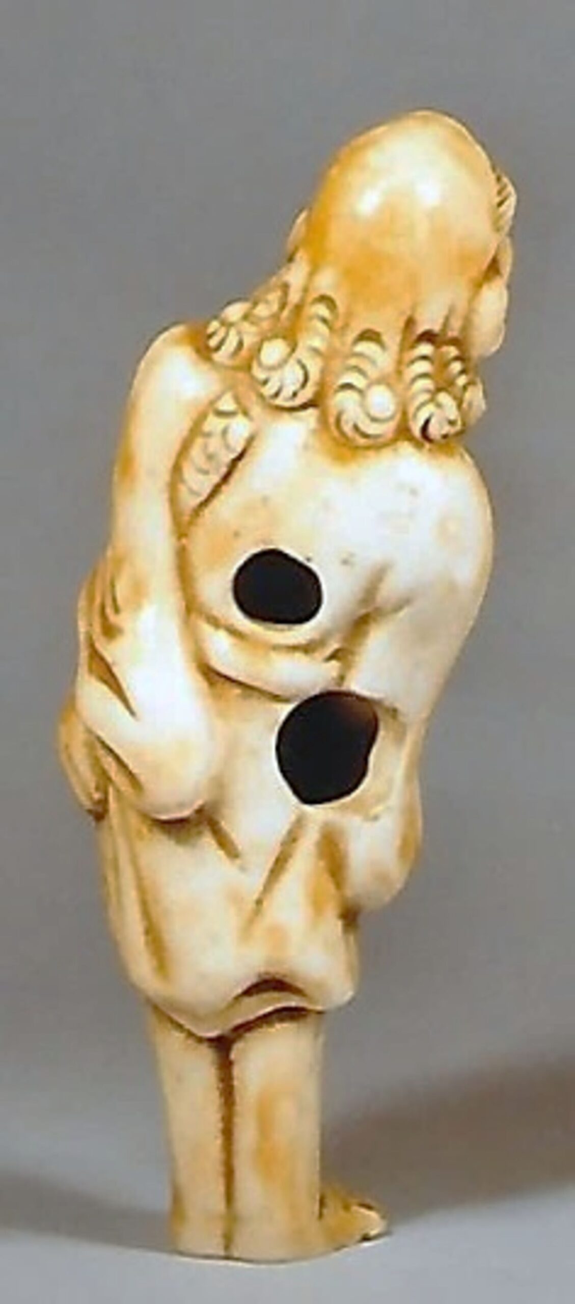 Porzellan-Netsuke sind, verglichen mit solchen aus Elfenbein oder Holz, selten und oft plump in der Darstellung und entsprechend wenig aussagekräftig. Dieses hier ist detailliert und wirkt ansprechend. Über die Figur des Tsuru Sennin ist wenig Konkretes bekannt. Schon 1923 schreibt V.-F. Weber, Koji Höfen &.H, p_248 zu Abb.2: Le „sennin” à la patte d’oiseau. Netské en porcelain (Musée d’Emmely). Ce personnage, dont le nom a échappé jusqu’à présent à toutes les recherches, se roncentre fréquemment comme netské ; il est presque toujours en porcelaine et tient dans sa main gauche une grande patte d’oiseau. Oui sait son nom ? — So häufig, wie Weber schreibt, ist die Darstellung nicht, siehe umseitig. Aber bis heute weiss man nicht mehr als damals über diese Figur. Es hat sich eingebürgert sie als „Tsuru Sennin” Kranich-Sennin zu bezeichnen, aber welcher der verschiedenen Sennin, die den Kranich — ein Symbol langen Lebens — als Begleittier haben: Chôshikwa, Hichôbô, Jofuku, Josakei, Kôdôk(w)a, Kohaku, Ôshikyô, Ransaikwa, Teireii…es ist, ist bis heute unklar.