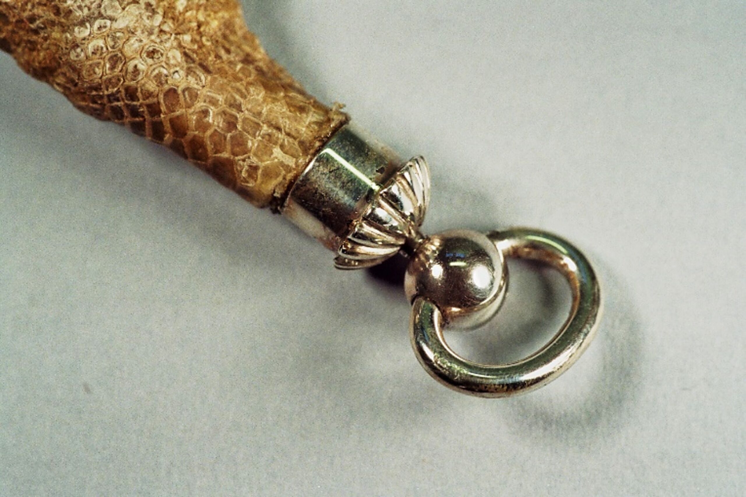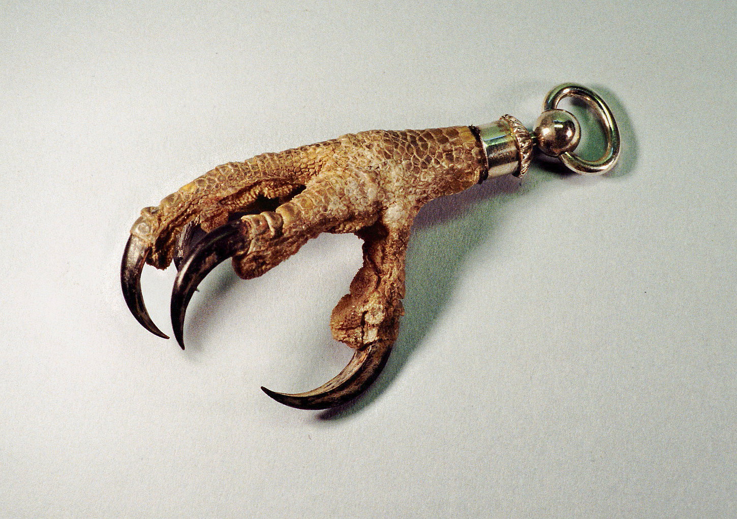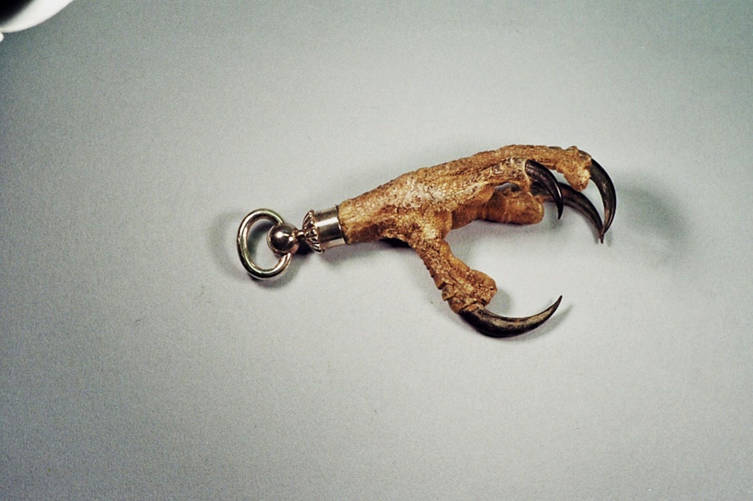 Natürliche Vogelkralle eines Raubvogels. Gefasst mit einer Silberkappe und einembeweglichen Silberring. Länge über alles 87mm.