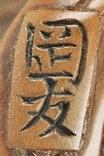 OKATOMO: zählt zur ersten Riege von Netsukeschnitzern, die 1781 im Sôken Kishô lobend erwähnt wurden. Er war Schüler von Masanao (von Kyôto) und Tomotada, arbeitete meist in Elfenbein, aber auch in Holz. Seine Sujets sind kleiner und feiner als die seiner Lehrer. Solange er unter Tomotada arbeitete, signierte er mit dessen Name. Er war dann Lehrer von Tomochika I, Okatori, Okakoto, Okanobu, Tomokoto. Berühmt für seine Tierdarstellungen, v.a. Wachteln auf Hirse. Letzteres Sujet wurde oftmals kopiert, nicht zuletzt von seinem Bruder Okatori. Die Qualität der Kopien ist sehr unterschiedlich, siehe umseitig. Unser Stück ist sicherlich späteren Datums. Es zeigt keinerlei Spuren von Gebrauch und hat keine Patina. Die Signatur ist von einer Perfektion, wie man sie bei Okatomo-Originalen nie sieht. Dennoch ist es von höchster Qualität. Eines der „very well carved pieces“. Zum Alter dieses Stückes hält man sich am besten an Raymond Bushell, der in „Collector’s Netsuke“ p. 24 bemerkt, „Okatomo pieces appear to be concentrated in the last half of the nineteenth and in the twentieth centuries“.