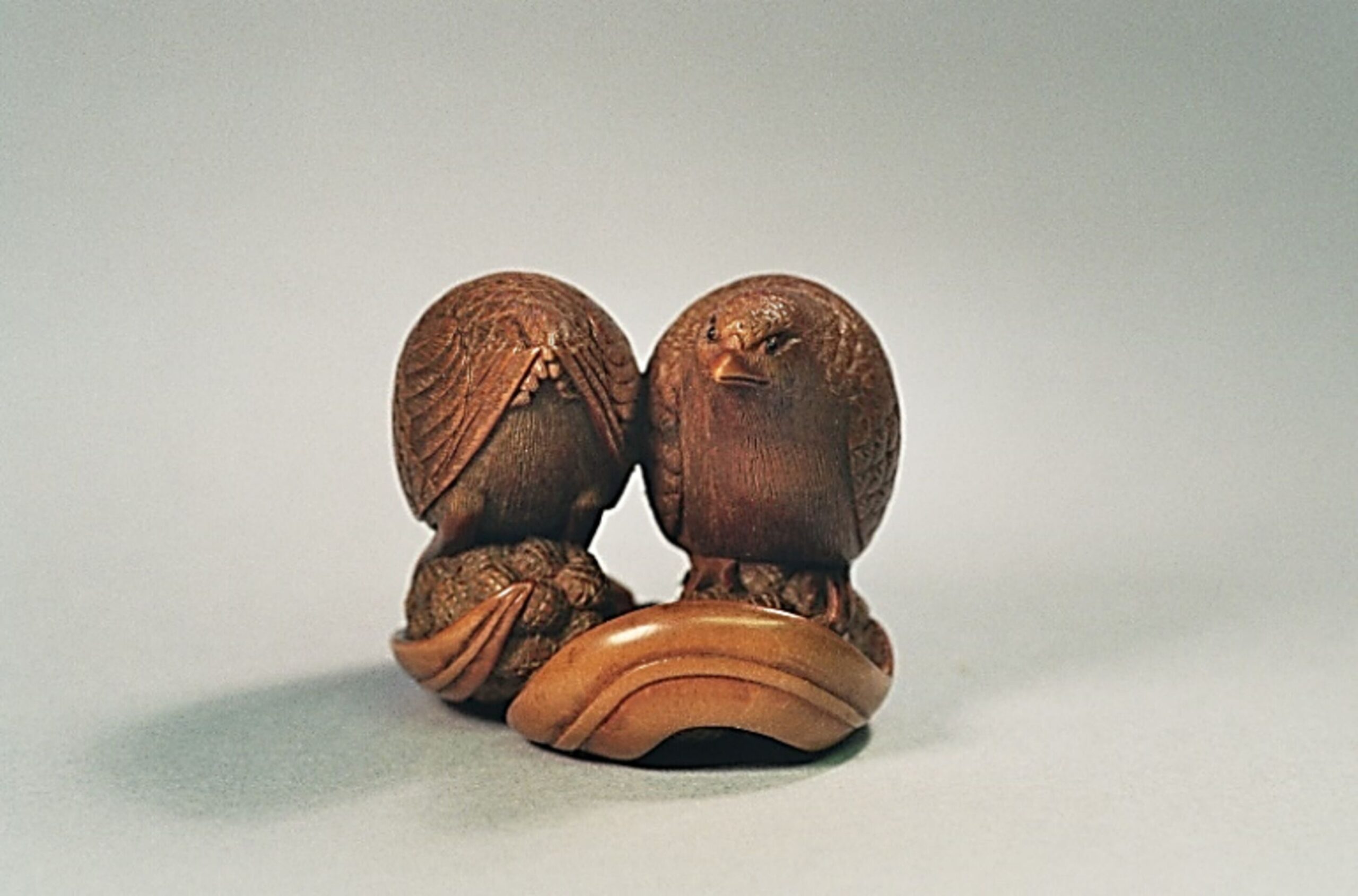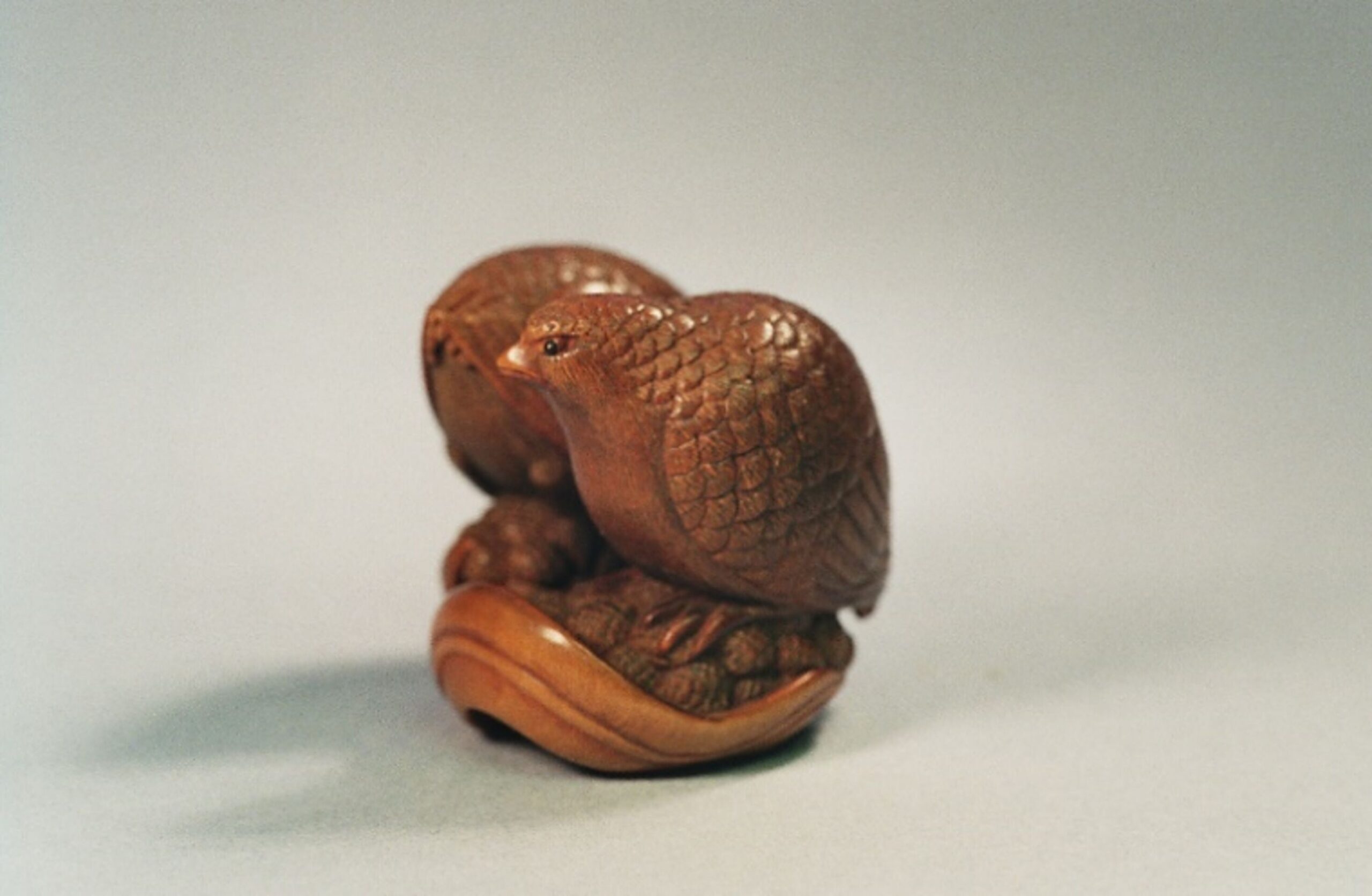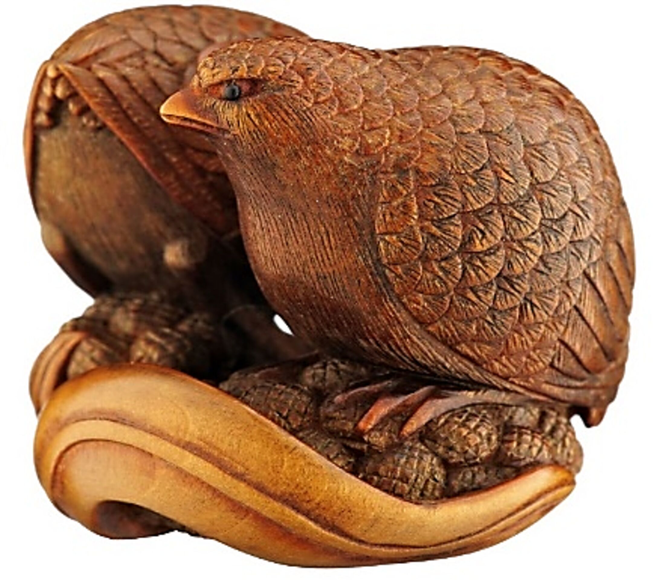 Holz Katabori. 2 Wachteln stehen/kauern gegensinnig auf Hirsekörnern, die mit Hirseblättern unterlegt sind. Das eine Tier schaut – wie Wachteln eben schauen – scheinbar missmutig um sich, während das andere geduckt an der Hirse pickt. Alle Details sind äusserst sorgfältig und fein ausgeführt. Die Blätter sind stark dreidimensional gekrümmt, was dem Stück auch etwas Schwungvolles gibt. „Natürliche“ Himotoshi durch Öffnungen an der Unterseite. Unterseitig auf einem der Blätter in einer viereckigen Kartusche die Signatur OKATOMO (K290, K179). Grösste Länge 41mm. Ein hervorragendes Stück.