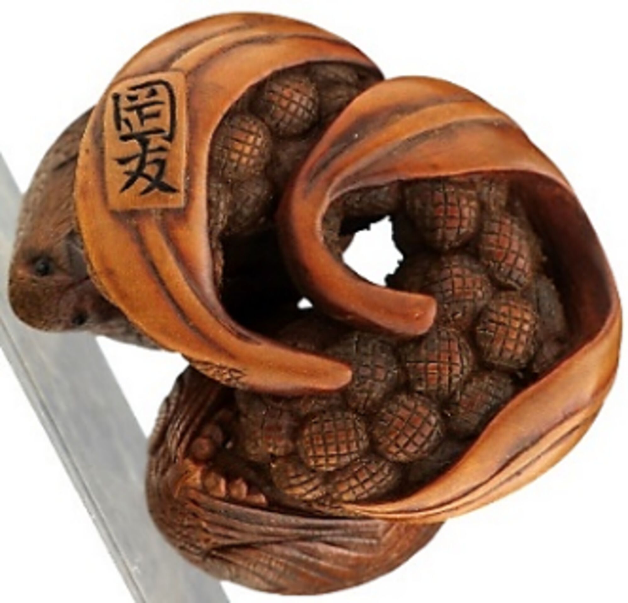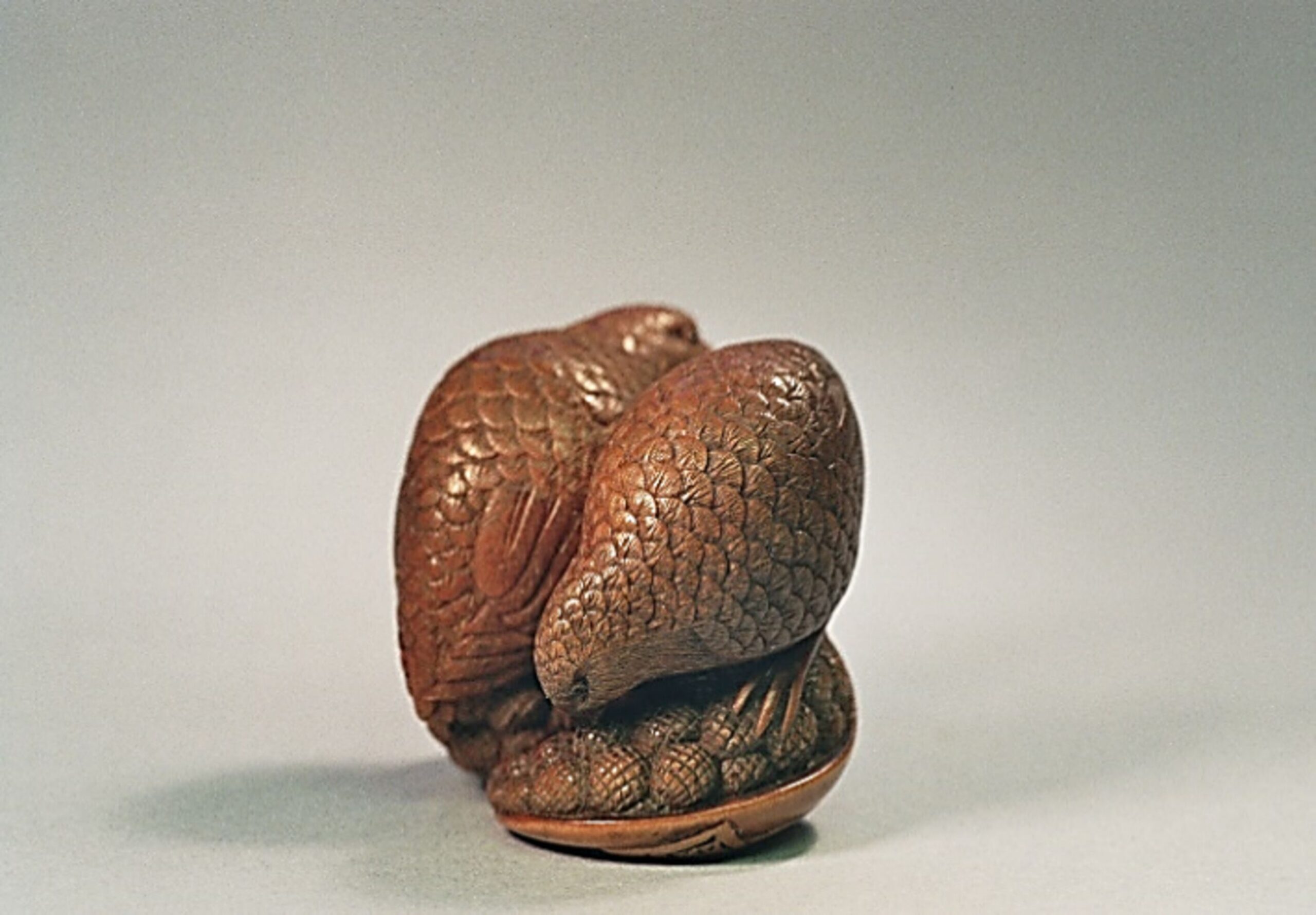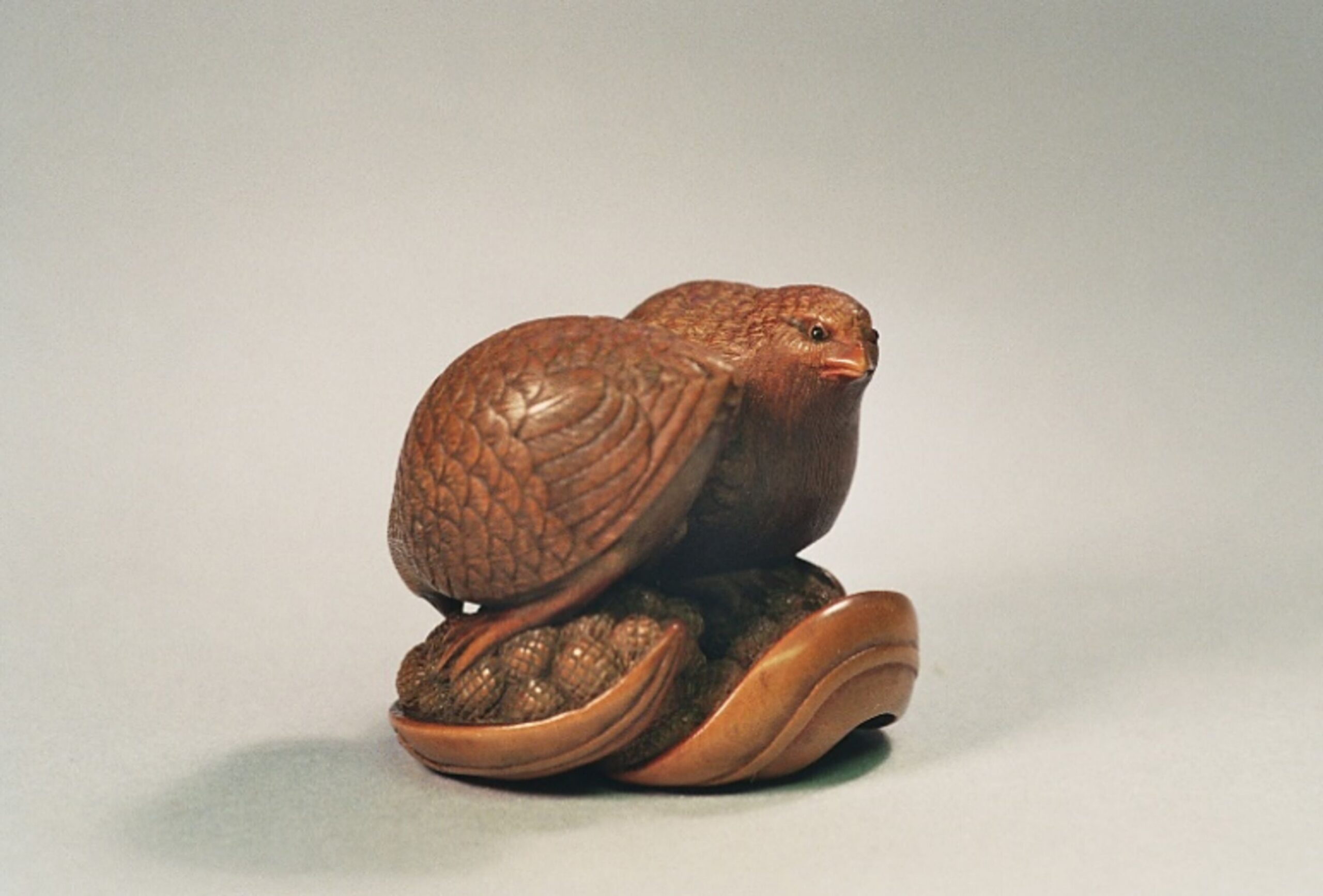 Holz Katabori. 2 Wachteln stehen/kauern gegensinnig auf Hirsekörnern, die mit Hirseblättern unterlegt sind. Das eine Tier schaut – wie Wachteln eben schauen – scheinbar missmutig um sich, während das andere geduckt an der Hirse pickt. Alle Details sind äusserst sorgfältig und fein ausgeführt. Die Blätter sind stark dreidimensional gekrümmt, was dem Stück auch etwas Schwungvolles gibt. „Natürliche“ Himotoshi durch Öffnungen an der Unterseite. Unterseitig auf einem der Blätter in einer viereckigen Kartusche die Signatur OKATOMO (K290, K179). Grösste Länge 41mm. Ein hervorragendes Stück.