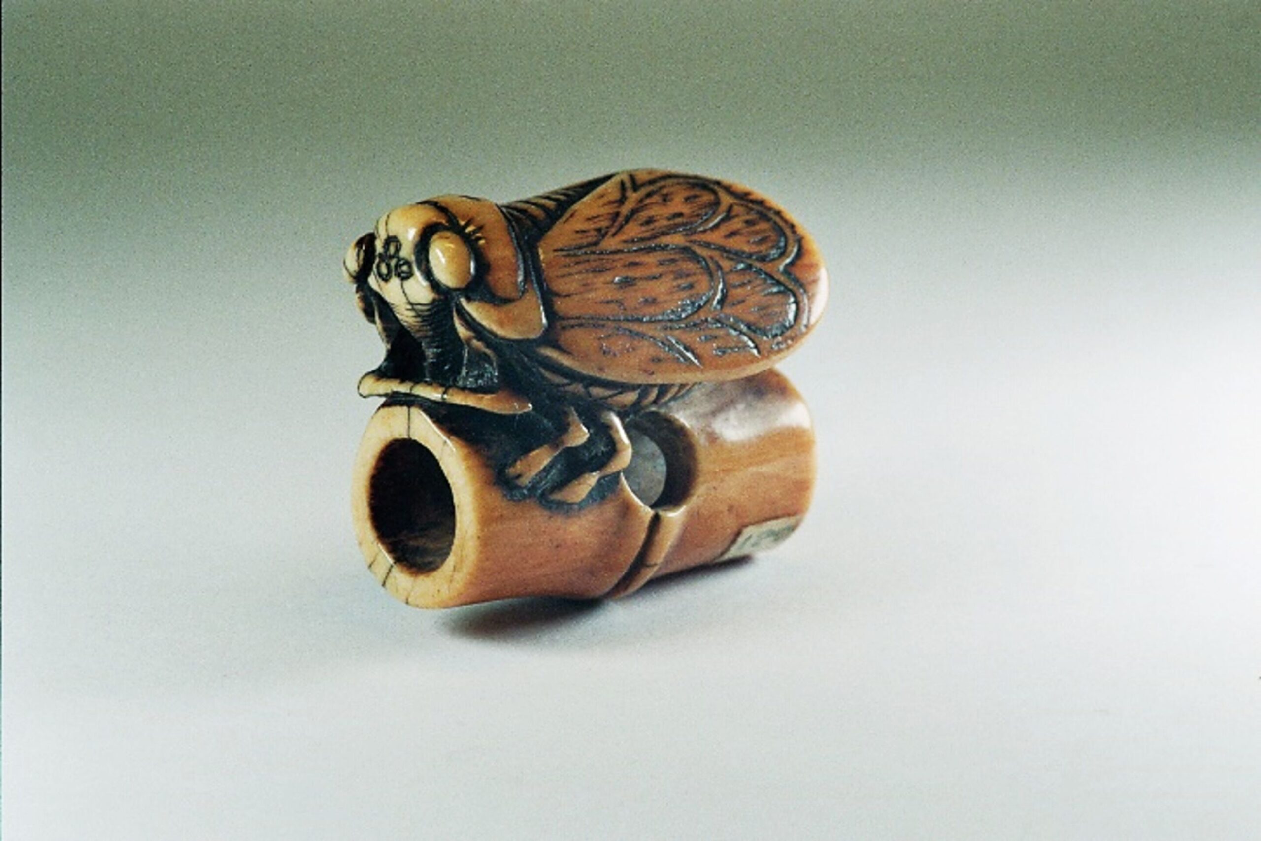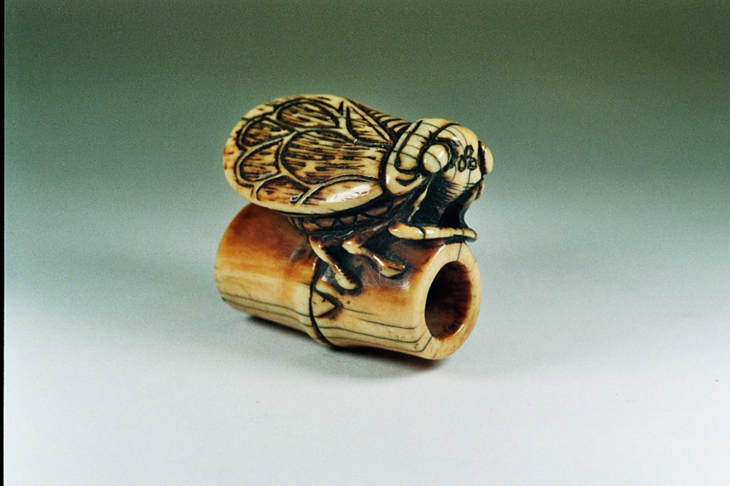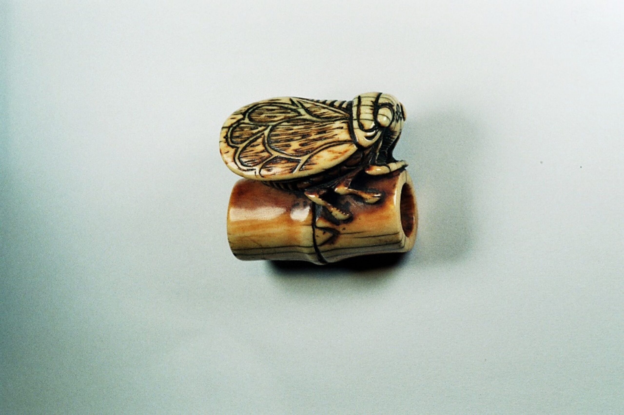Elfenbein-Katabori. Anders als die meisten schlanken Zikadendarstellungen ist diese rundlich und kurz gearbeitet. Dadurch hat sie etwas Gemütliches. Das Tier sitzt auf einem Stück Bambusrohr. Zusätzlich zu den beiden Öffnungen vorn und hinten findet sich auf der linken Seite noch eine Schnuröffnung Himotoshi. Links hinten unten auf einem kleinen Stück Papier eine alte Sammlernummer „128“. Schöne goldgelbe Patina, etliche feine Alterssprünge. Nicht signiert. Länge 32mm, Höhe 28mm, Breite 22mm. Alter: 18.Jh.