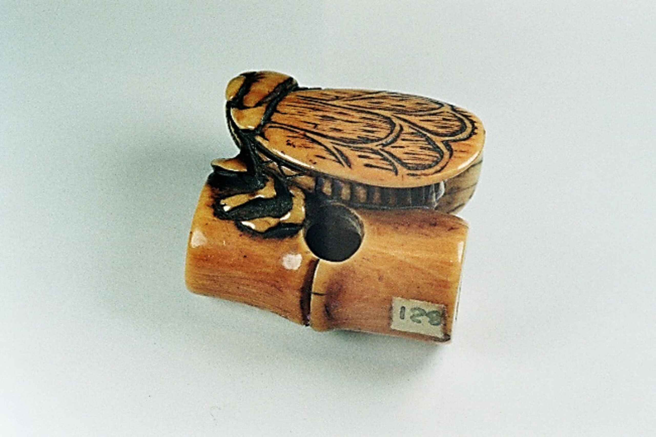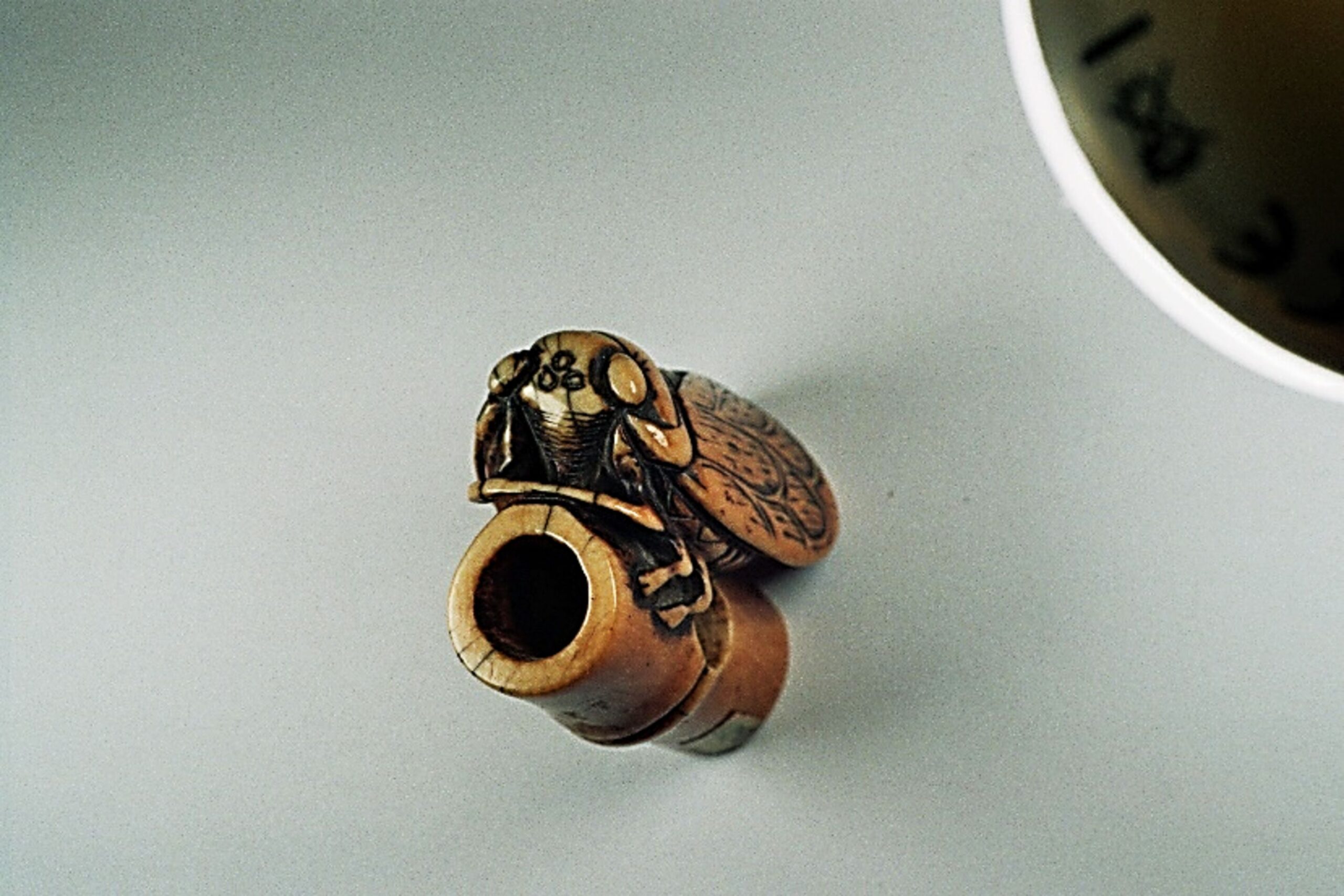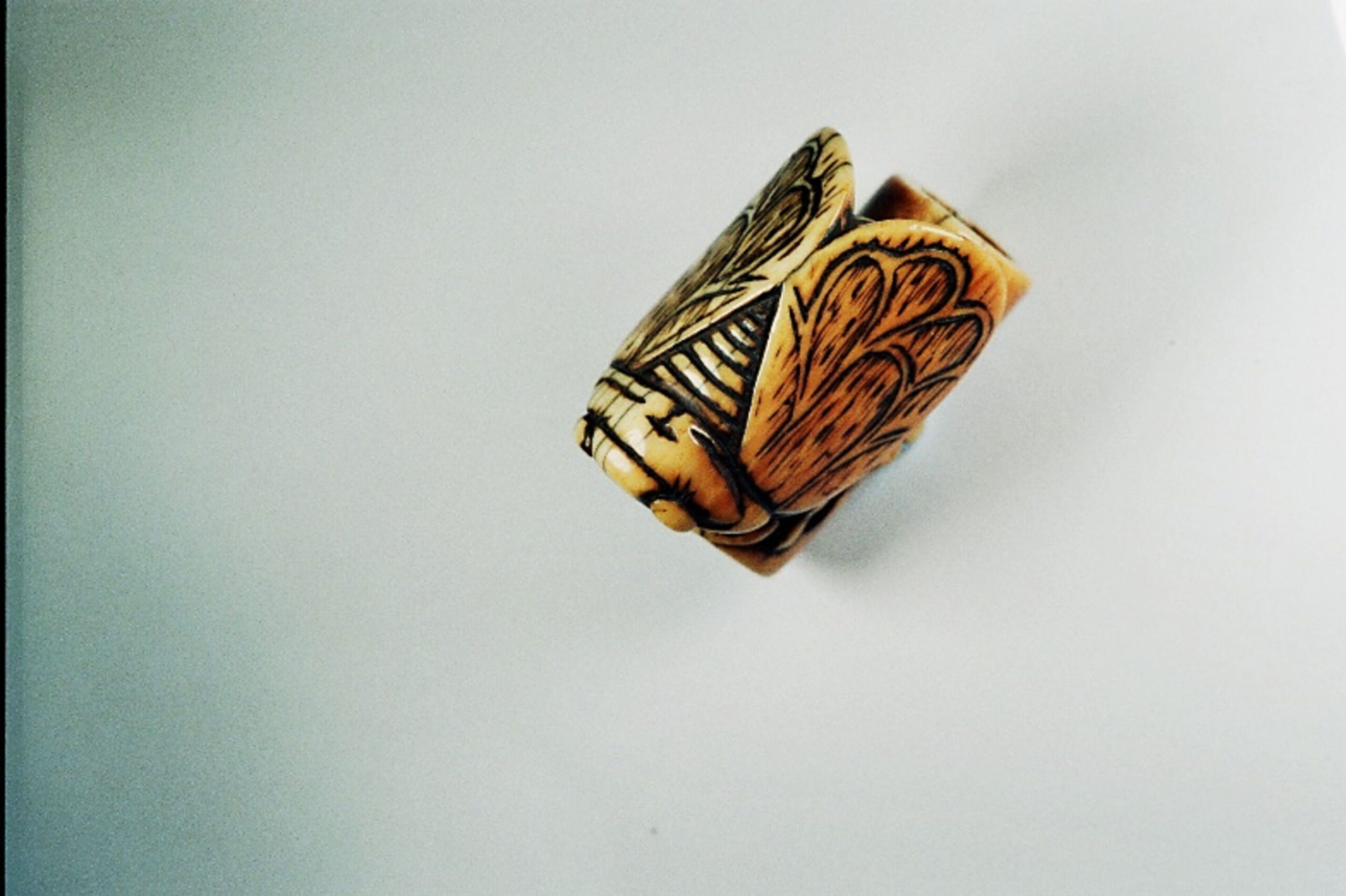Elfenbein-Katabori. Anders als die meisten schlanken Zikadendarstellungen ist diese rundlich und kurz gearbeitet. Dadurch hat sie etwas Gemütliches. Das Tier sitzt auf einem Stück Bambusrohr. Zusätzlich zu den beiden Öffnungen vorn und hinten findet sich auf der linken Seite noch eine Schnuröffnung Himotoshi. Links hinten unten auf einem kleinen Stück Papier eine alte Sammlernummer „128“. Schöne goldgelbe Patina, etliche feine Alterssprünge. Nicht signiert. Länge 32mm, Höhe 28mm, Breite 22mm. Alter: 18.Jh.